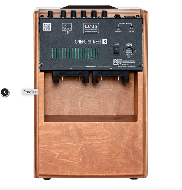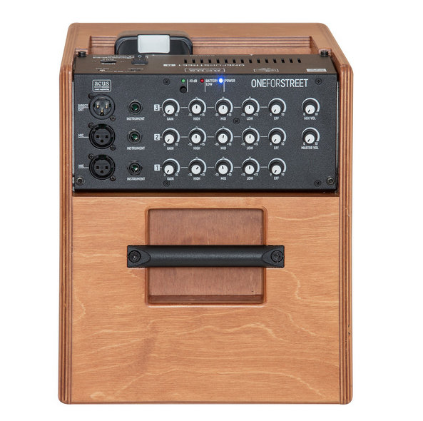 ONEFORSTREET 8 is a 90 Watt acoustic and classical guitar amplifier equipped with 2 separate inputs (channel 1: Microphone or Instrument input, channel 2: Instrument input) + an Aux input (which can be with 3.5mm stereo jack or with the Bluetooth Acus Artesia BT-1) equipped with independent volume. The 2 inputs are equipped with Gain / Volume, 3-band EQ and effect send.