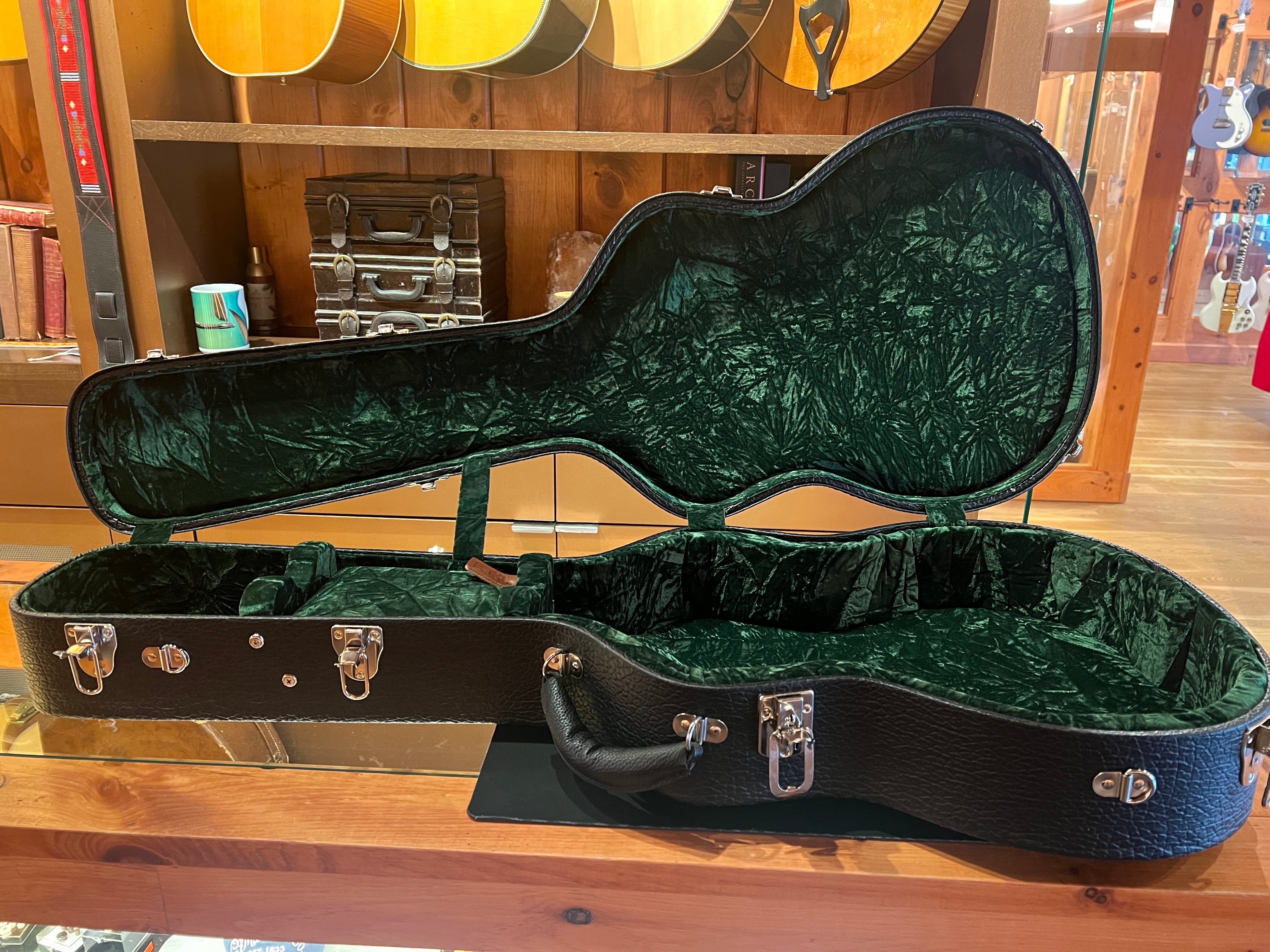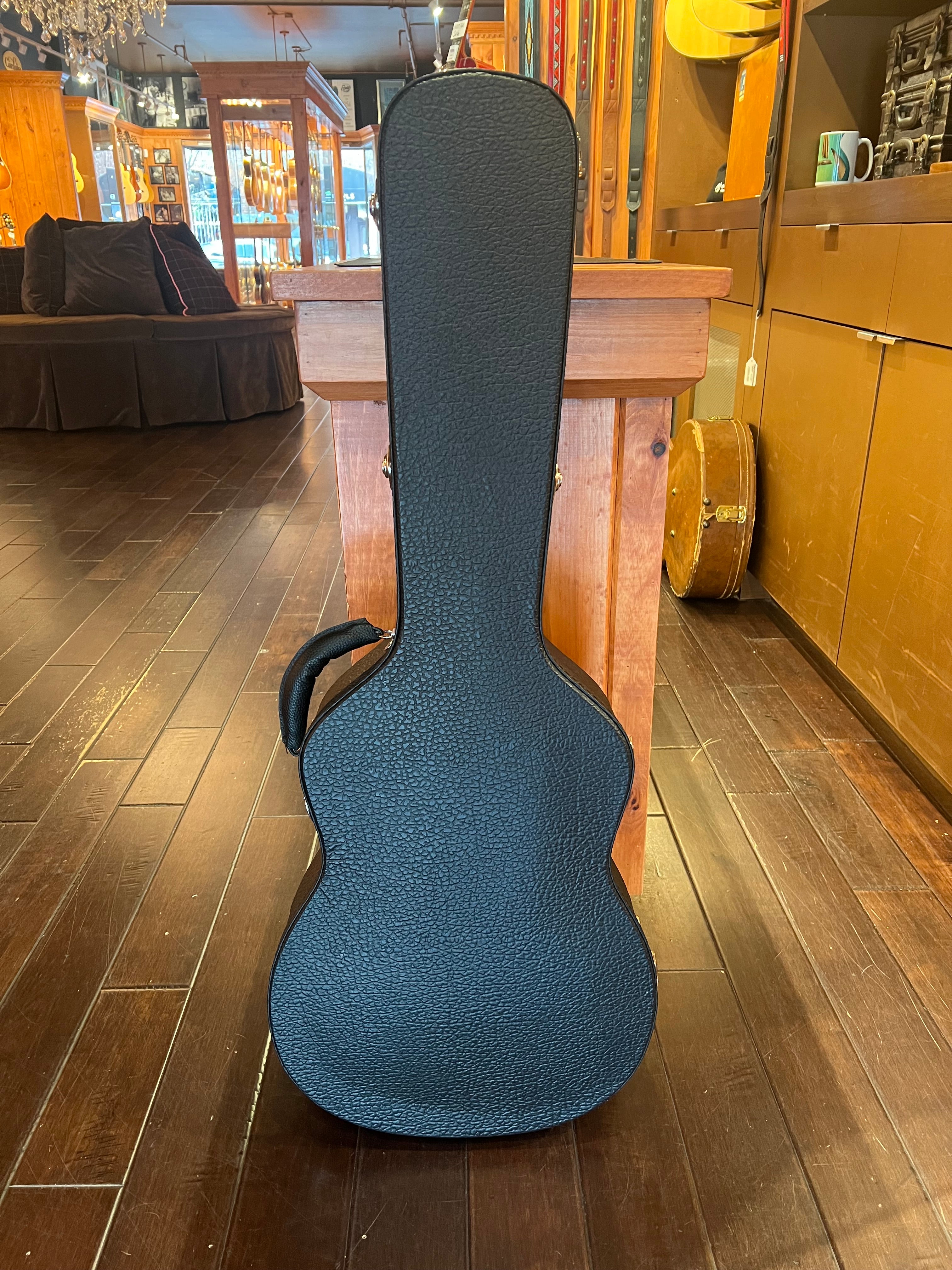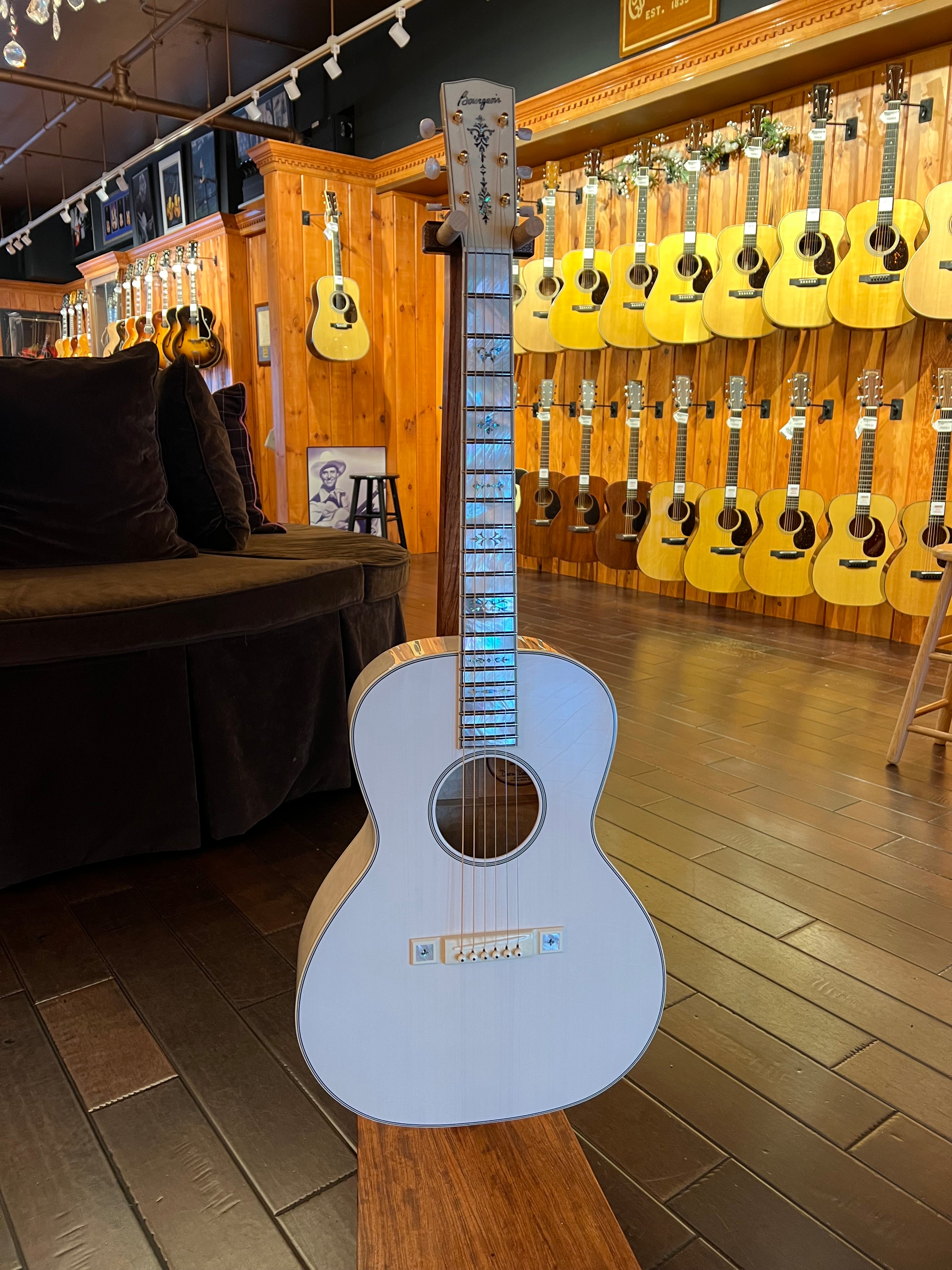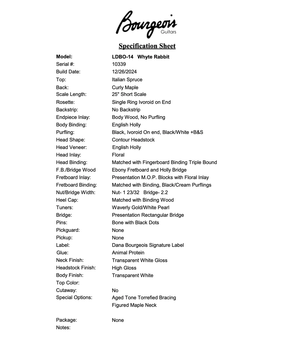 Rudy fell in love with this absolutely stunning guitar some years ago at the Woodstock Invitational Luthiers Showcase and has wanted one ever since. We waited over 2 years for this one to be ready from the time we ordered it… and boy, was it worth the wait! The first striking thing about this guitar is, of course, the milky-white transparent finish highlighted with Mother of Pearl inlays throughout. The real draw, though, is the tone: pairing an Italian spruce top with curly maple for the back and sides produces an incredible projection with bright, articulate tones; a powerful and focused sound from this relatively small body. It handles like butter, too. A beauty to behold, to hear and to play, the Bourgeois Whyte Rabbit is a very special instrument that doesn’t come around often. It would be the perfect addition to any guitar player or art enthusiast’s collection. Comes with a deluxe hardshell case.