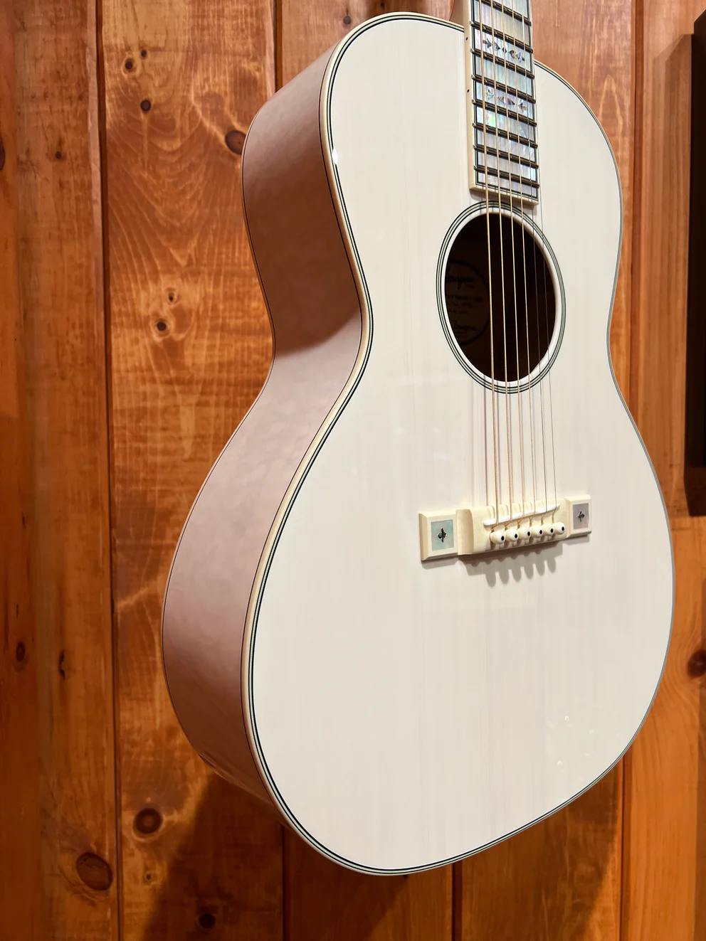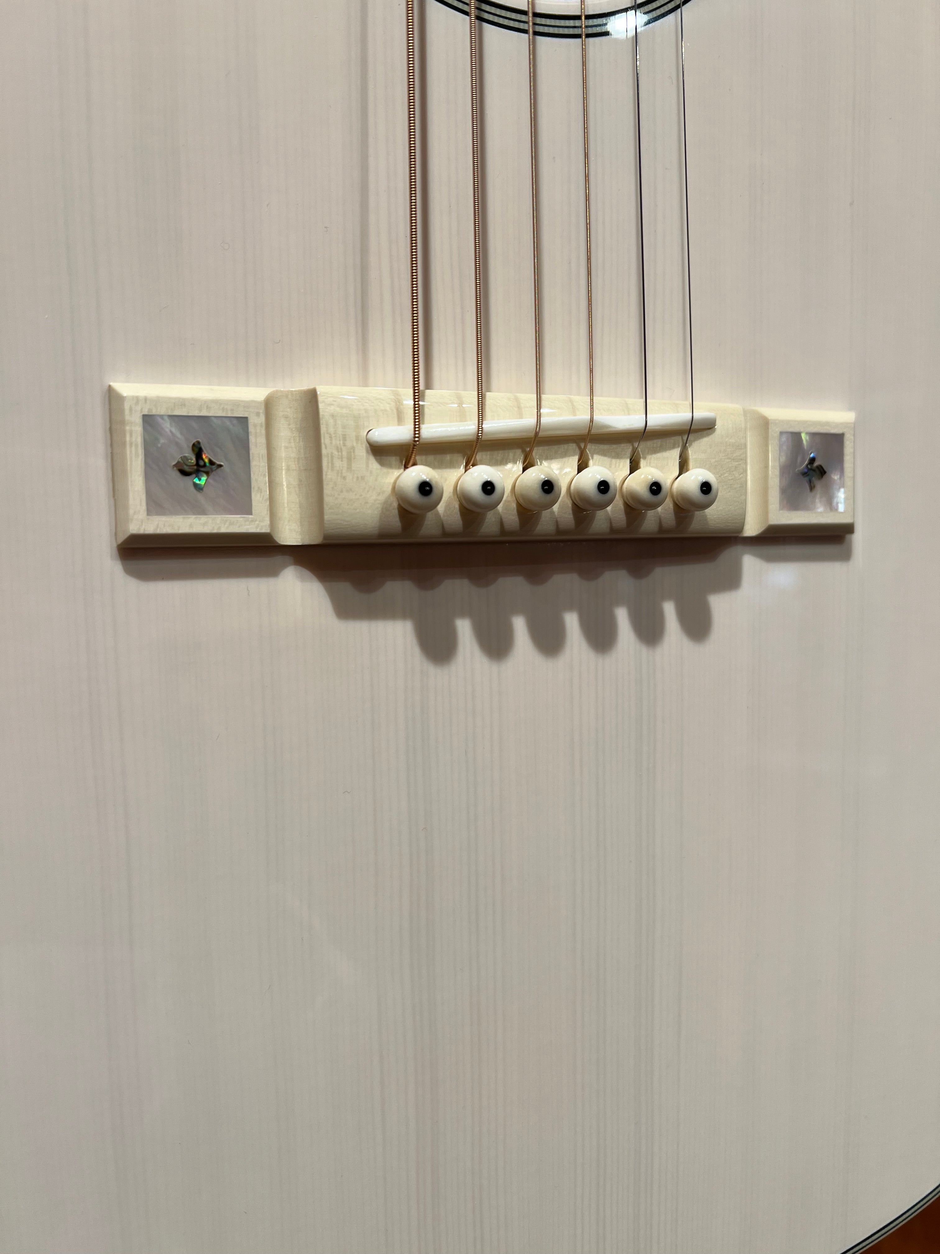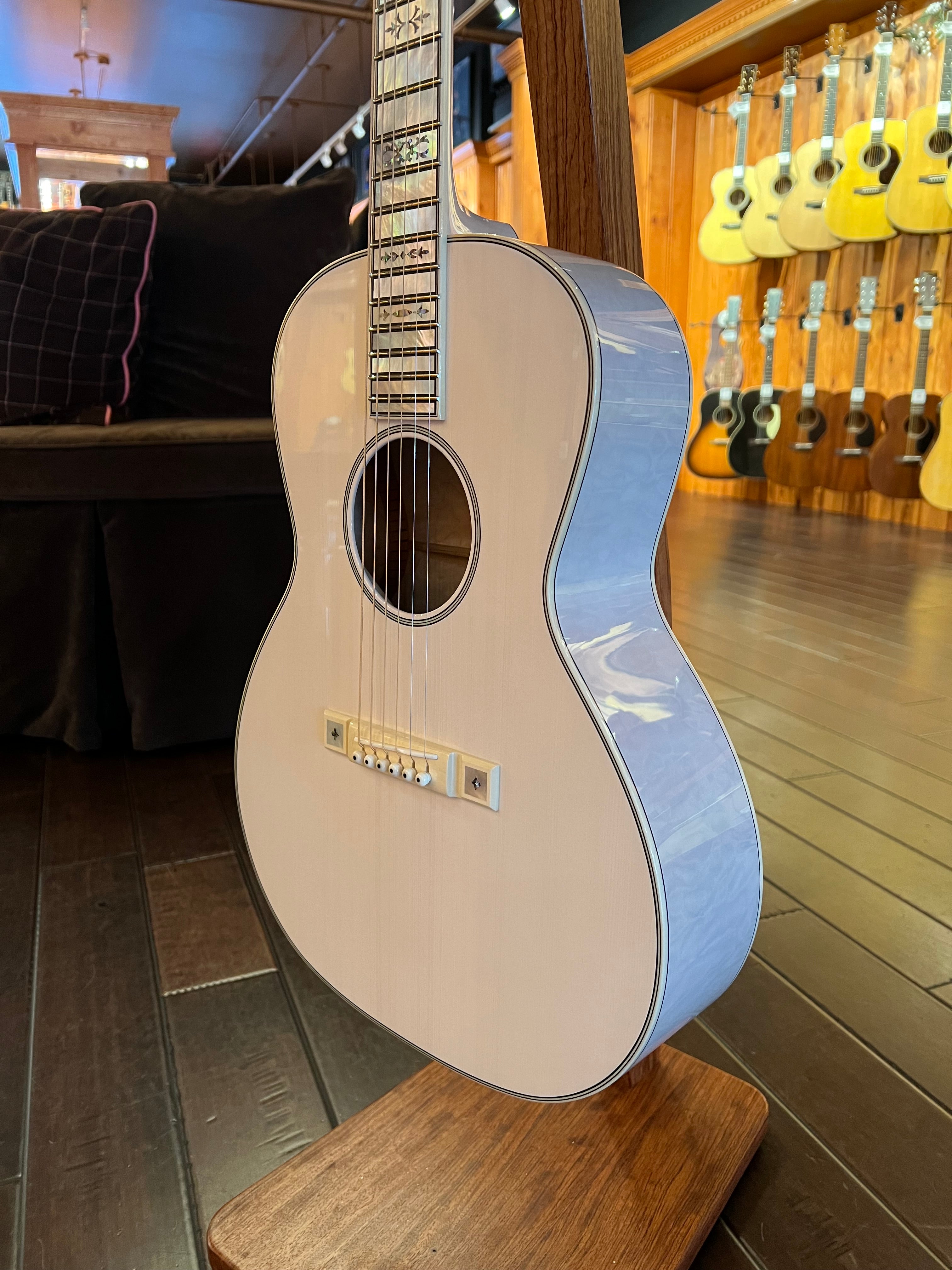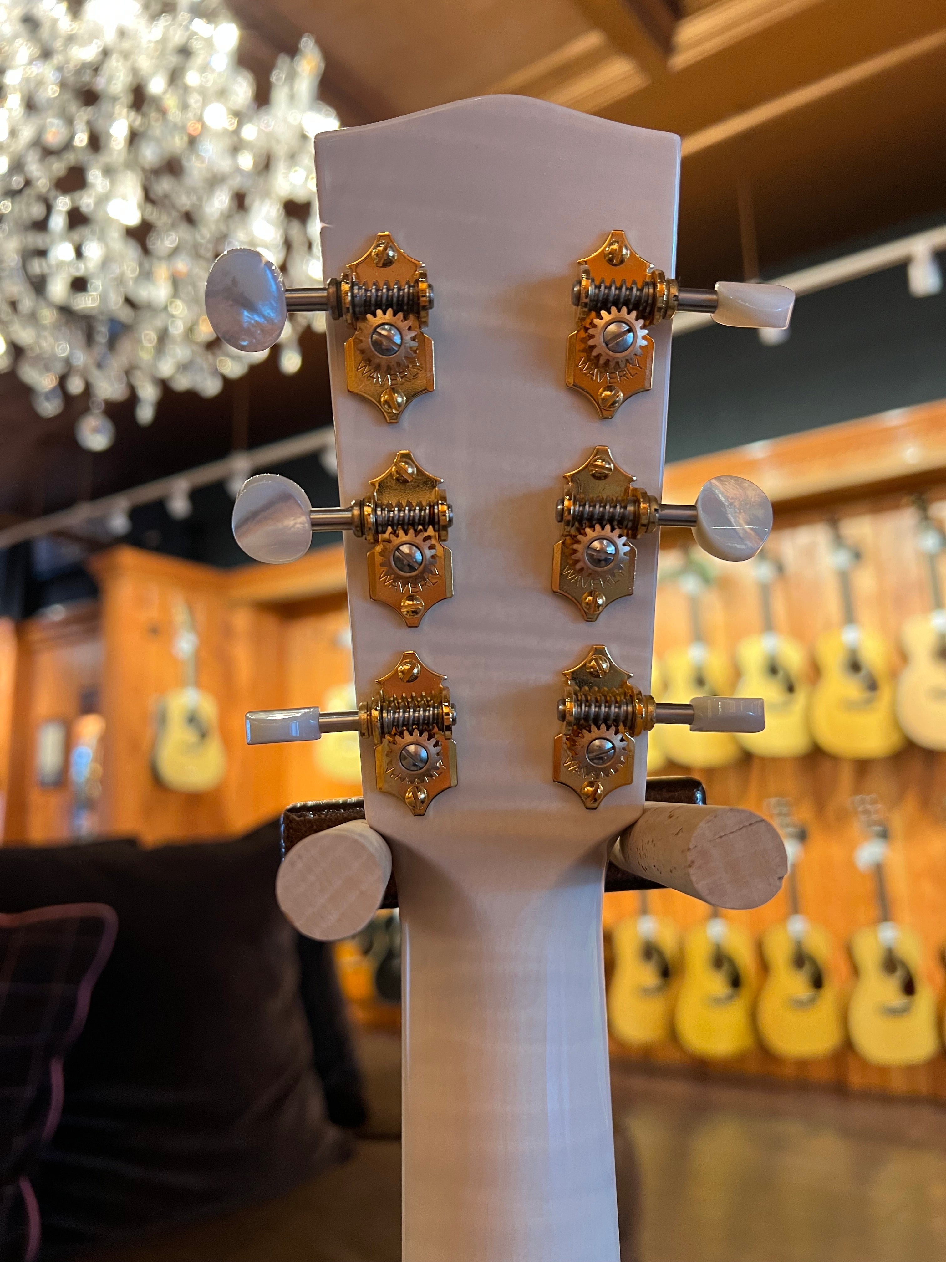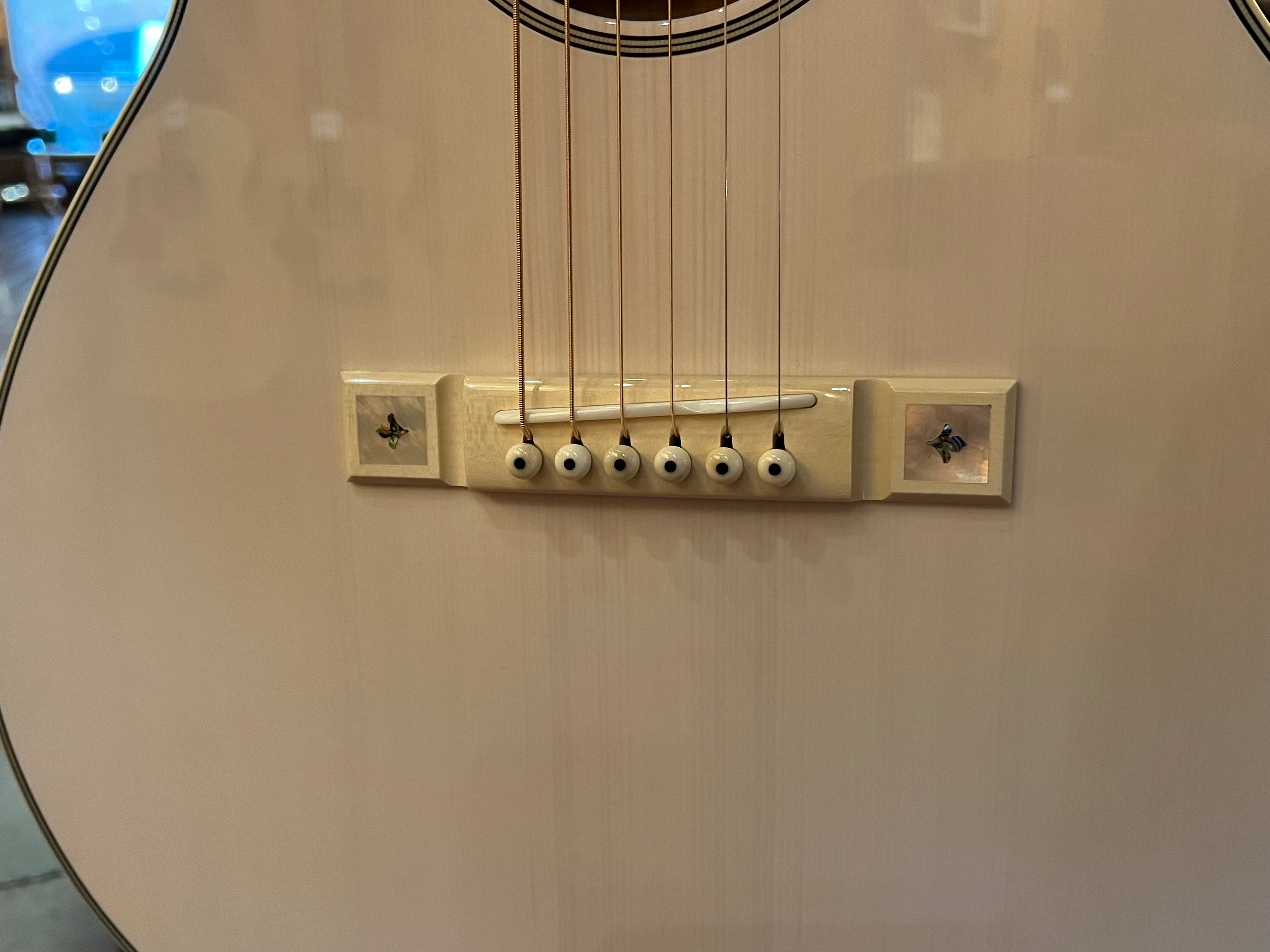“Several years ago Natalie Maines, of The Dixie Chicks, asked us to build her a white guitar. Unable to bear the thought of covering up wood grain, we ended up using a transparent white tint. Solid Mother of Pearl fretboard markers and tuner buttons ensure that this beauty won’t go unnoticed—even from the last row of the concert arena.