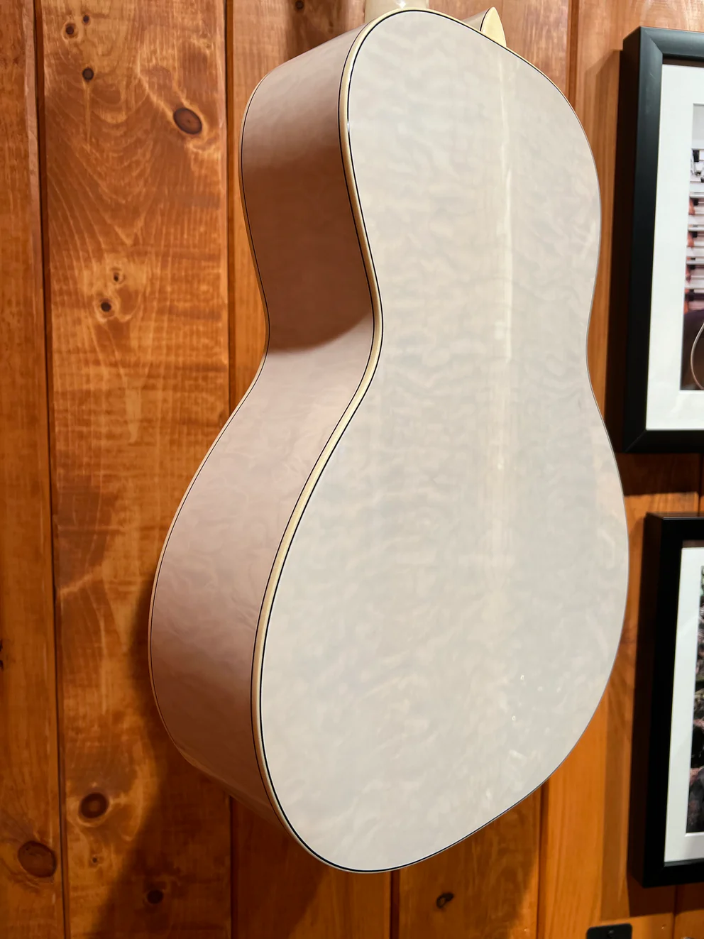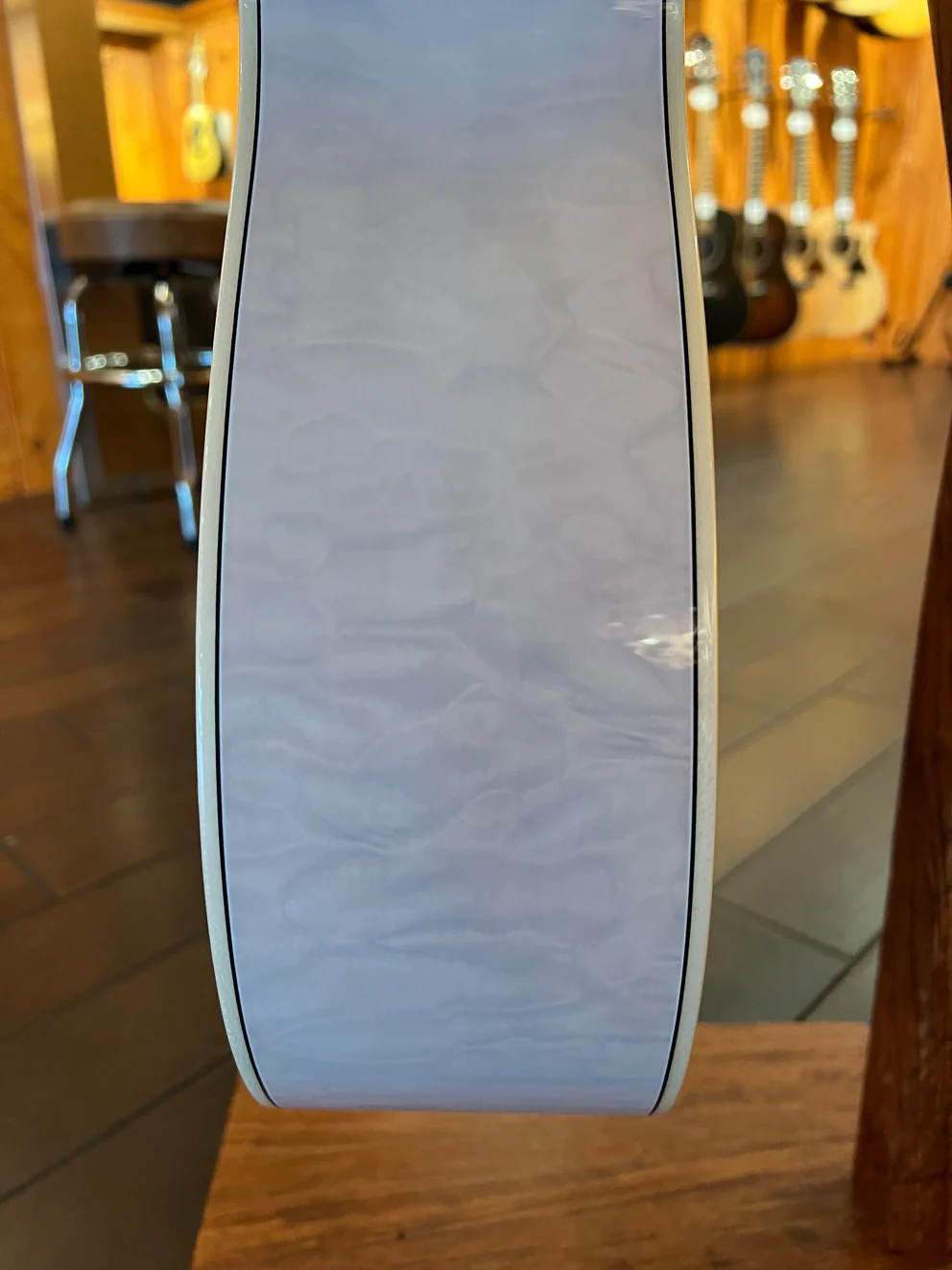 (We included a lot of photos in two different kinds of lighting; it’s tough to photograph this guitar in a way that shows off the gorgeous wood grains below the finish without getting a glare or reflection.)