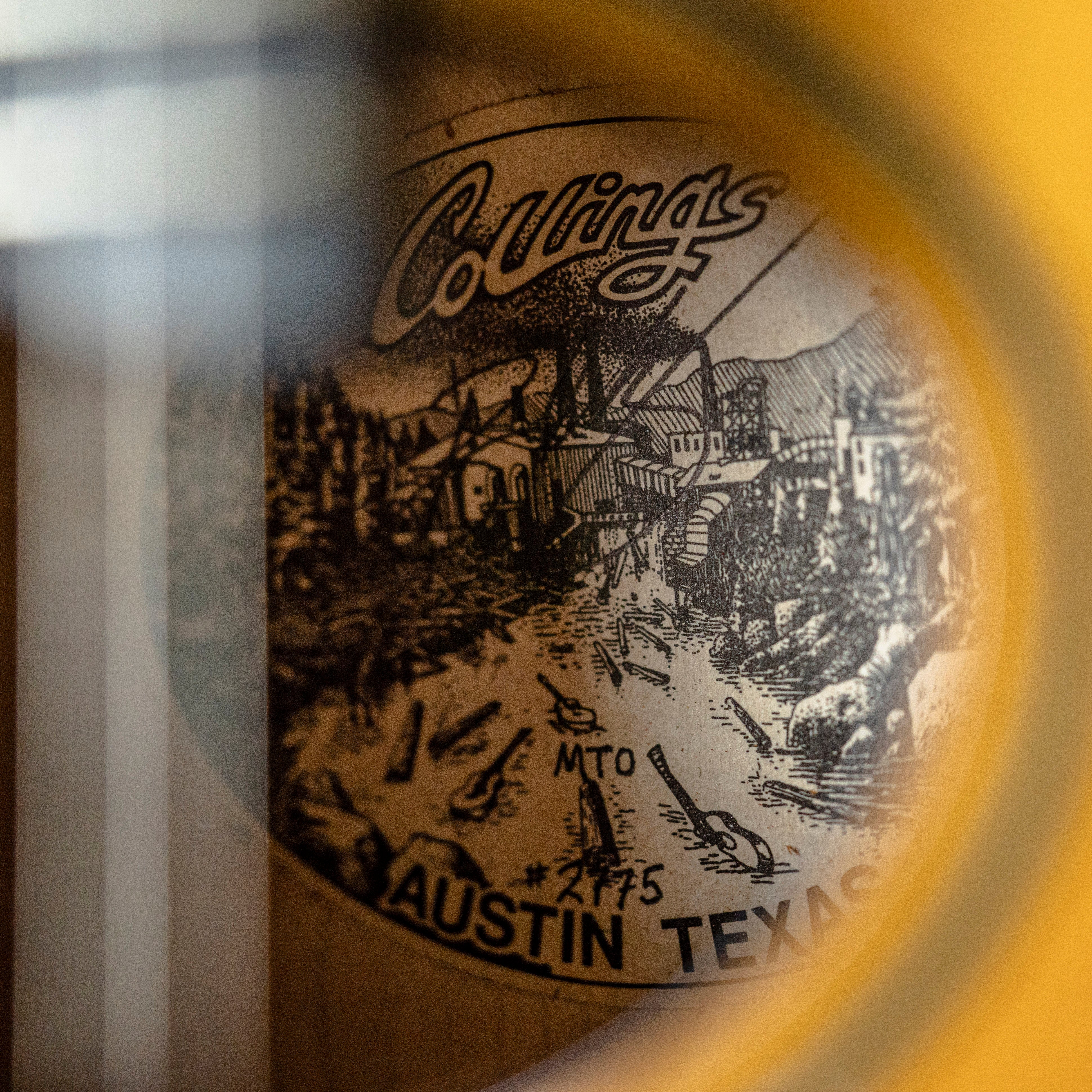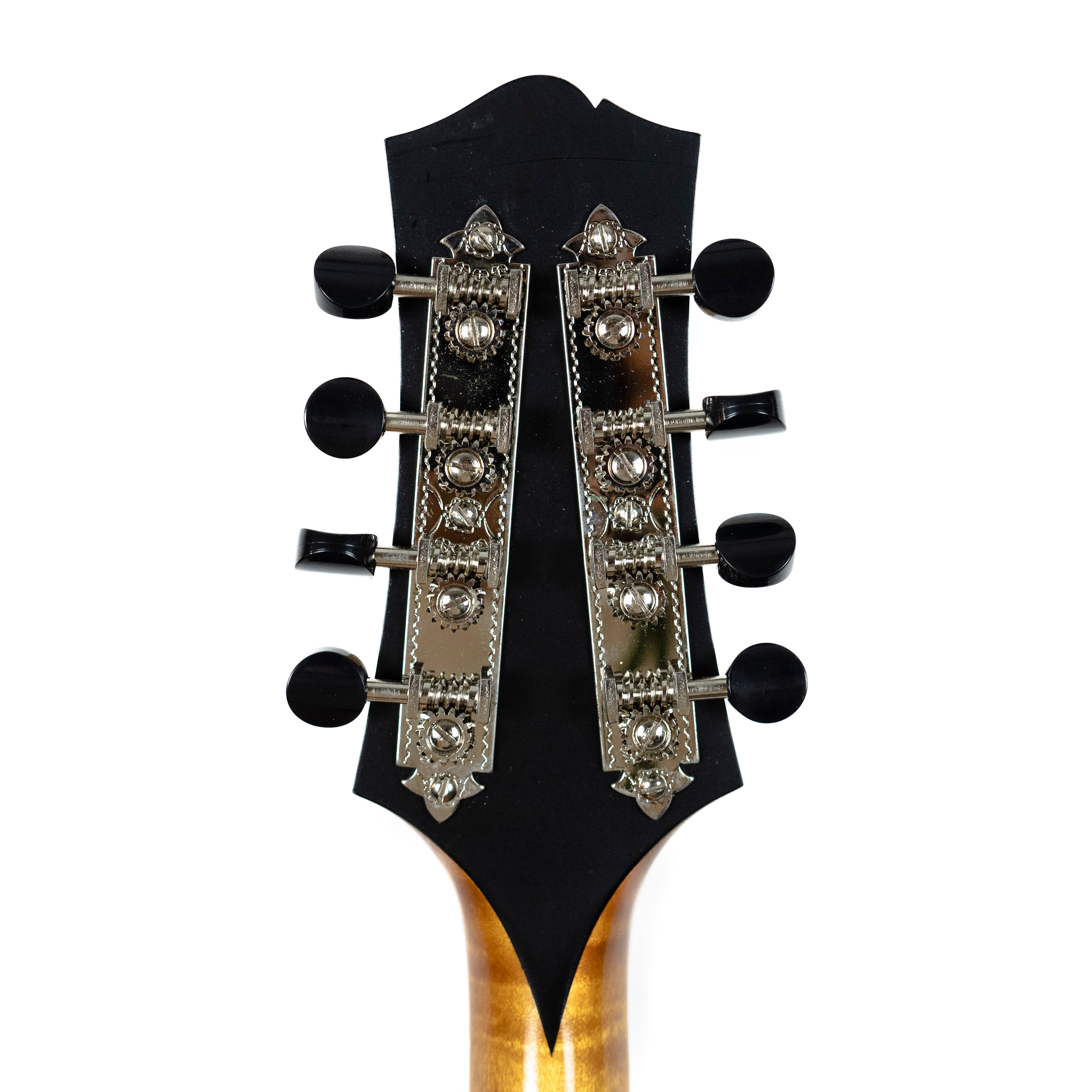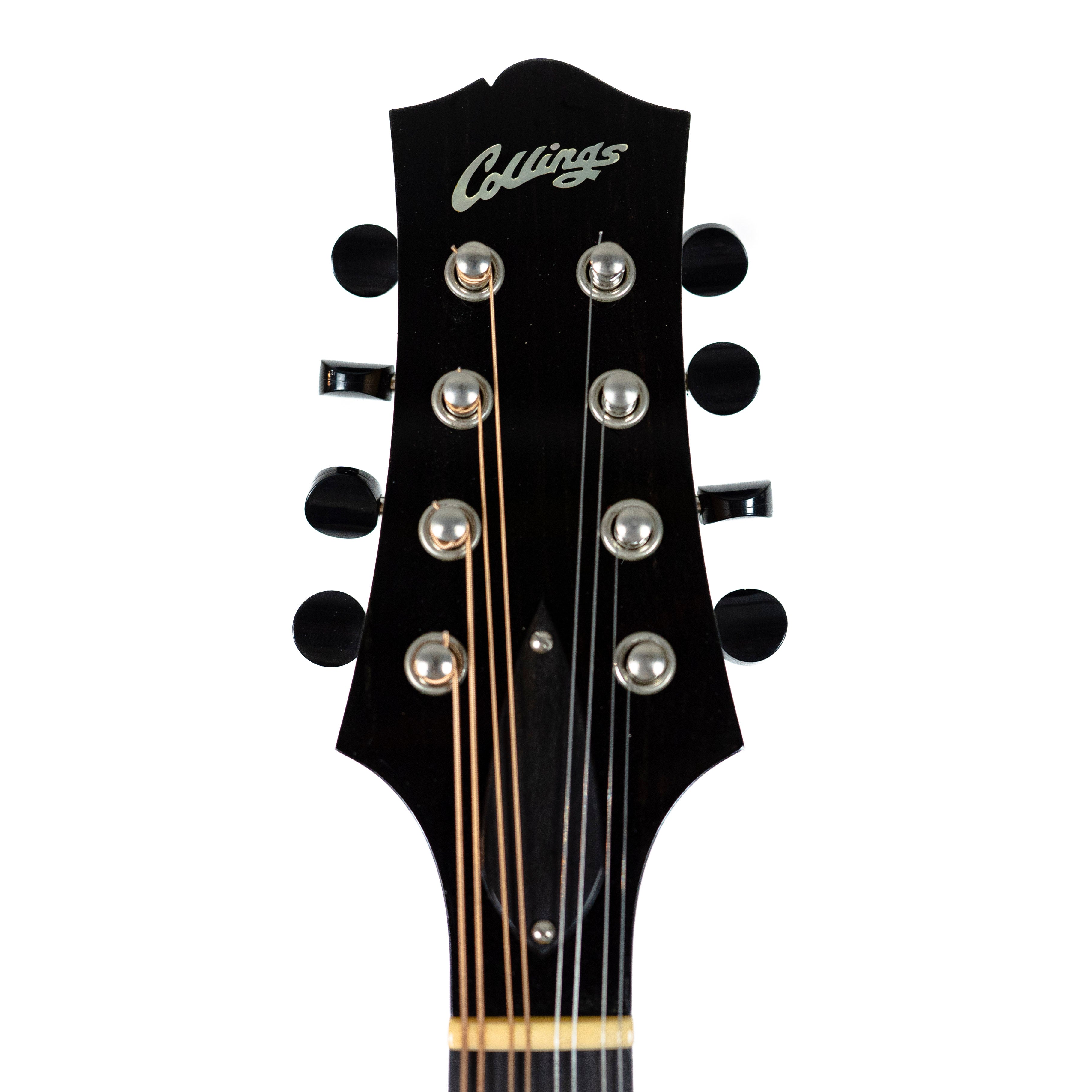 Also on this mandolin is a radiused ebony fretboard with pearl dot inlay, an ebony adjustable bridge, a Collings string through tailpiece, and nickel tuners with black buttons.