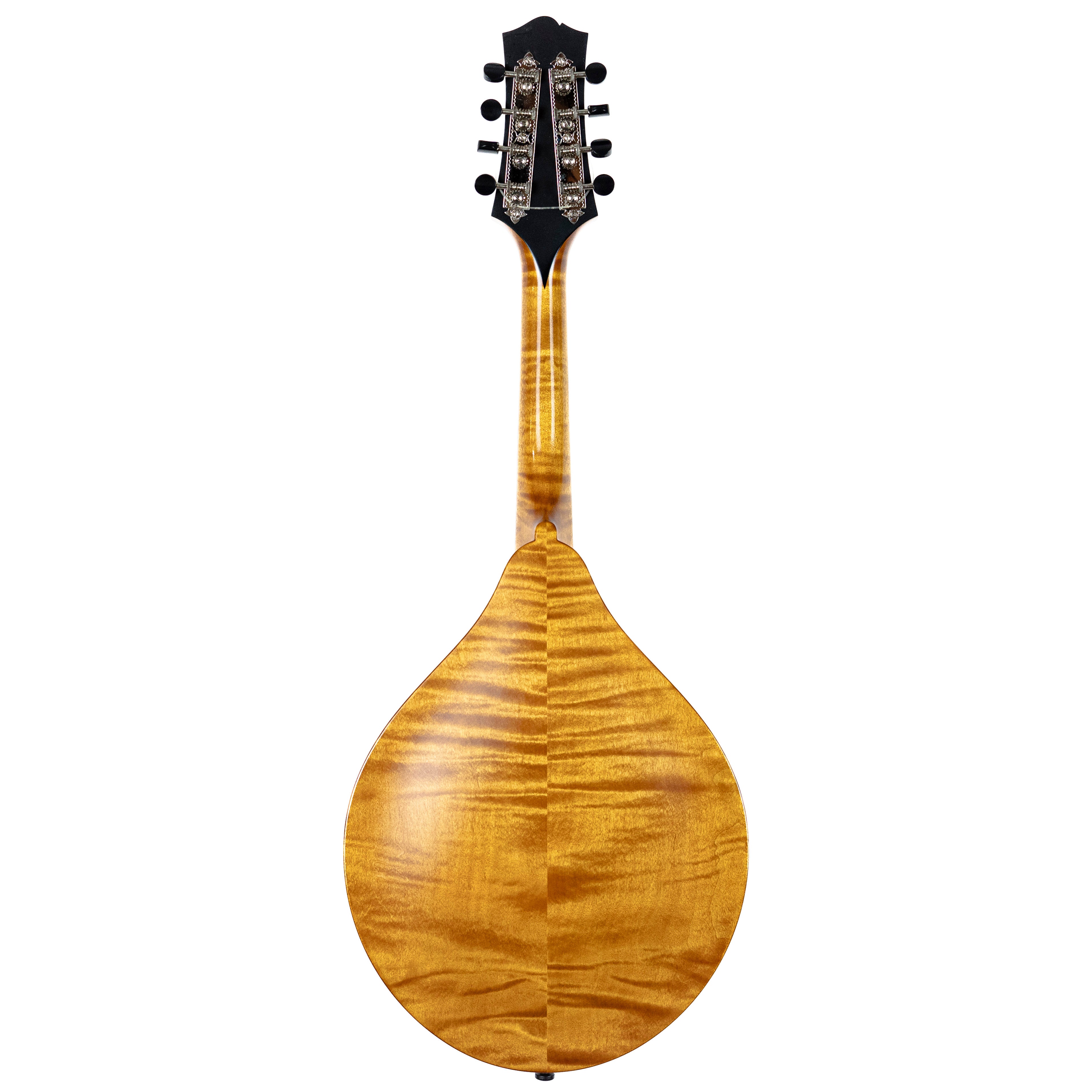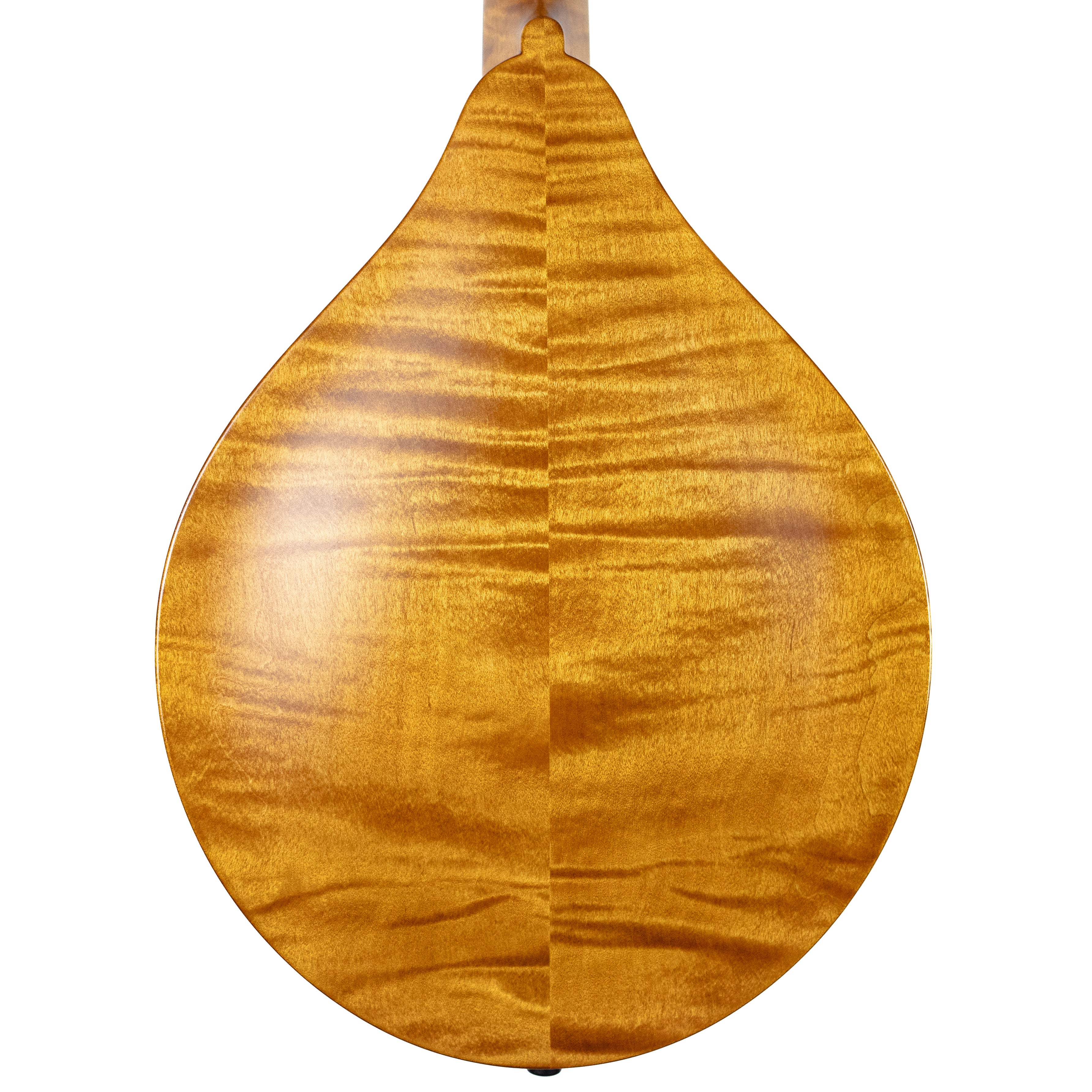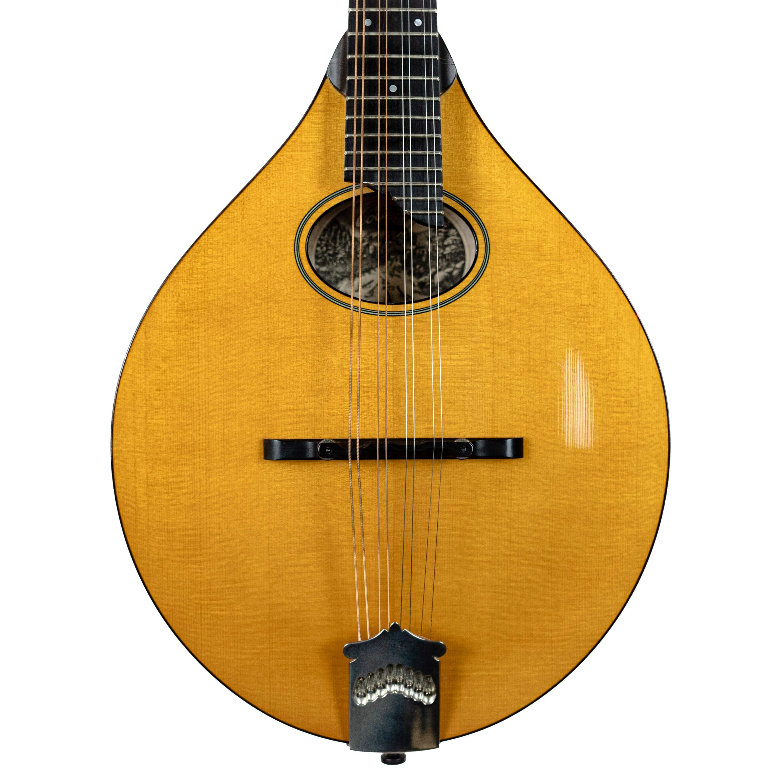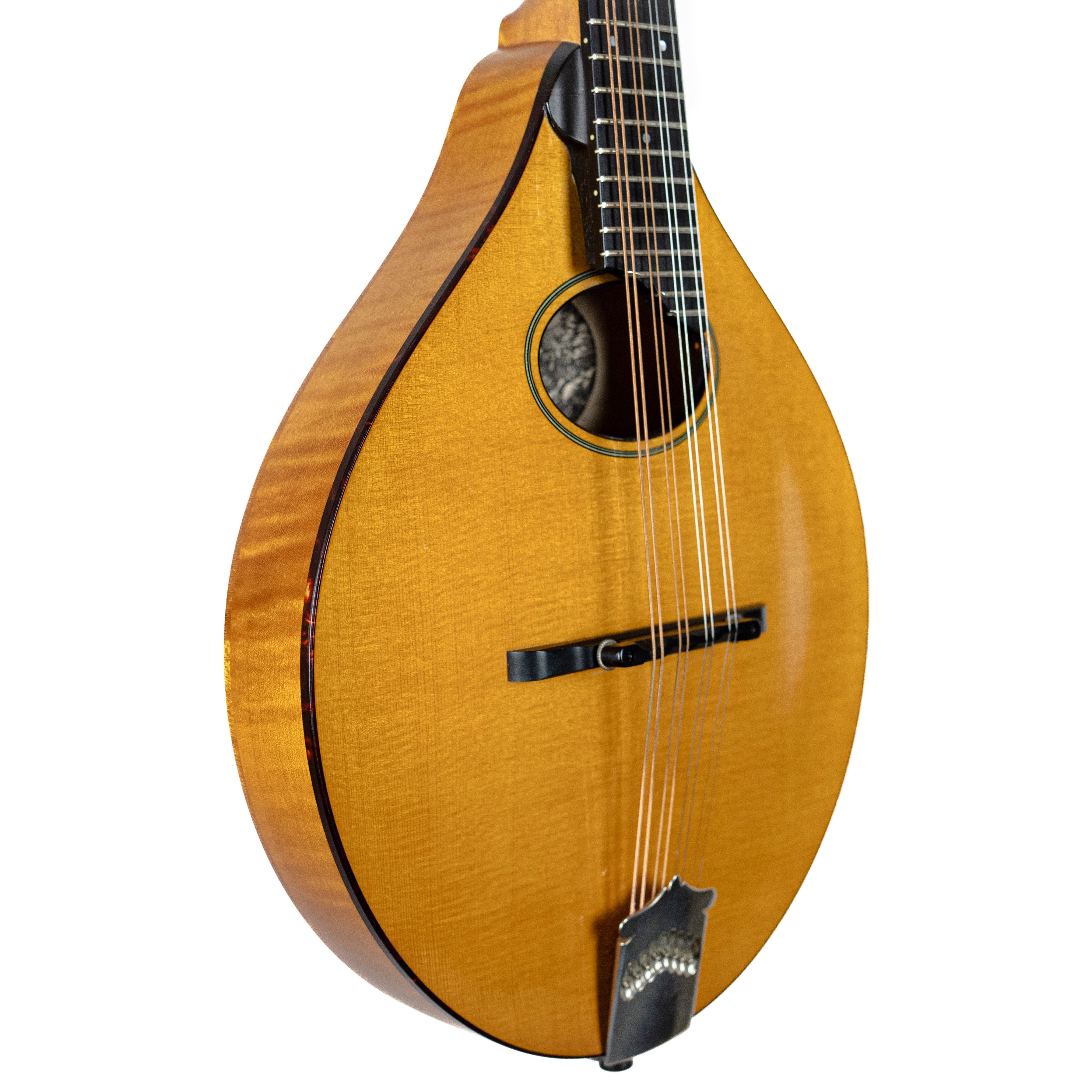 Also on this mandolin is a radiused ebony fretboard with pearl dot inlay, an ebony adjustable bridge, a Collings string through tailpiece, and nickel tuners with black buttons.