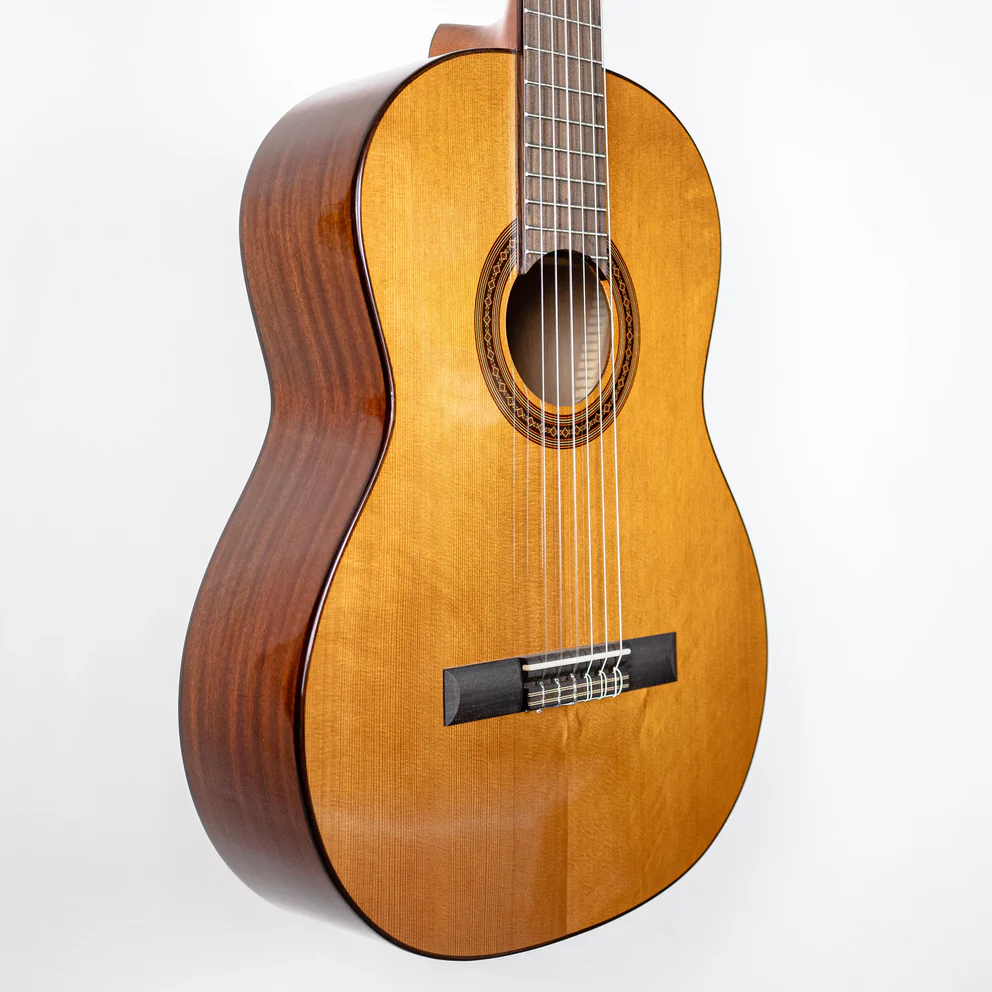 One of Cordoba’s flagship models, the C5 is perfect as a first nylon-string guitar, this lightweight model is built with a solid Cedar top and mahogany back and sides to produce a clear, powerful tone with beautiful sustain. Handmade in the traditional Spanish style, the C5’s carved headstock, hand-inlaid wood rosette, Pau Ferro binding, Savarez strings, and glossy PU finish result in a guitar that truly stands out from all other entry-level options. A lightweight adjustable truss rod is built into the neck for stability.