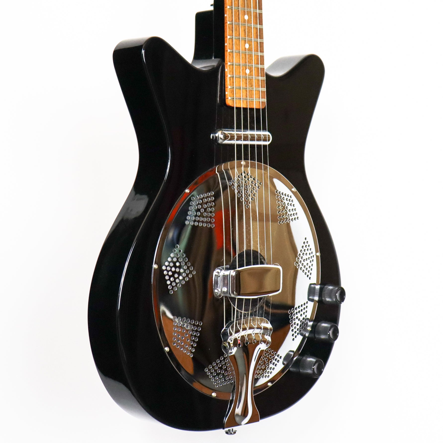 “The best sounding resonator guitar ever! Combines special design piezo in the cone with ‘56 Lipstick® pickup. Volume, tone, and pickup “blend” controls. Diamond plate cover for enhanced tone. Much higher piezo output than anything we have heard. You will dig!” Does not include a gig bag.
