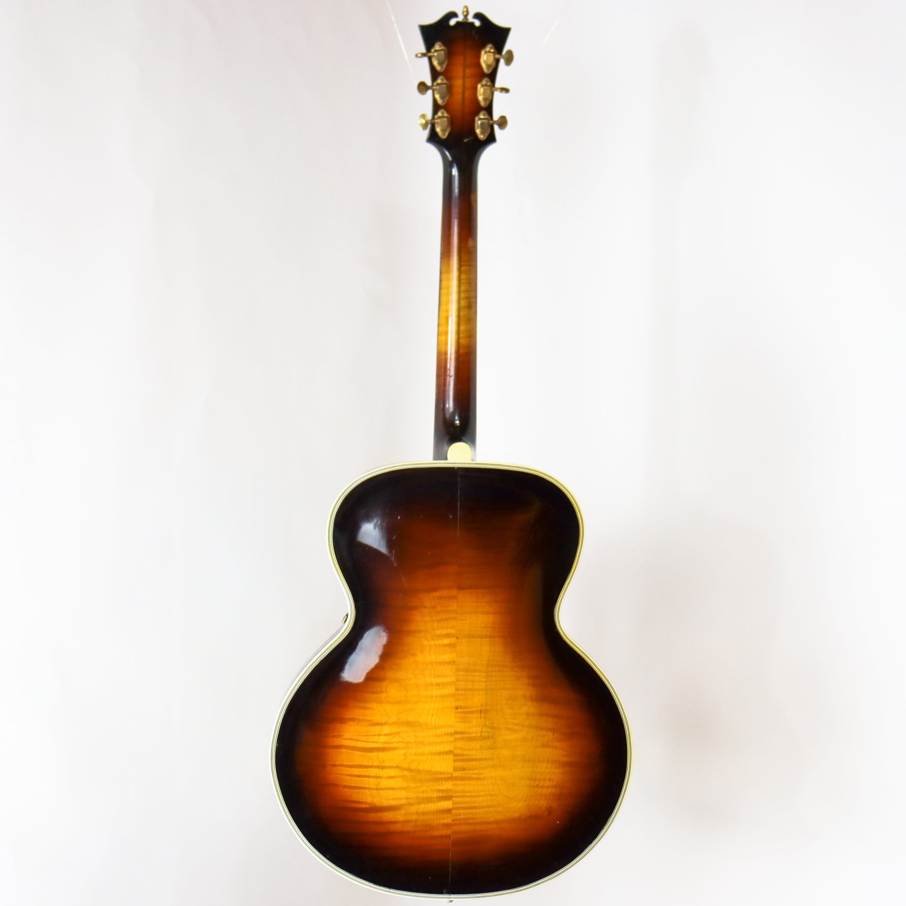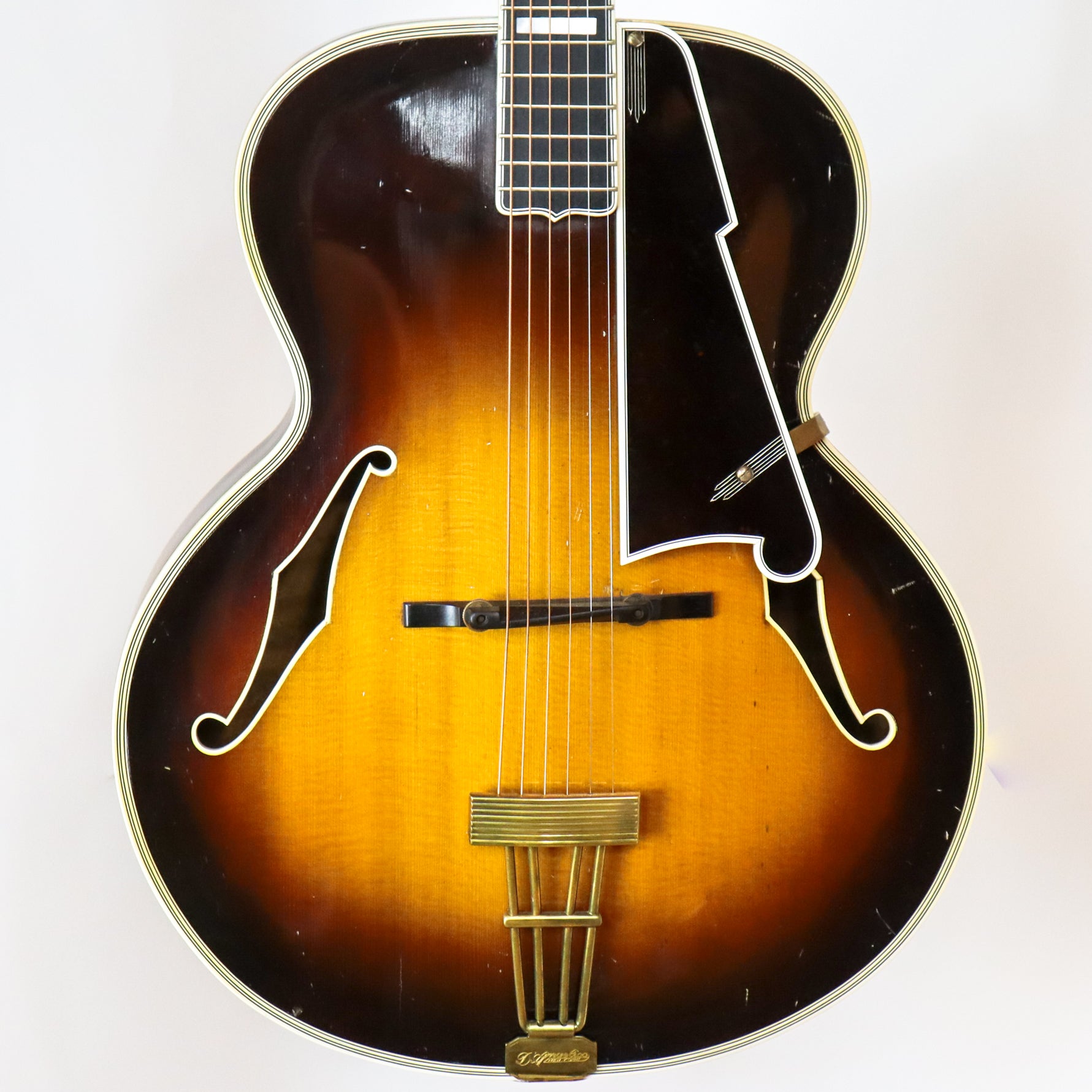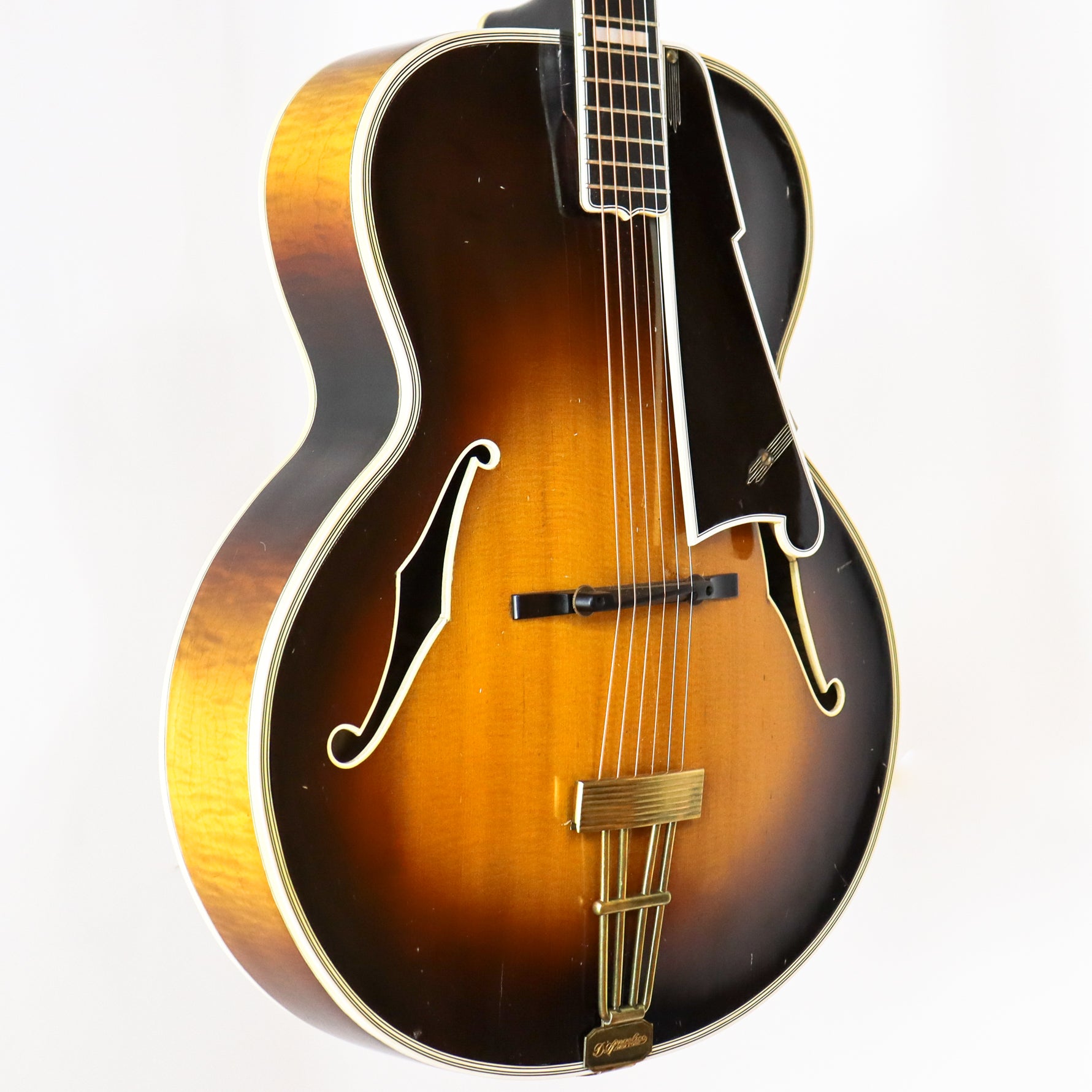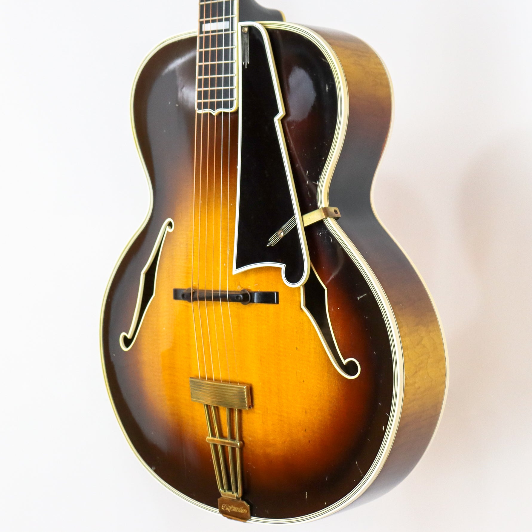 Like the later New Yorkers, the Excel features Art Deco stylings influenced by the New York City skyline, and is gorgeously appointed. This guitar features a solid spruce top, gorgeous flamed maple back and sides, and ebony appointments, along with gold hardware and a replacement celluloid pickguard. It has an incredible sunburst finish in thin vintage nitro. The guitar has a lower bout width of 17 inches. According to D’Angelico’s ledger, it was completed on 11/13/39 and was originally made for Silver & Horland Musical Instruments, a legendary, long-standing retailer on Park Row in New York City. (Silver & Horland finally ended up on W 48th Street – NYC’s Music Row – along with the original Rudy’s Music store location.)