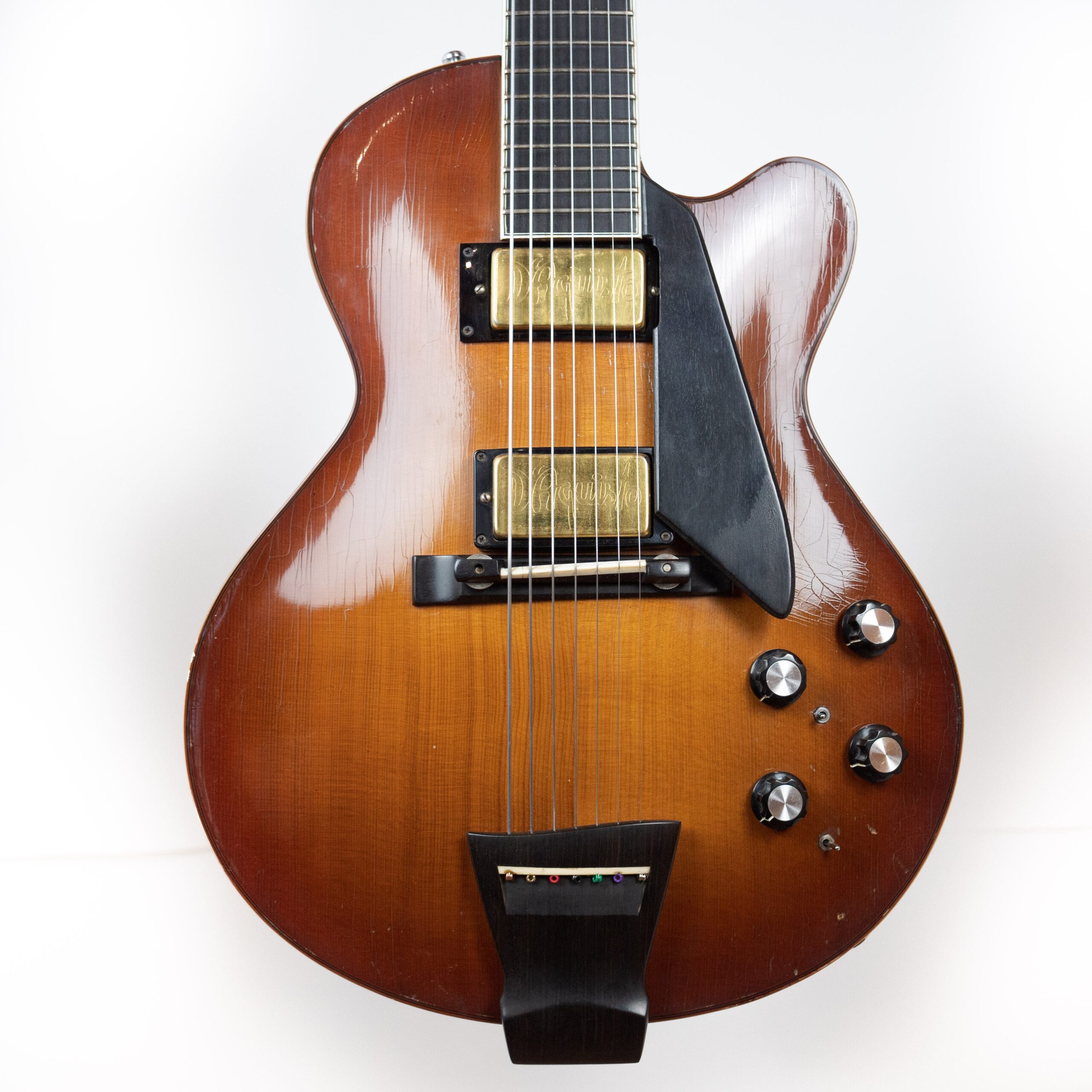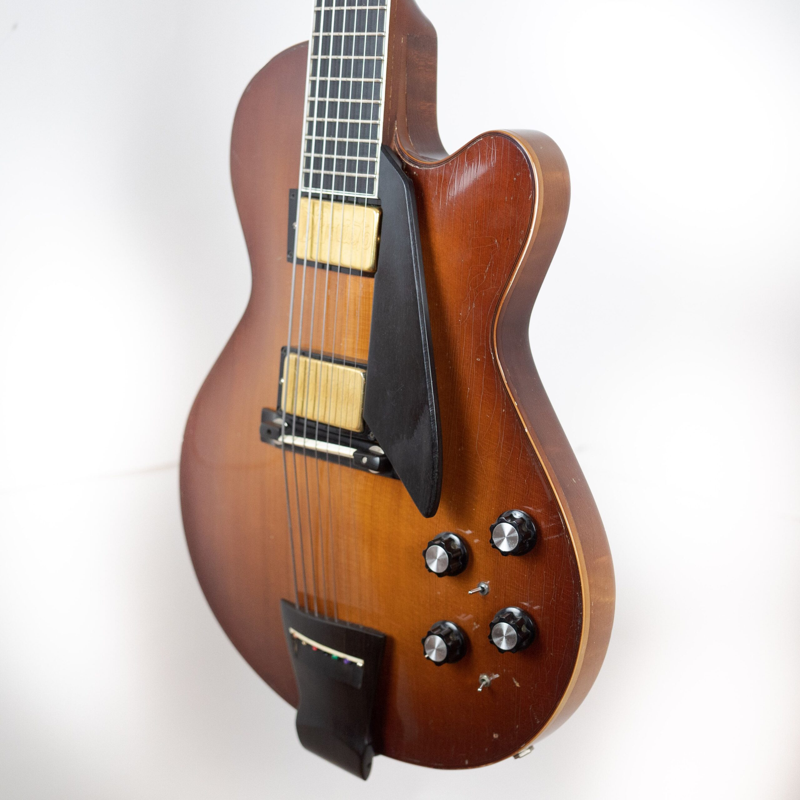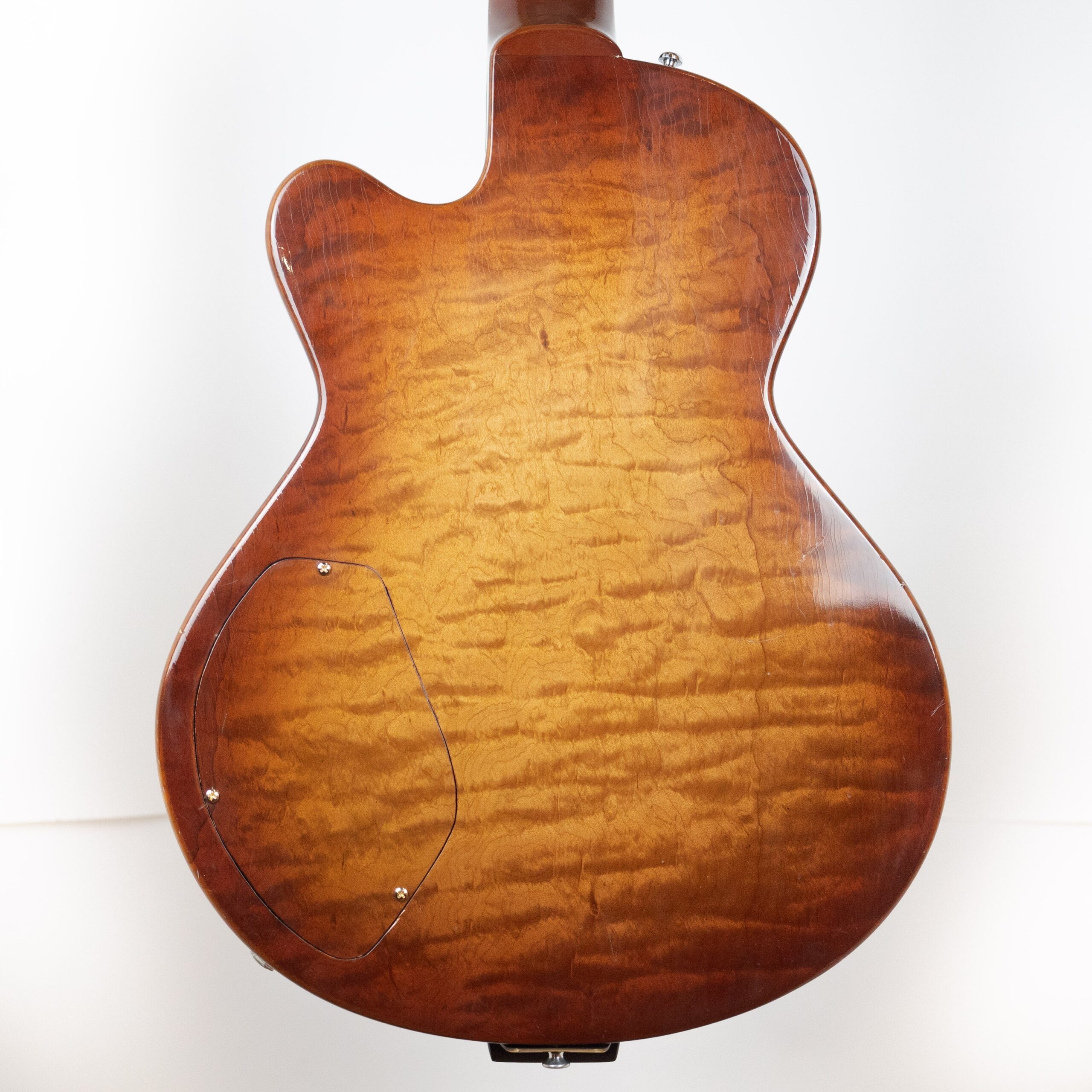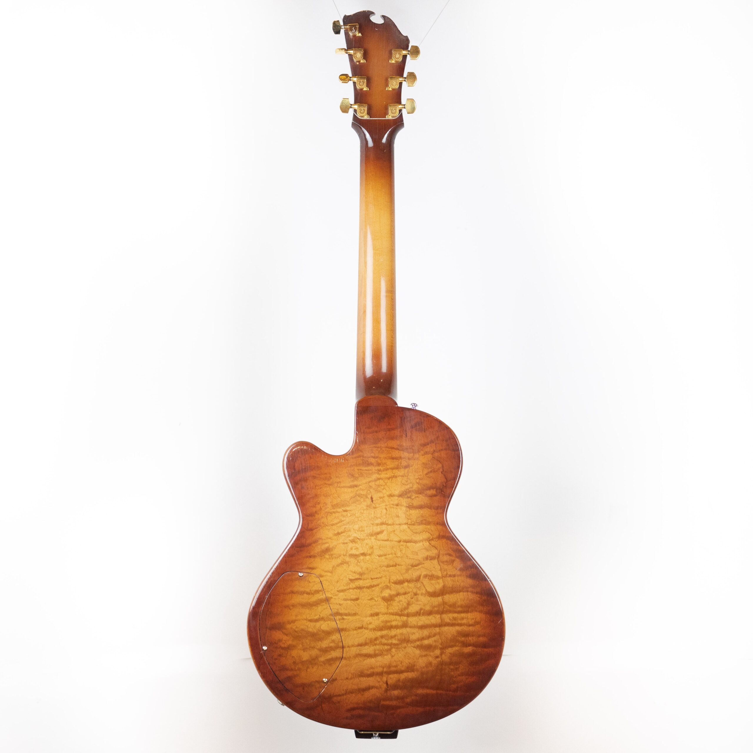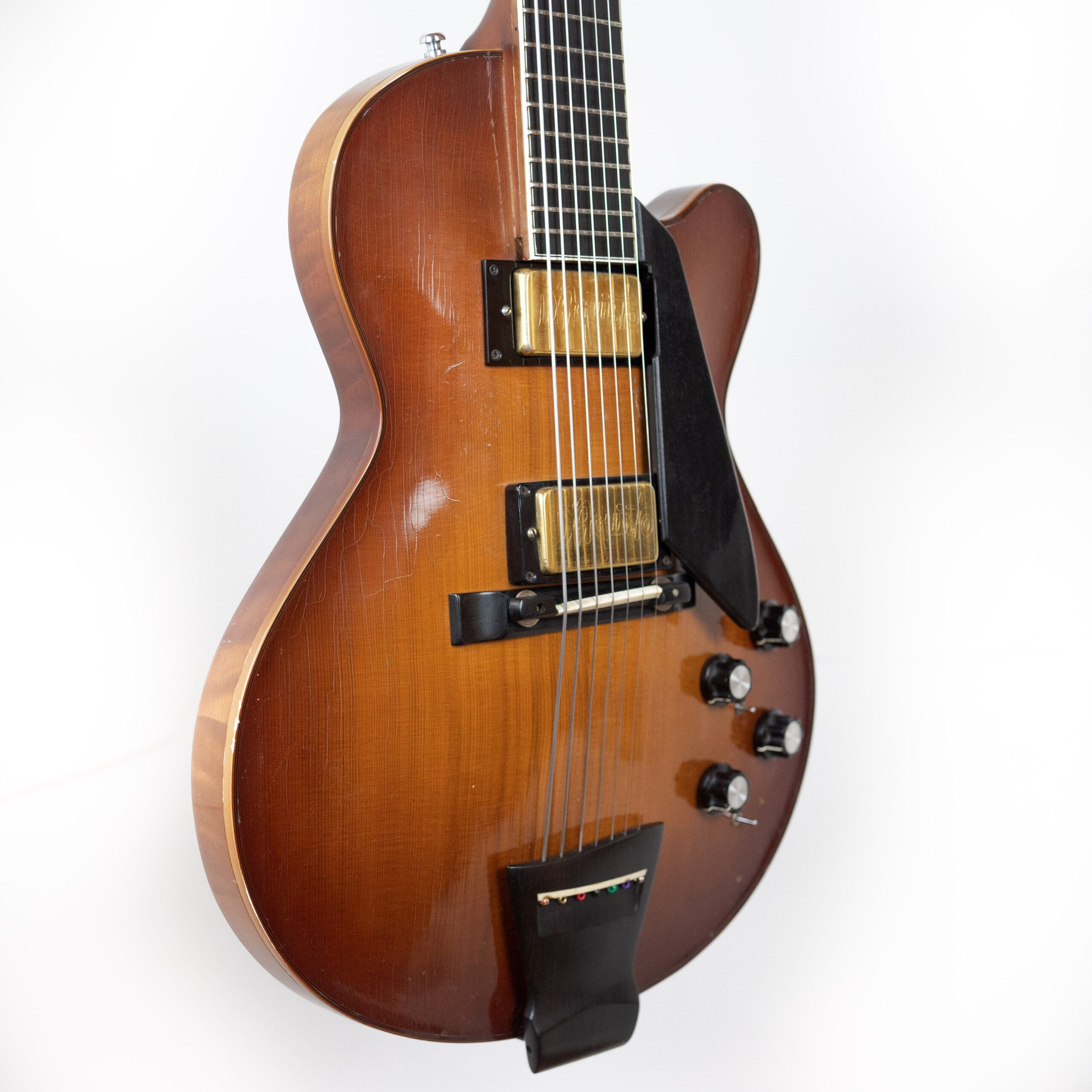Here we have a rare find, a D’Aquisto 7-String beauty, a hollow-solid as Jimmy referred to it. This chambered solid-body guitar has a beautiful spruce top with quilted maple back and sides. Strung up with flatwound strings it gives a lovely balanced, warm tone.