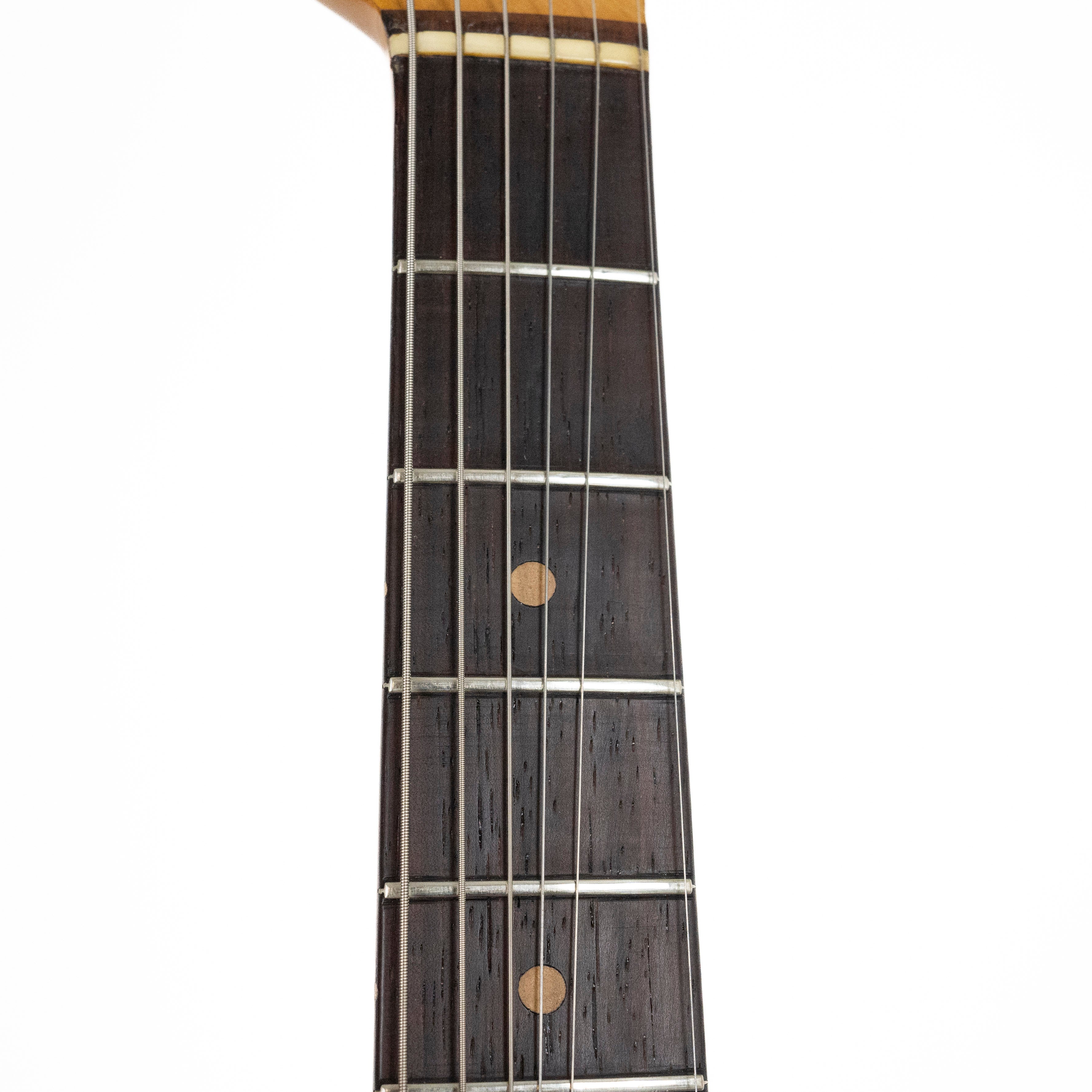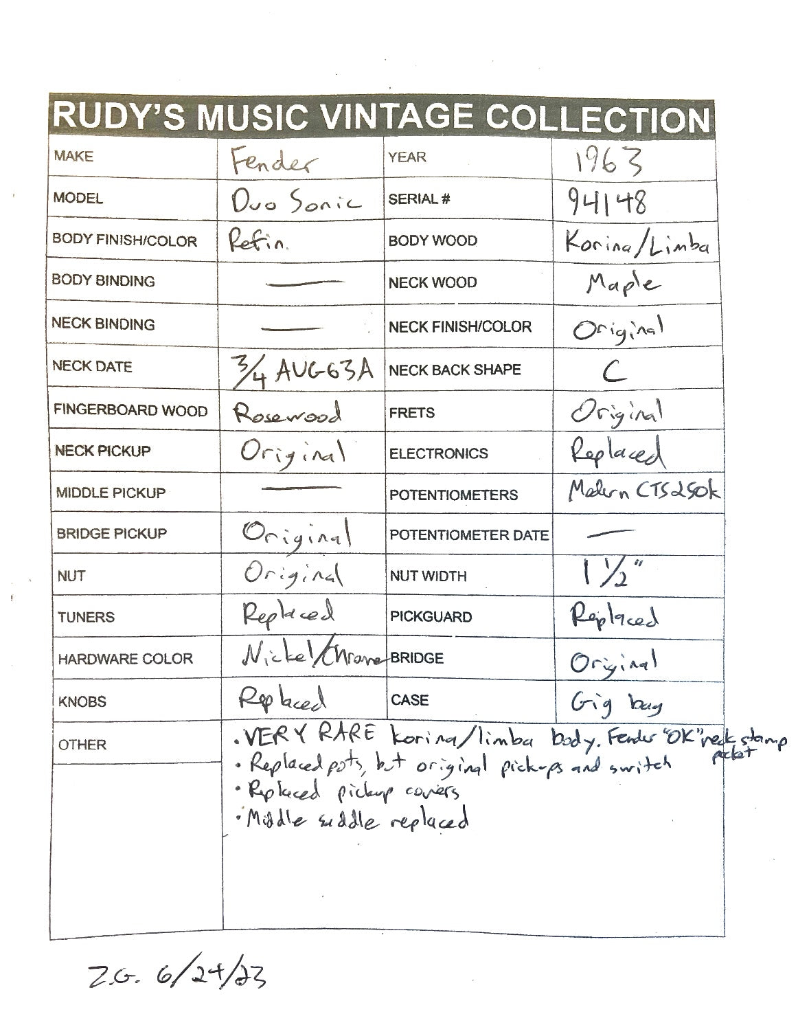 The Fender Duo Sonic, originally conceived as a student guitar model, has taken on a new life recently as a sought after entry point into Fender’s vintage market. Very rarely, however, one like this pops up. Every so often, Fender would use Korina on for their bodies (like the Gibson V’s and Explorers of the 1950s) and this one very much leads us to believe that it is, in fact, one of those Korina guitars.