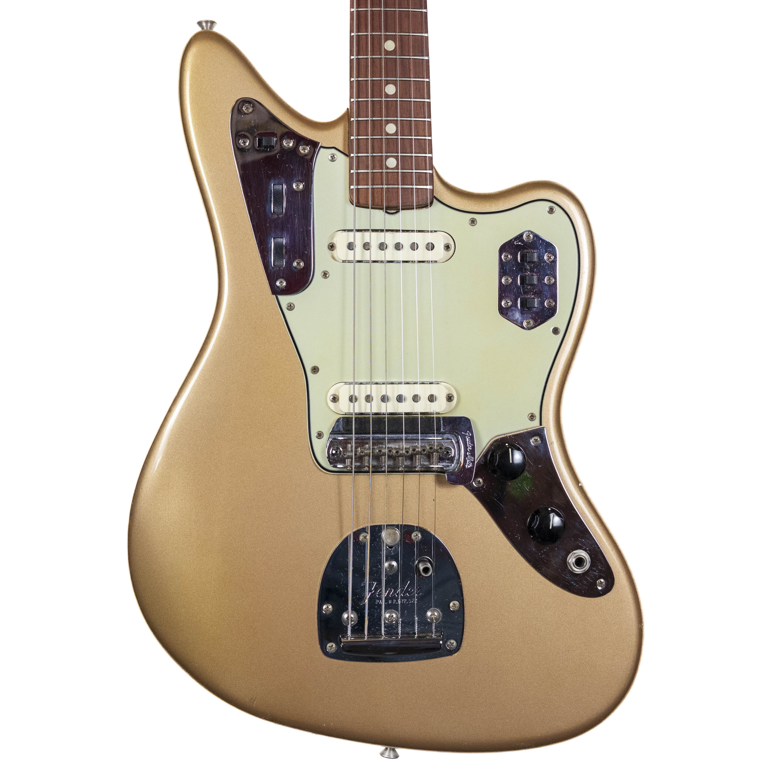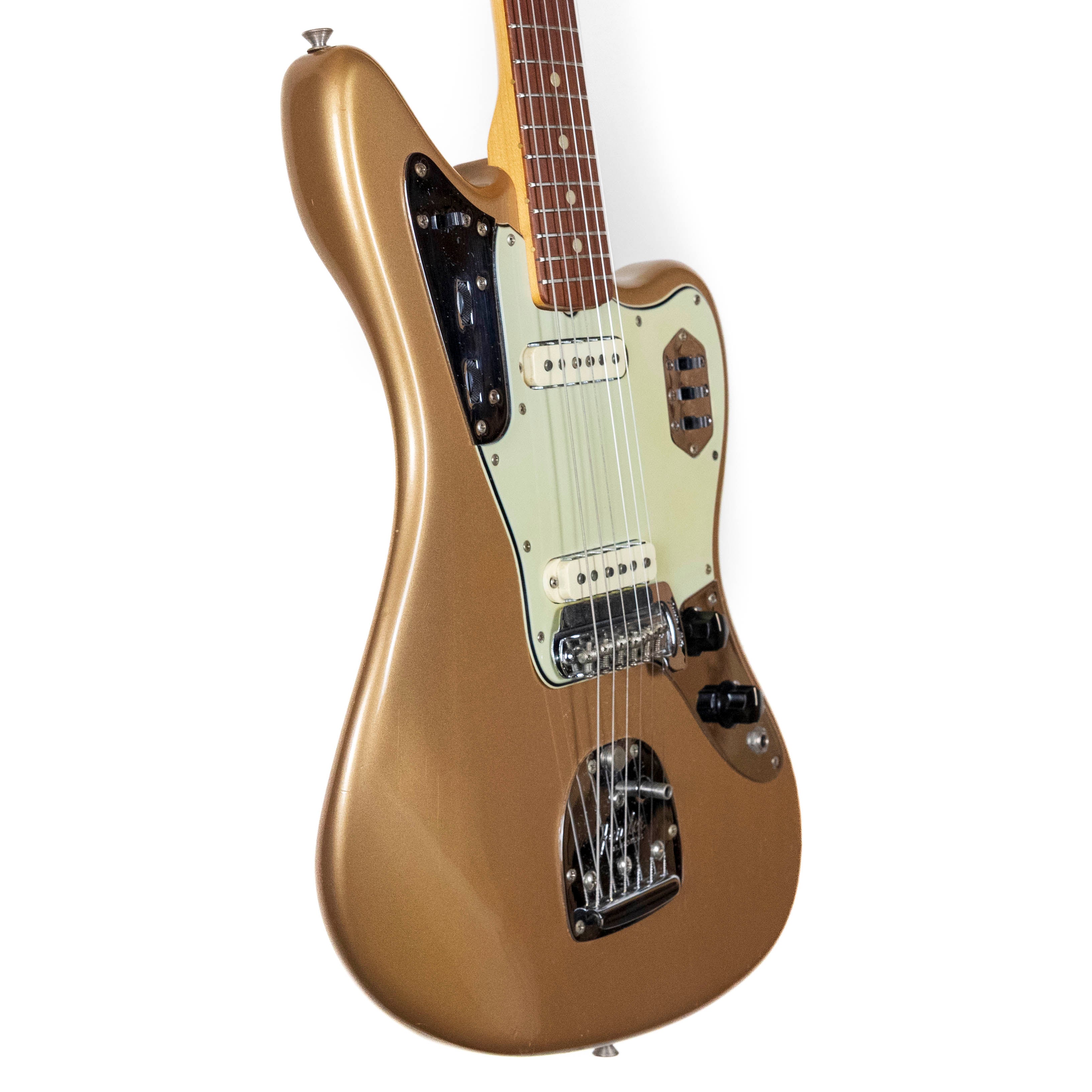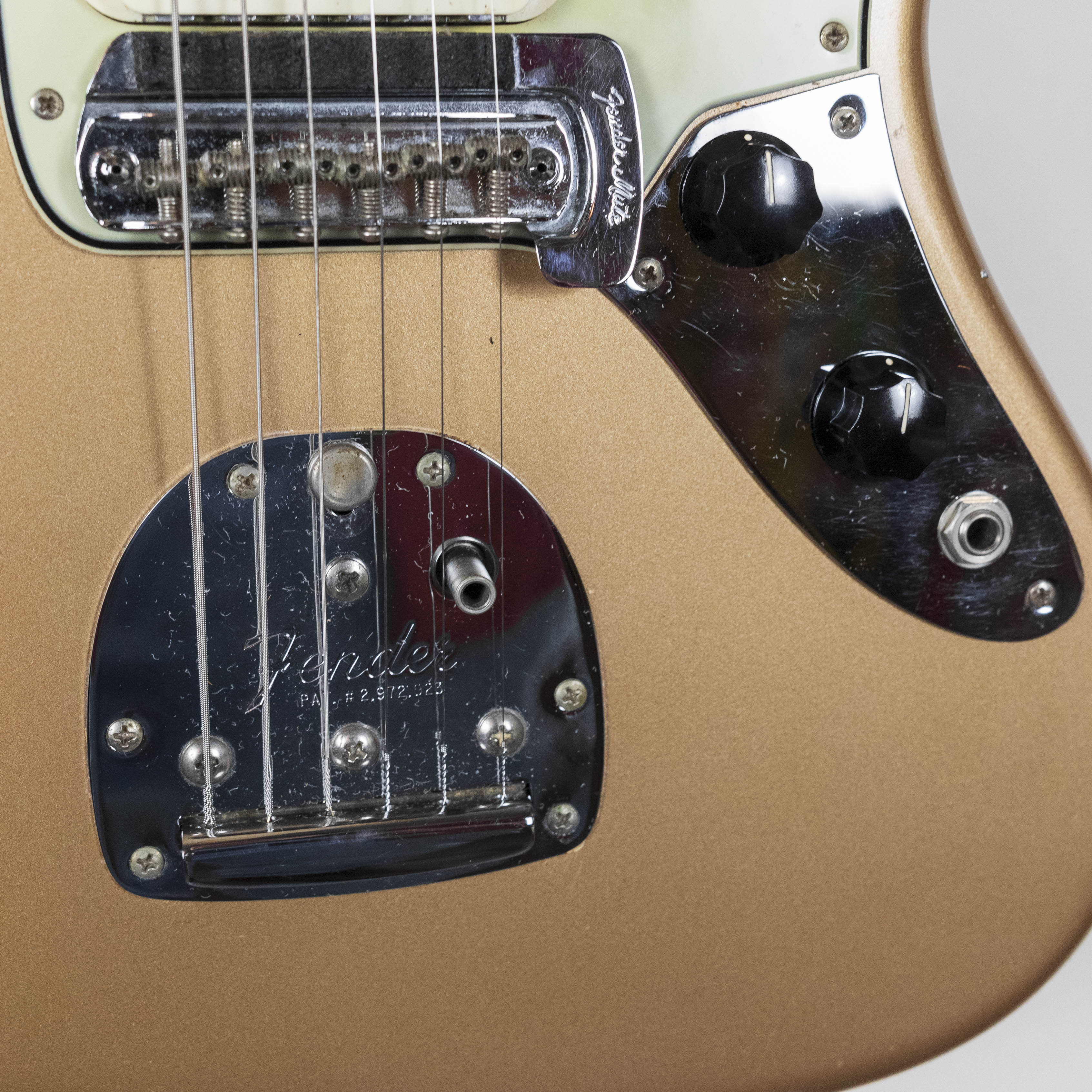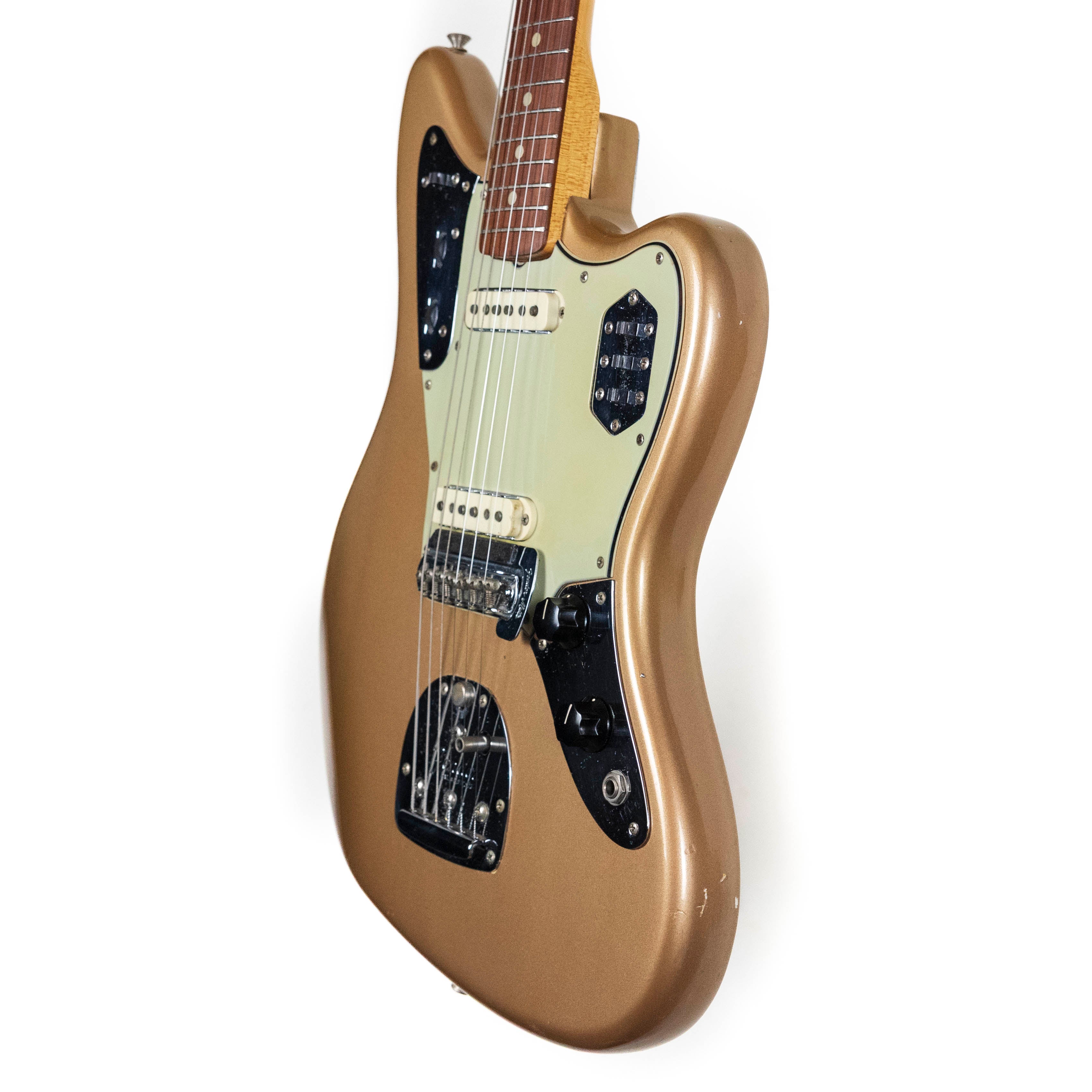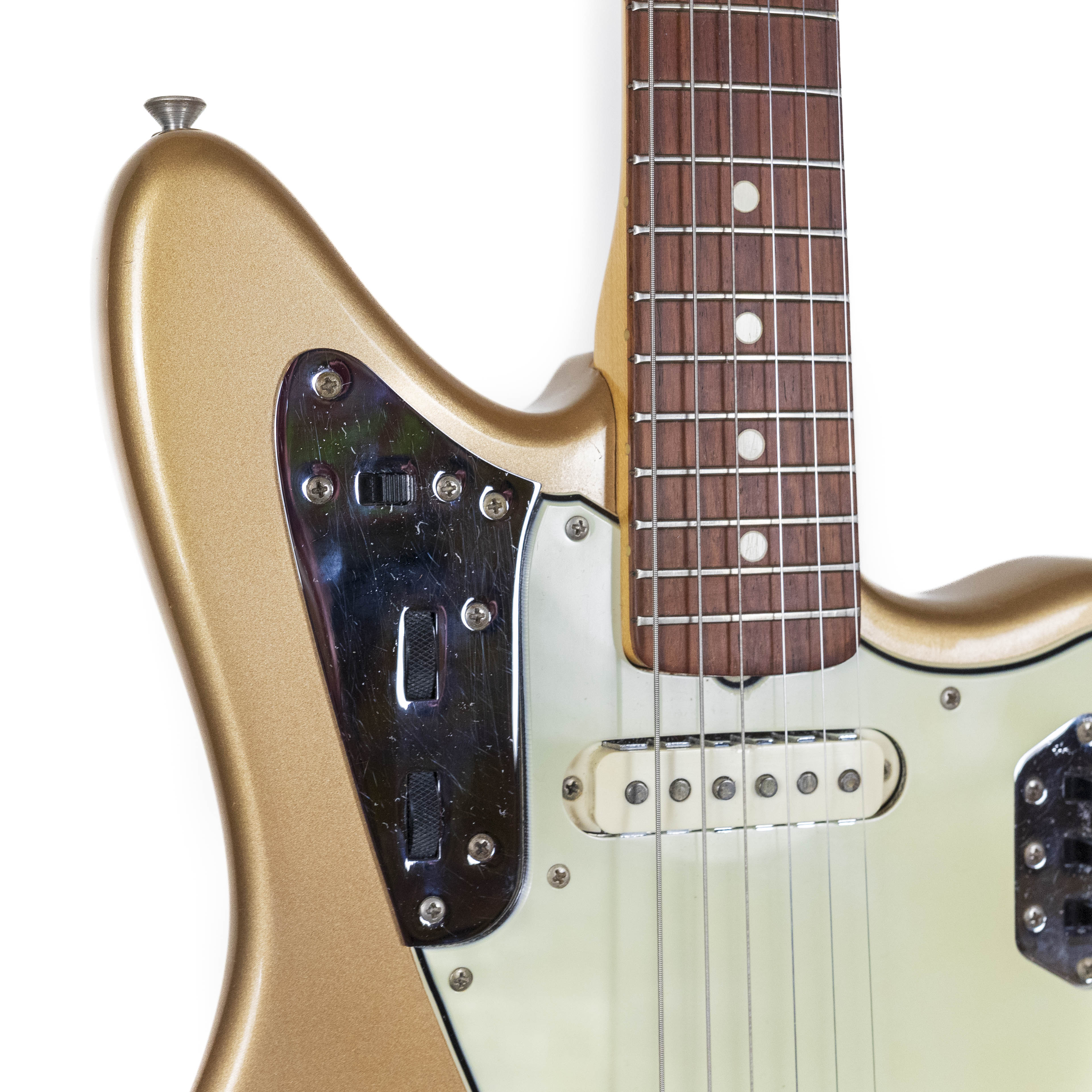 One of the more rare custom colors, Shoreline Gold looks elegant and flashy at the same time, we love it. This ’65 Jag wears it well, with a matching headstock as well. It has that Jag jangle & sparkle, and cosmetically it is in great shape with some light wear to the back of the guitar, probably from a guitar strap placed in the case at some point in its history.
