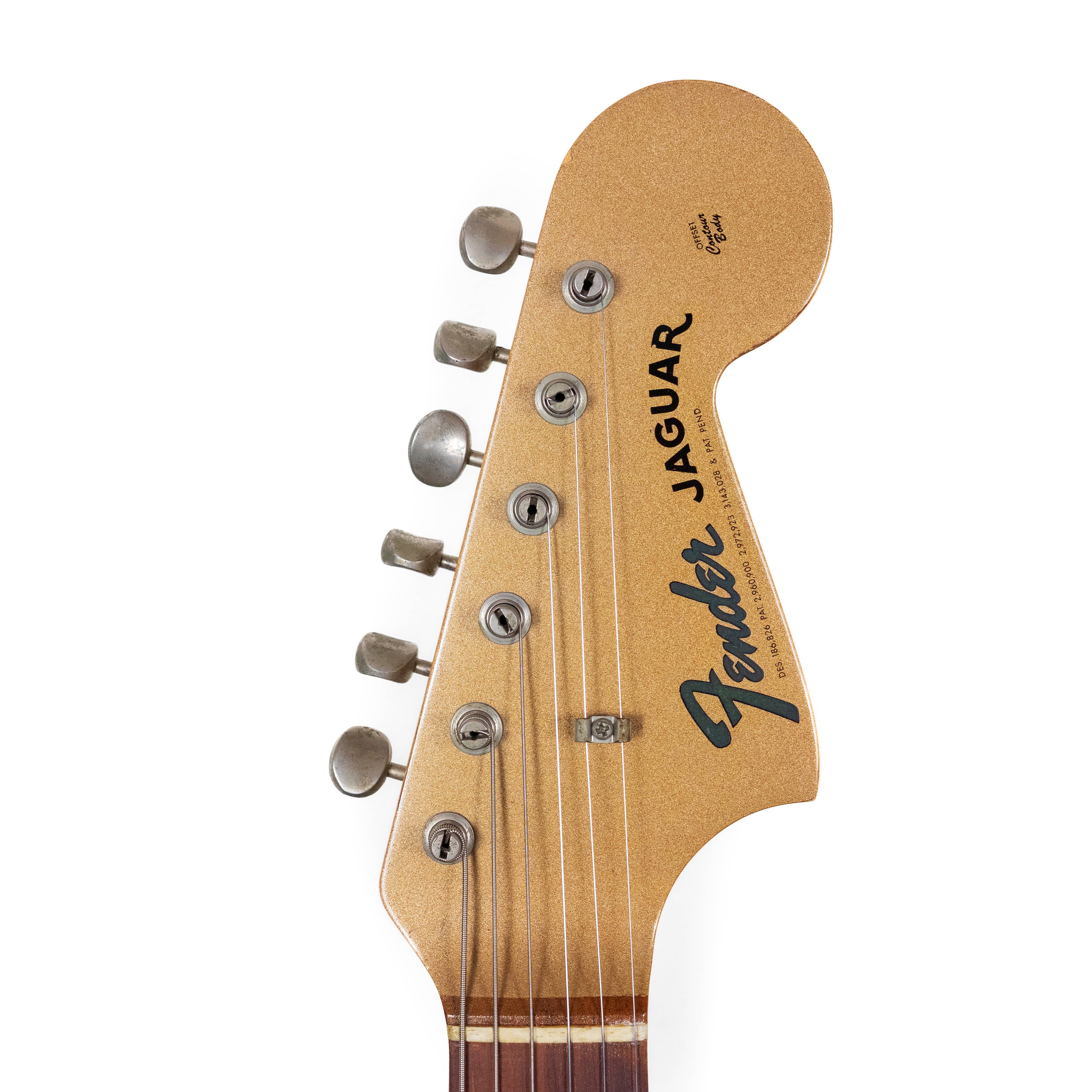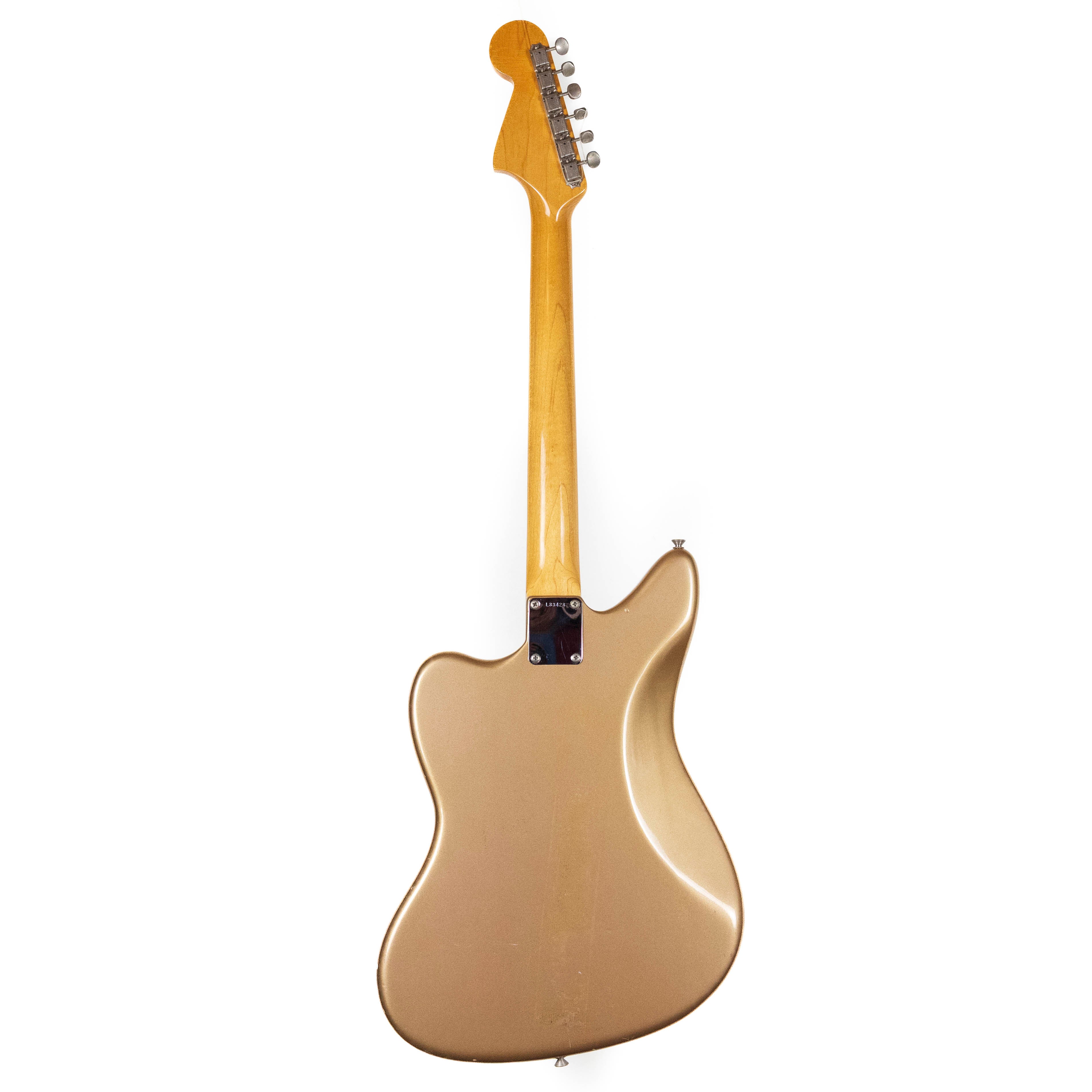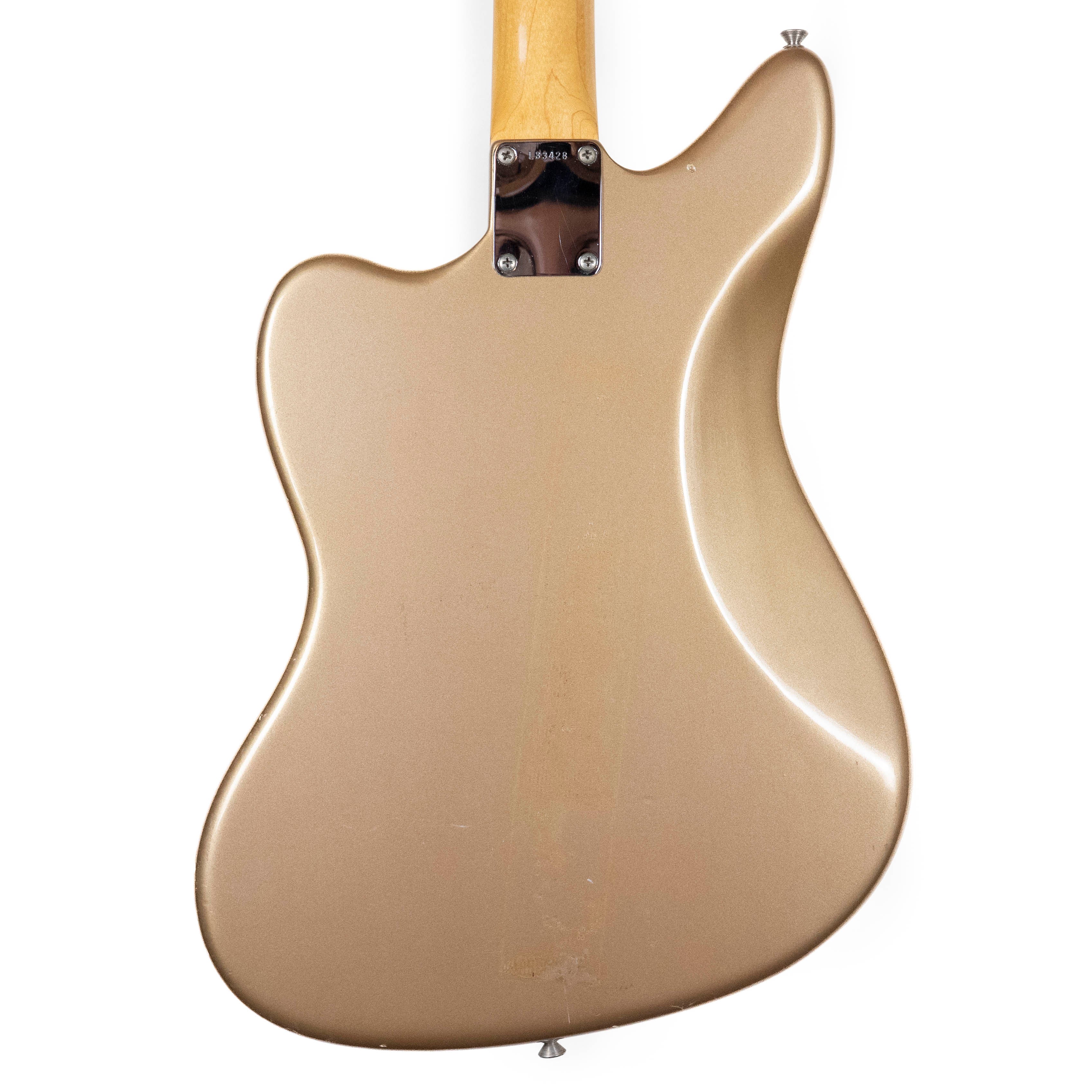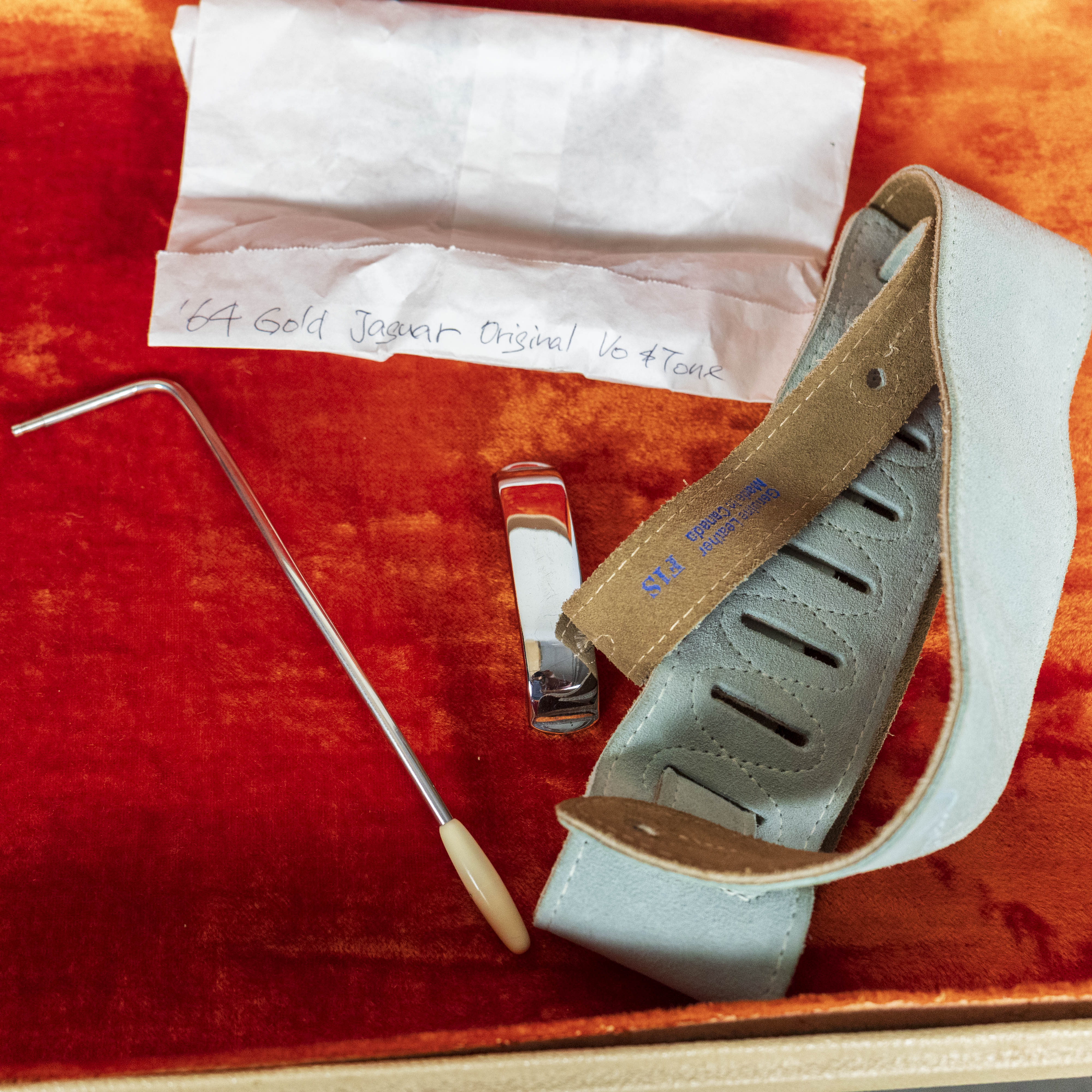 One of the more rare custom colors, Shoreline Gold looks elegant and flashy at the same time, we love it. This ’65 Jag wears it well, with a matching headstock as well. It has that Jag jangle & sparkle, and cosmetically it is in great shape with some light wear to the back of the guitar, probably from a guitar strap placed in the case at some point in its history.