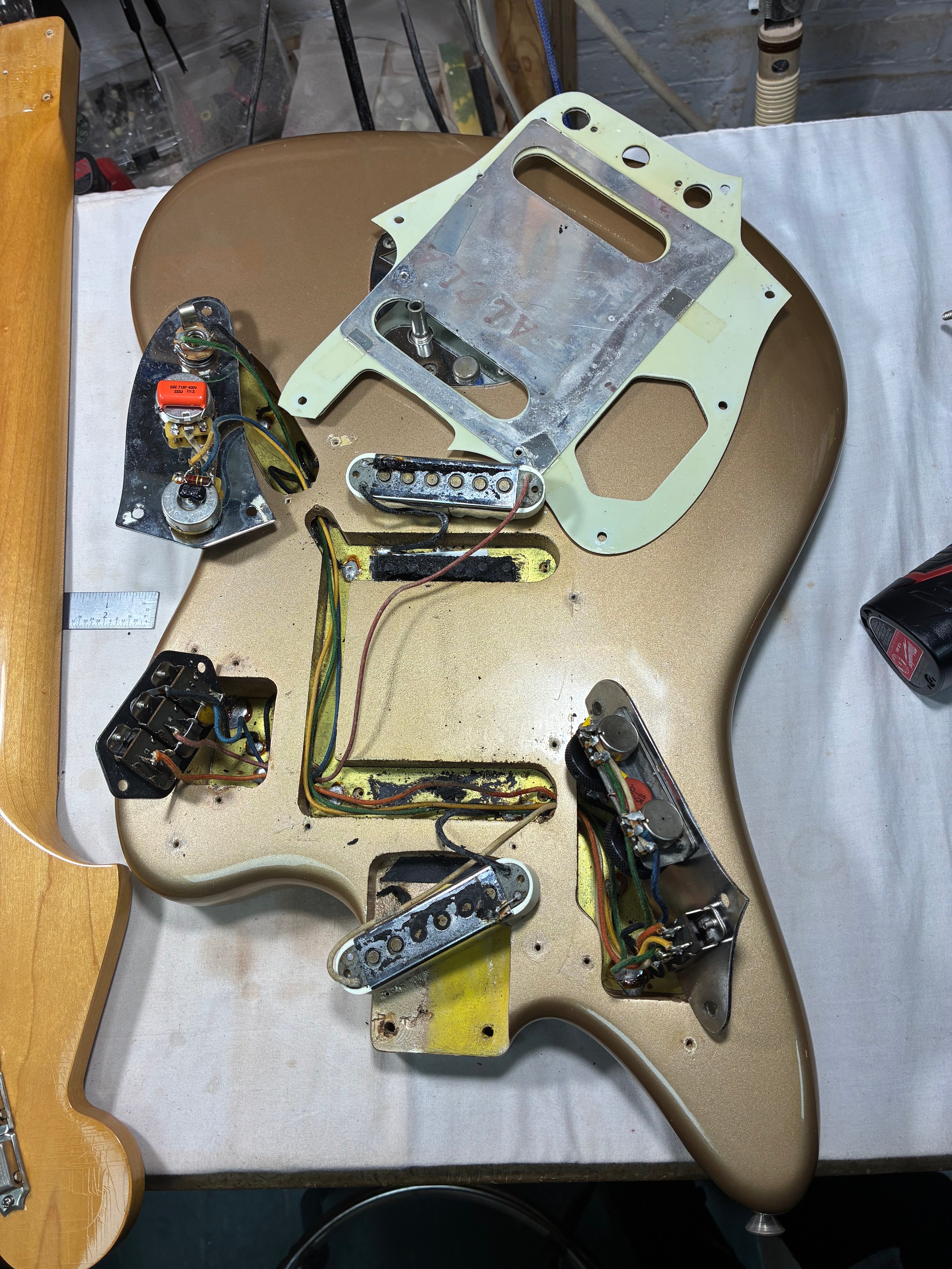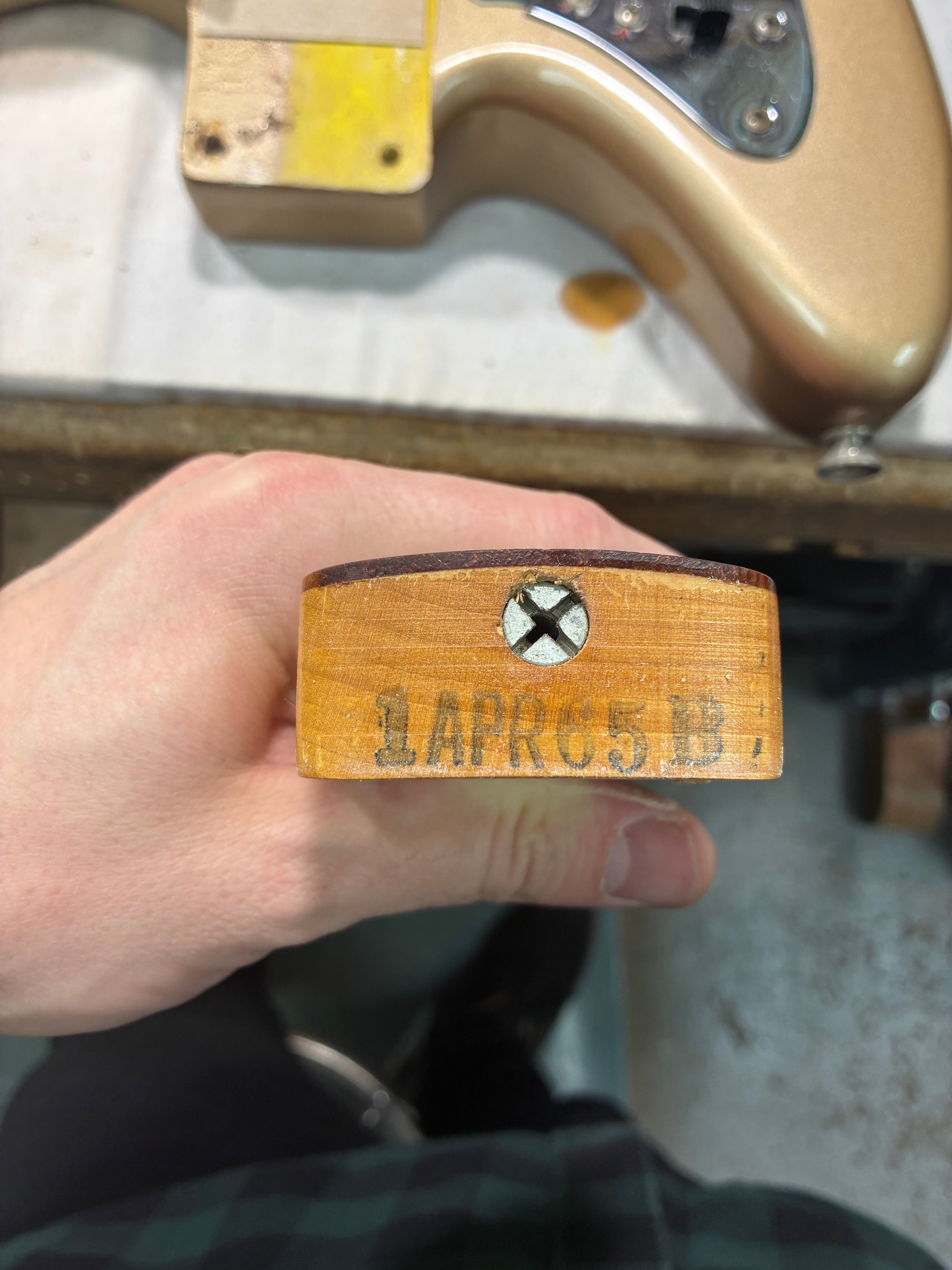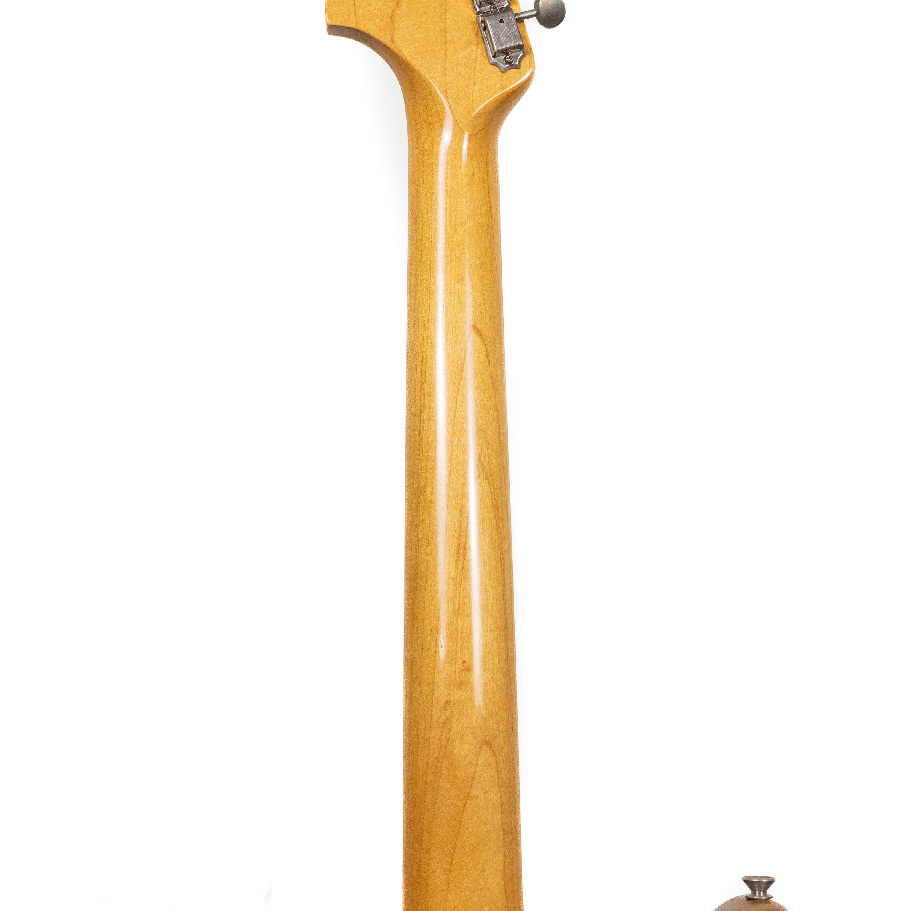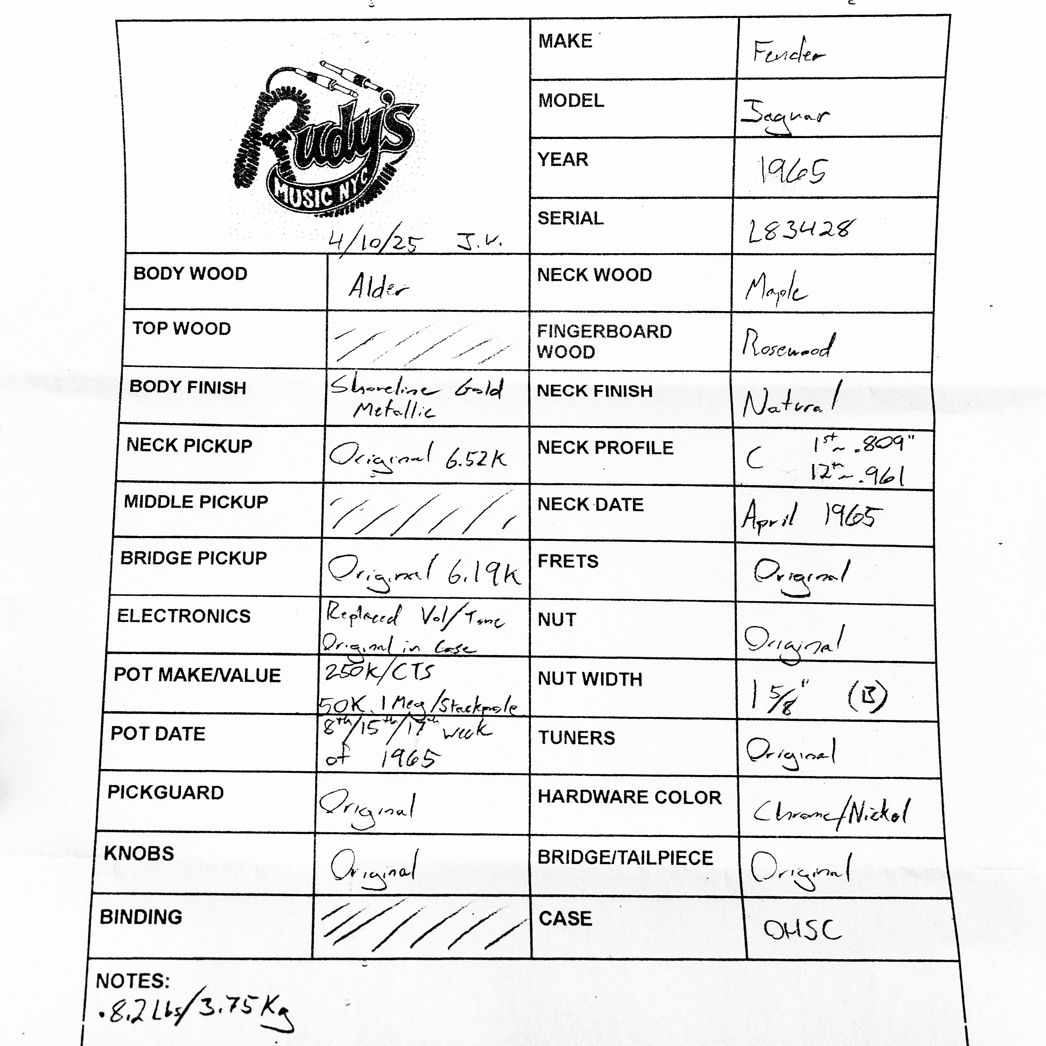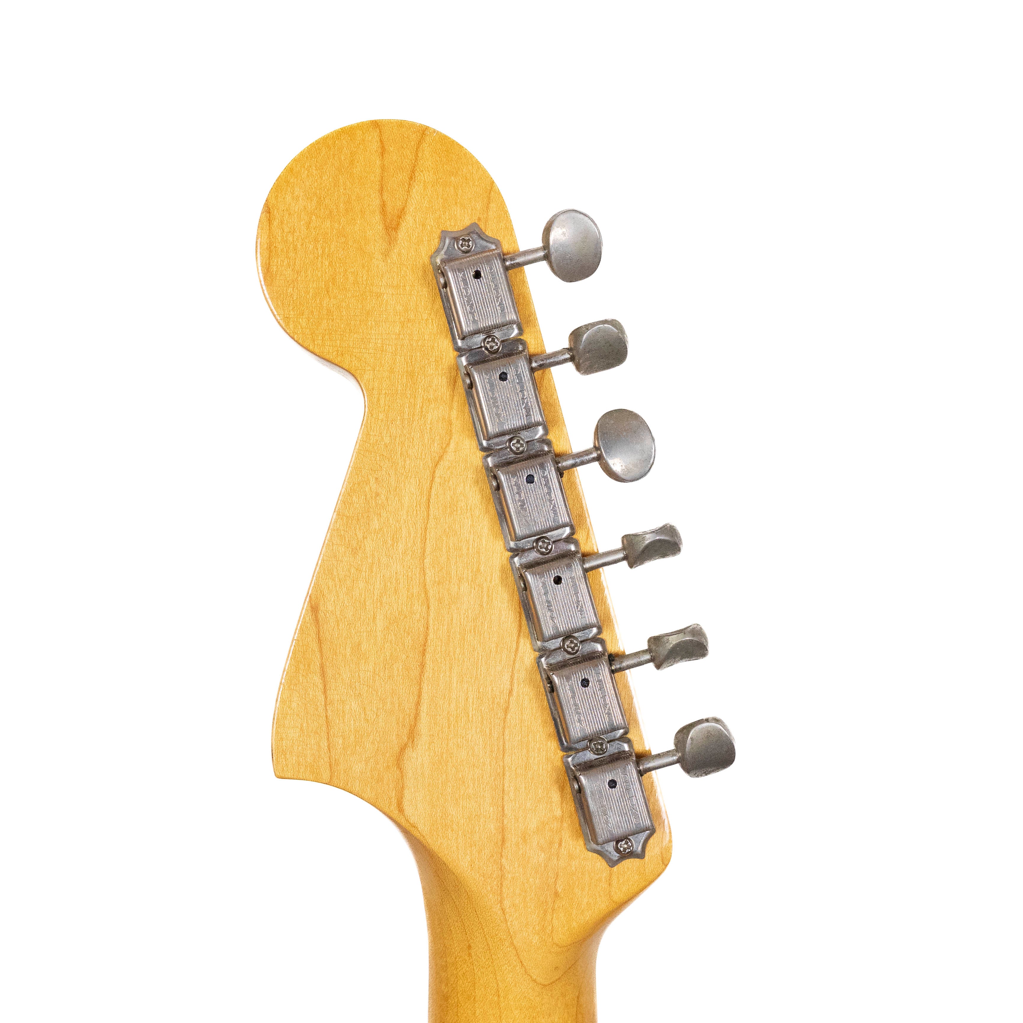 One of the more rare custom colors, Shoreline Gold looks elegant and flashy at the same time, we love it. This ’65 Jag wears it well, with a matching headstock as well. It has that Jag jangle & sparkle, and cosmetically it is in great shape with some light wear to the back of the guitar, probably from a guitar strap placed in the case at some point in its history.