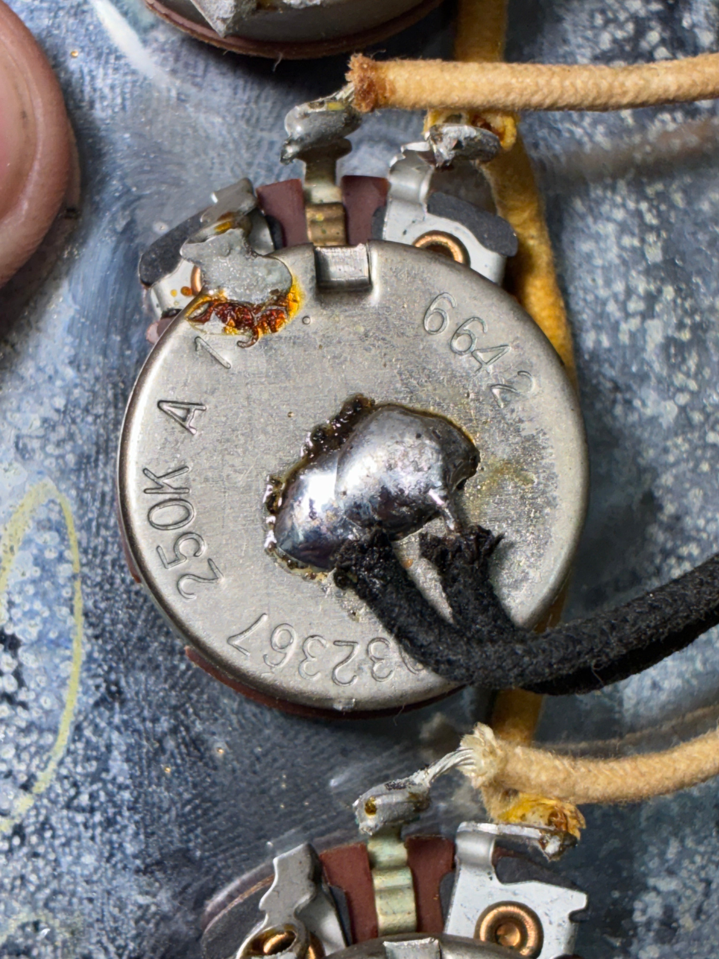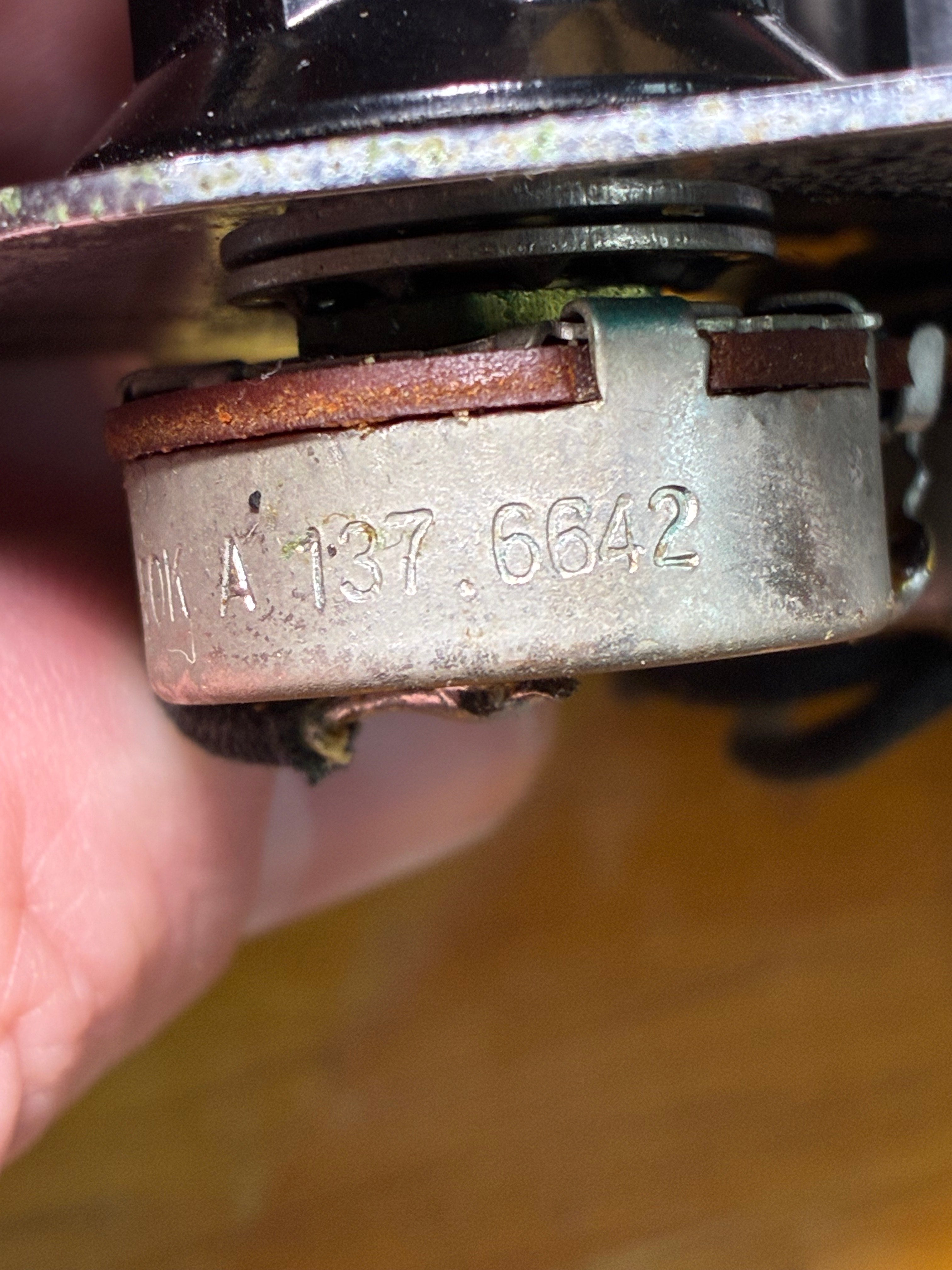 This example has a C shaped neck that measures .811″/1st and .975″/12th. It has had a refret, replaced pickguard (the original cracked guard and thumbrest are included). The pot codes are dated the 42nd week of 1966 and the pickups are dated ’67. Serial #205251, comes with the original case. Please refer to the provided photos for more detail on the condition. As with all of our vintage listings, included is a vintage spec sheet which details and repairs & changes of note.