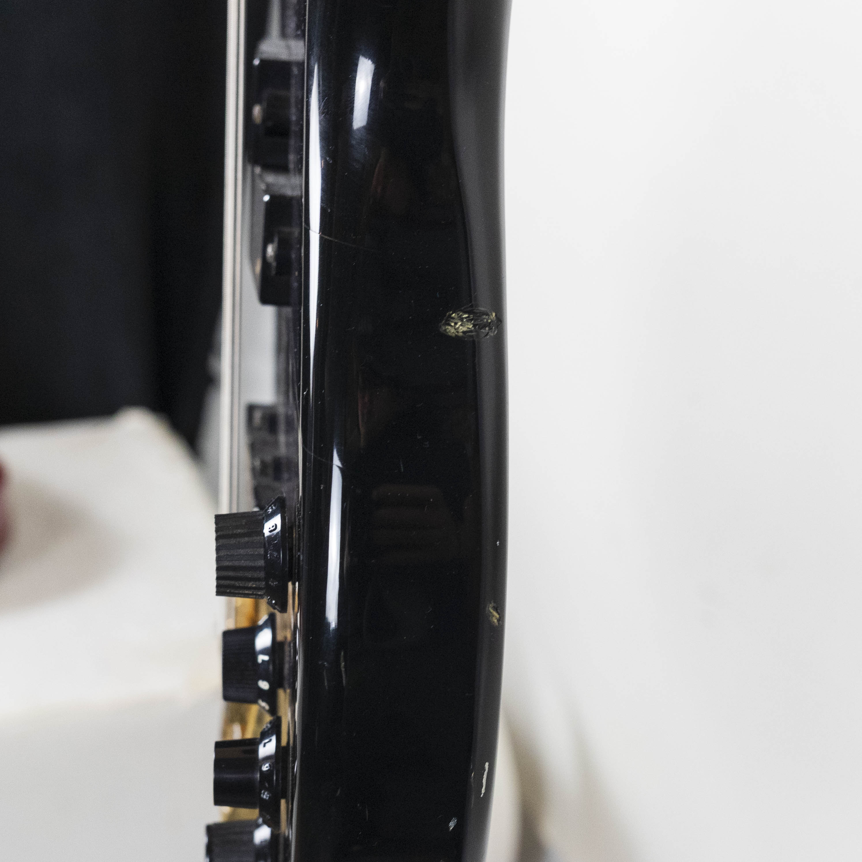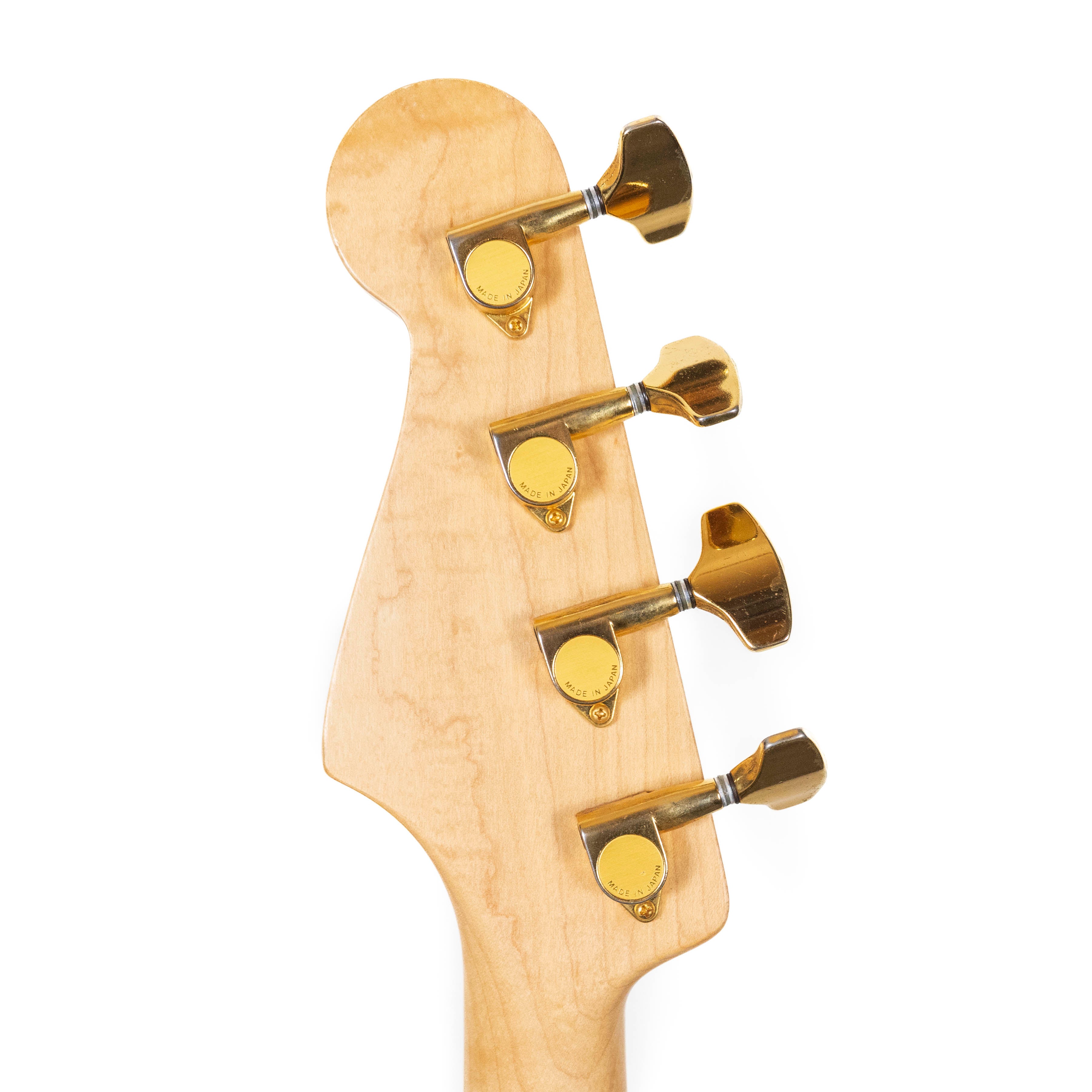 What a cool, quirky model! The P Bass Lyte models were designed and created by Fender Japan in the late ’80s as a blend of modern/older specs. A sleeker body is matched with gold hardware, P/J pickups and four knobs (volume, bass, treble, pickup pan). This one has a few nicks and dings, shown in the photos. The knobs may be replaced. Serial #S017034, comes with a non original road runner gig bag.