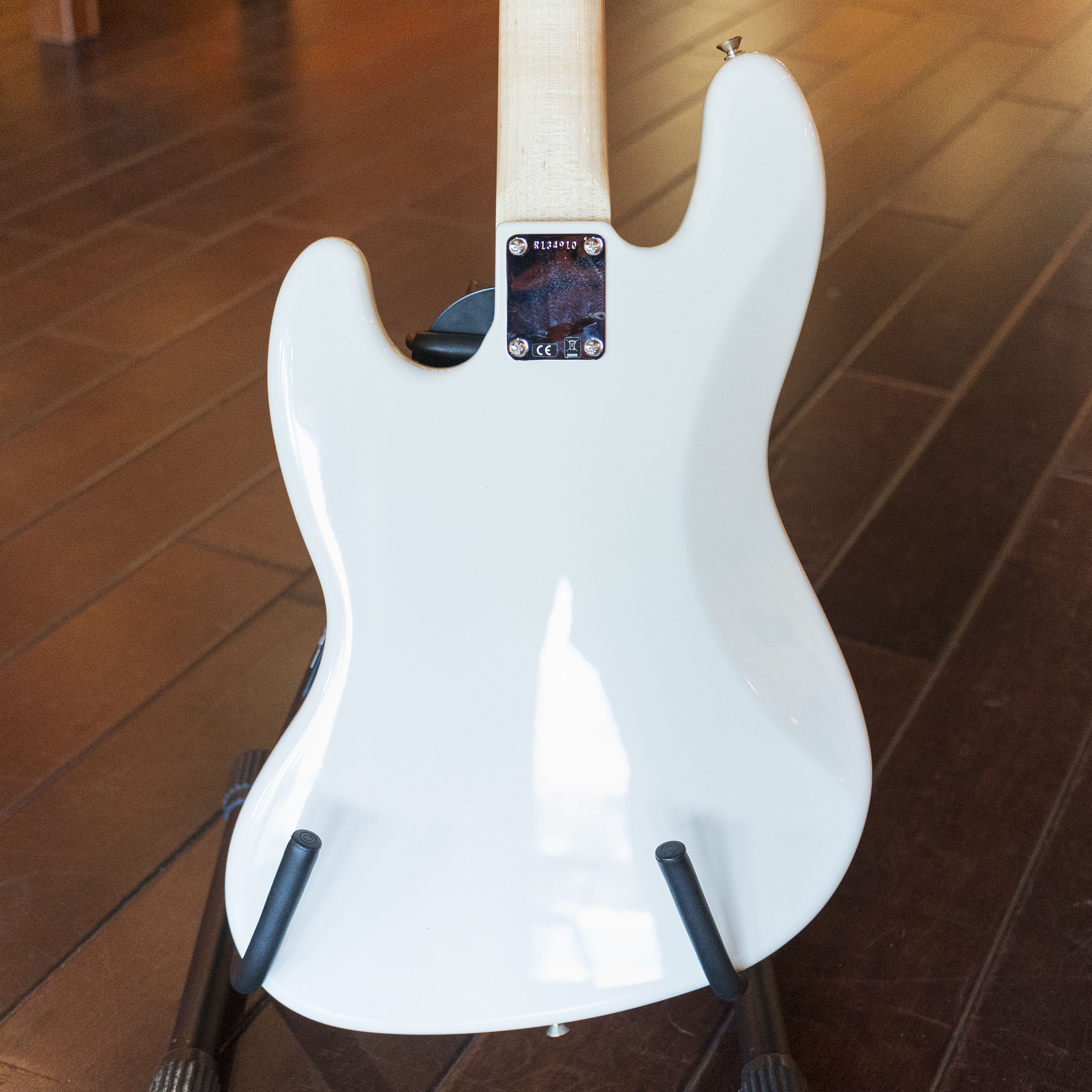 This example a 1962 style Jazz bass in Olympic White with matching headstock is meant to be a modern fusion of vintage style/sound with modern accessibility, most notably with: