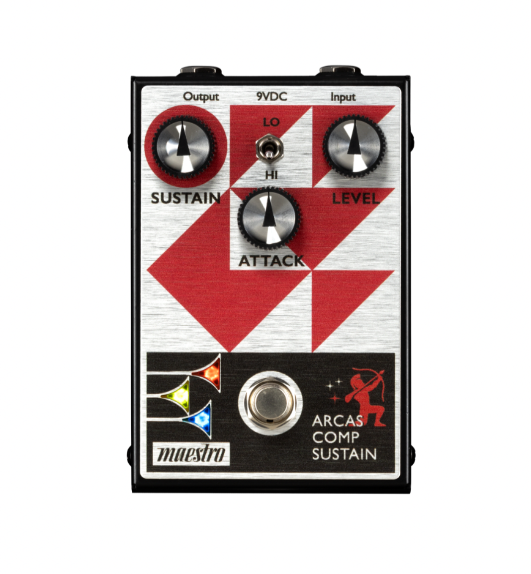The Maestro Arcas Compressor Sustainer pedal provides excellent versatility. It offers both transparent, light compression as well as heavy, tight compression. It delivers enough sustain and level compensation to become a go-to workhorse for any situation. This all-analog pedal boasts a two-position Mode toggle switch for increased sonic versatility. The LO mode is less sensitive to pick attack, while the HI mode is more sensitive to pick attack. The intuitive 3-knob control layout lets users quickly dial up the desired Sustain (amount of gain applied during compression), control the Attack (how fast the compression engages), and adjust the amount of gain compensation and the pedal’s overall output volume with the Level control. The true bypass footswitch triggers the LED lights in the bugles in the Maestro logo when it’s on, so you’ll always know when the effect is active.