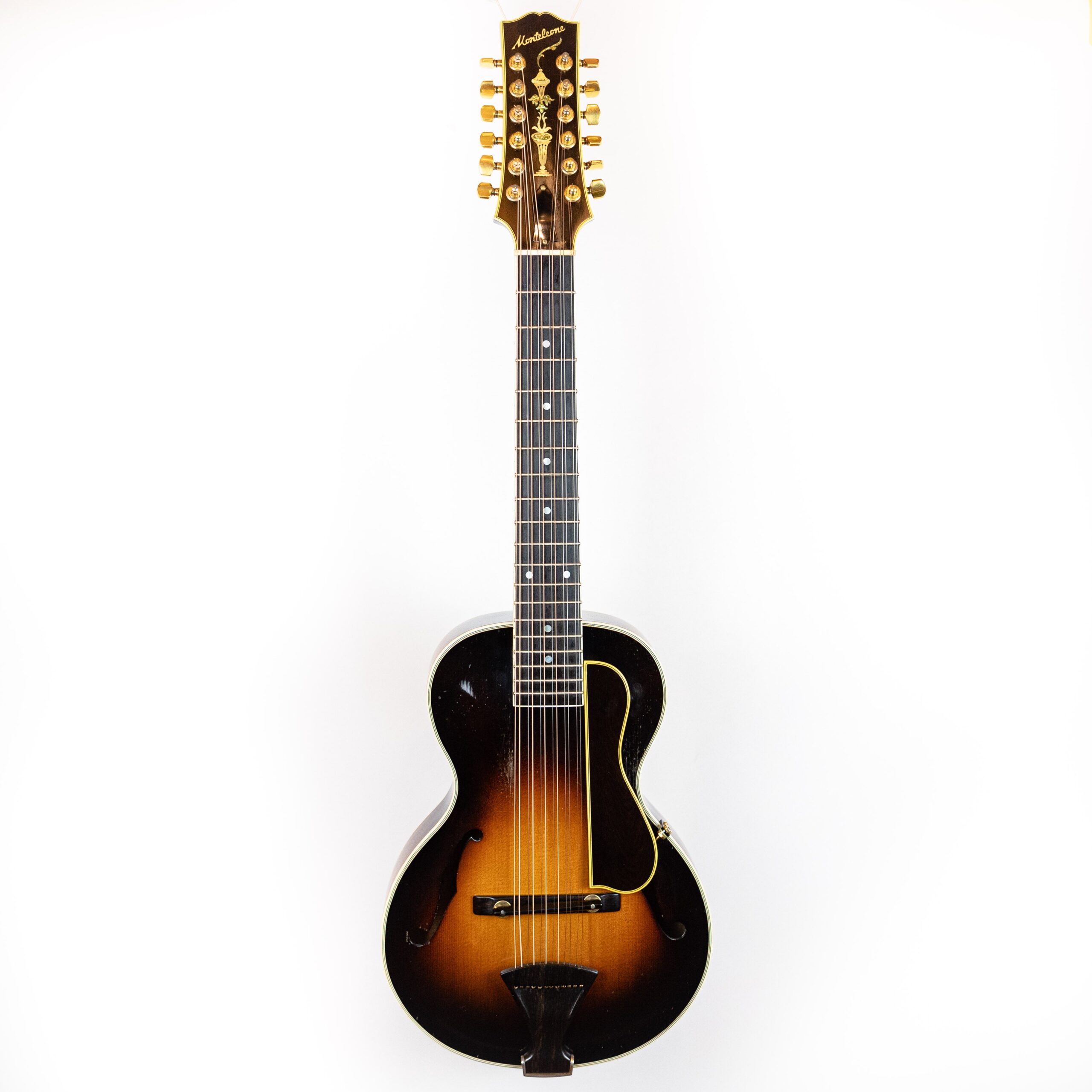 This mini 12-string archtop was the 9th guitar that John Monteleone ever made. It was commissioned for someone who wanted a companion instrument to his 1931 Gibson L-5. Solid carved spruce top, flame maple back and sides, gold Schaller tuners, and ebony fingerboard, bridge and tailpiece. This little beauty has the same dark-edge sunburst as its older L-5 twin, as well as a gorgeous abalone headstock inlay that is reminiscent of that of the L-5, but has been extended to accommodate the longer 12-string headstock.