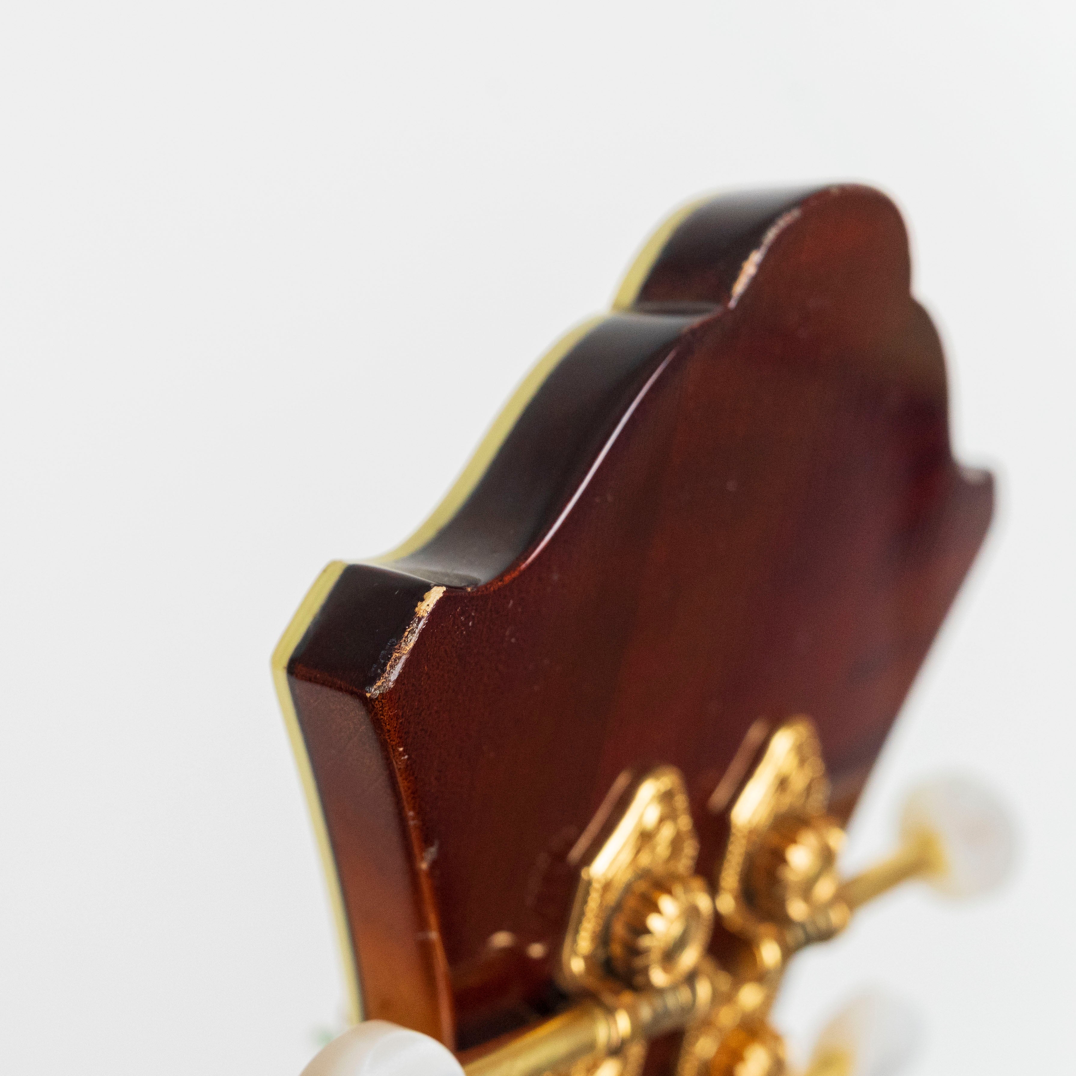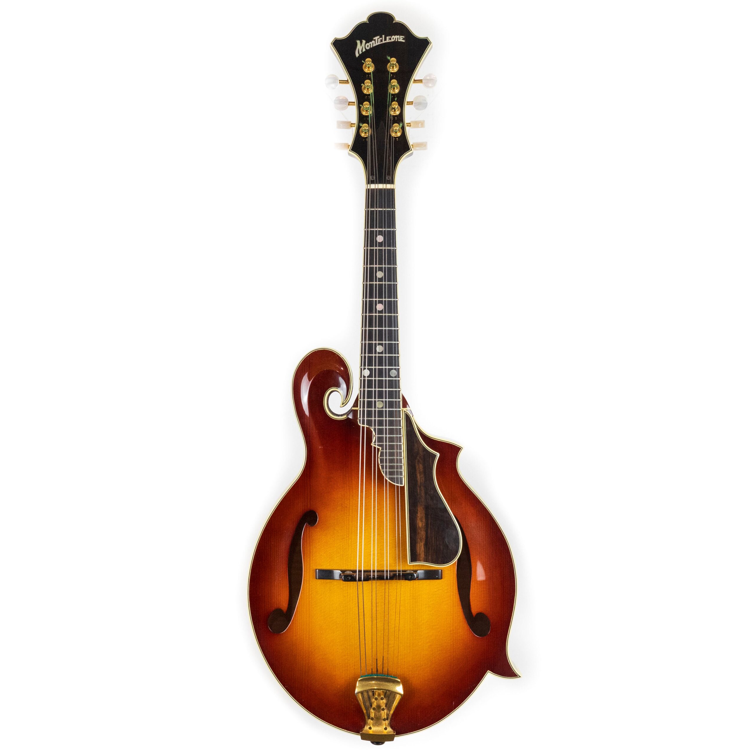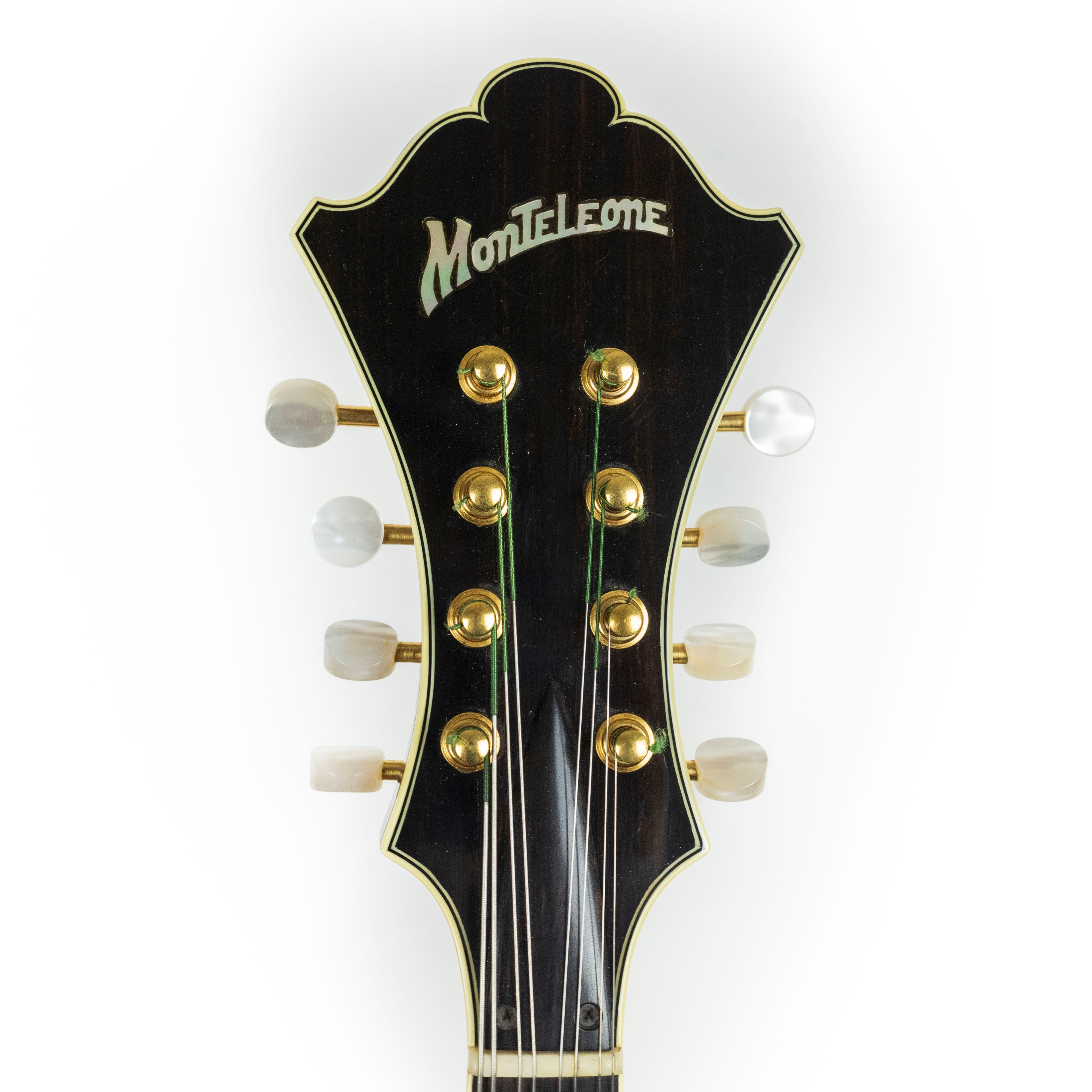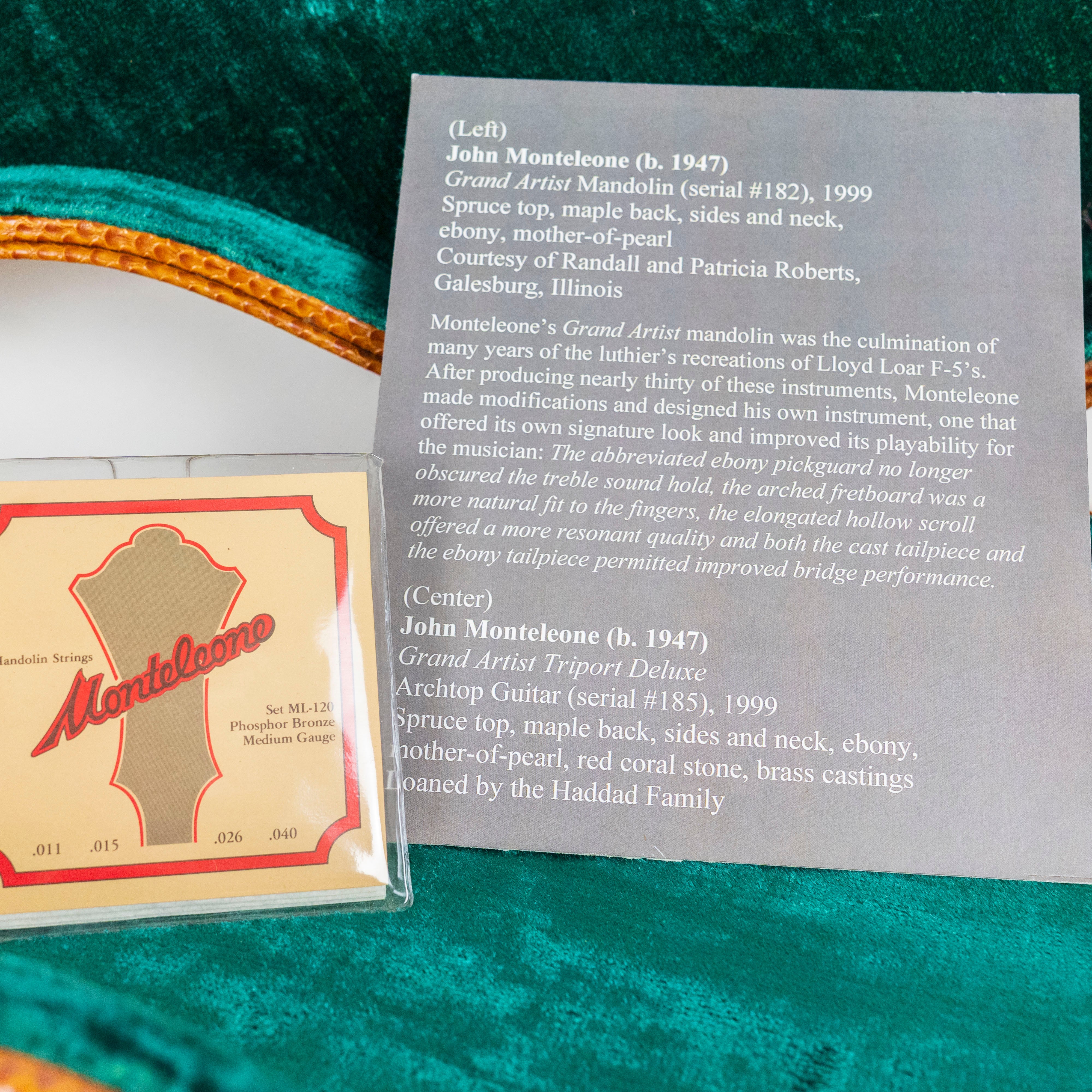 “Monteleone’s Grand Artist mandolin was the culmination of many years of the luthier’s recreations of the Lloyd Loar F-5 mandolins. After producing nearly 30 of those instruments, Monteleone made modifications and designed his own instrument, one that offered its own signature look and improved its playability for the musician: the abbreviated ebony pickguard no longer obscured the treble sound hole, the arched fretboard was a more natural fit to the fingers, the elongated hollow scroll offered a more resonant quality and both the cast tailpiece and the ebony tailpiece permitted improved bridge performance.”
