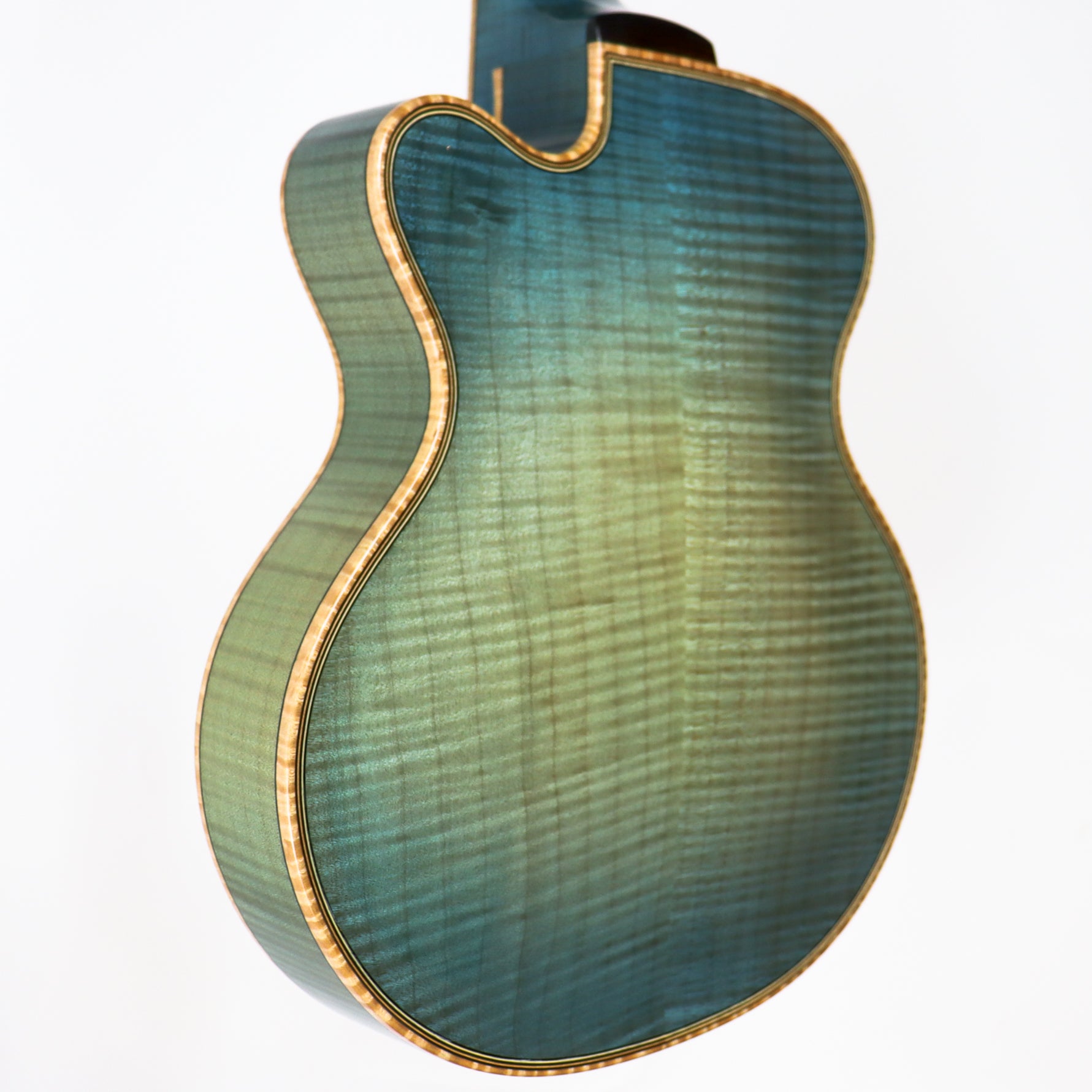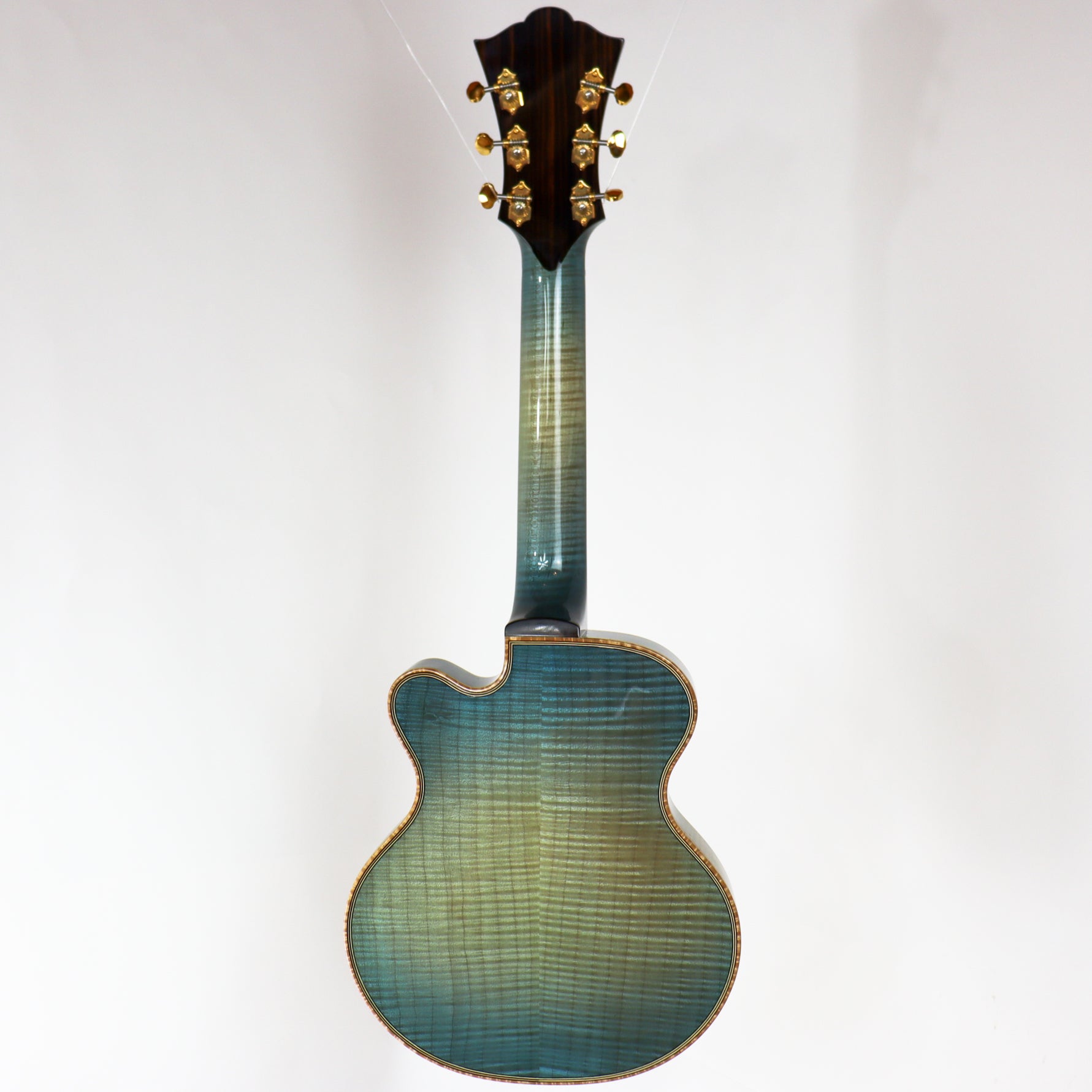 “Il Bambino” (Italian for “the baby”) is a one-of-a-kind guitar, a small masterpiece by John Monteleone. With a slightly higher tuning, it has a very sweet sound and is a joy to play. It was built with a spruce top and flame maple back and sides, and has a Macassar ebony fingerboard, finger rest, bridge, tailpiece and headstock veneer. Flame maple binding. Gorgeous abalone inlays. Serial #225. Comes with a deluxe hardshell case.