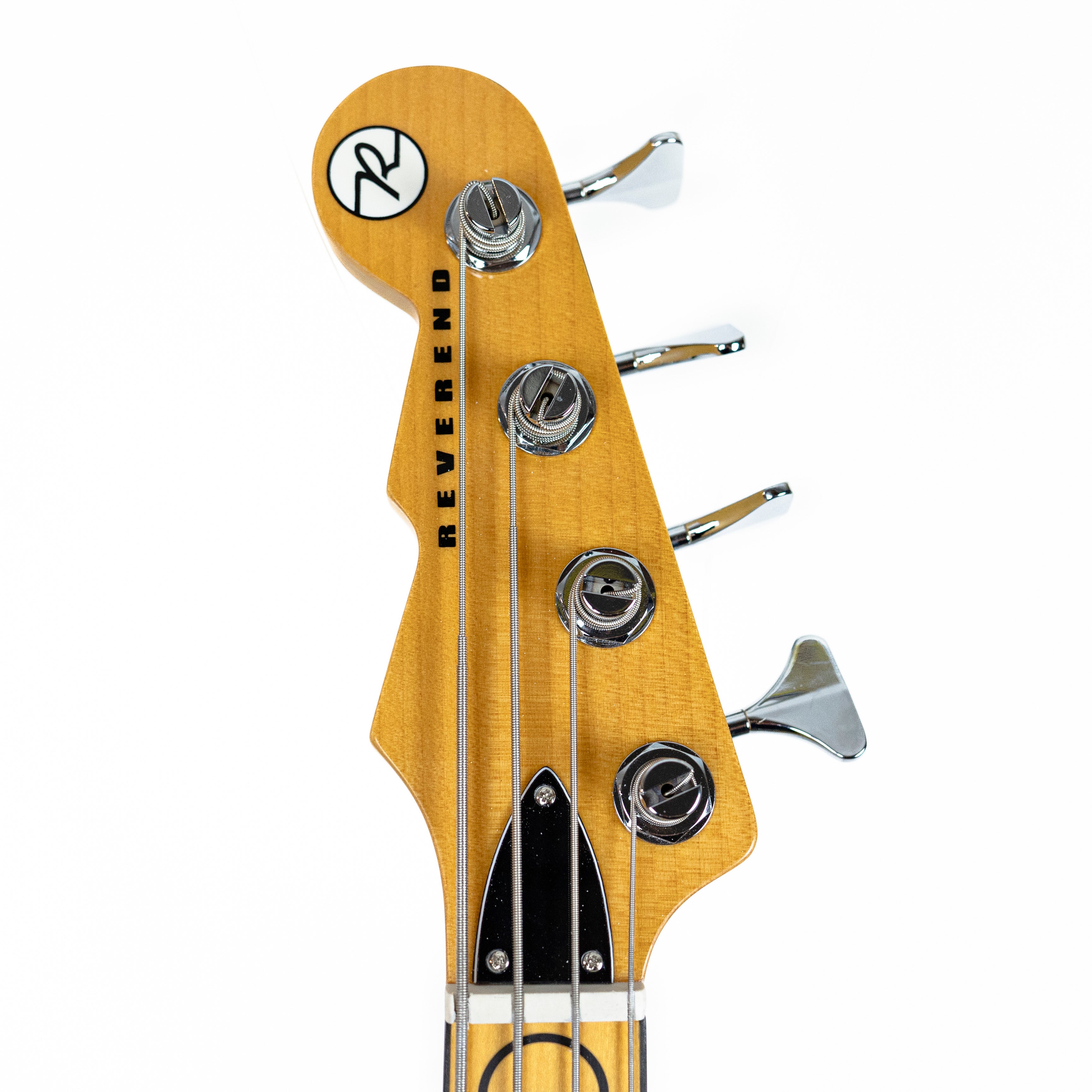 “The Reverend Basshouser Fatfish 32 is now even fatter. The super resonant semi-hollow body, sustain enhancing raised center section, and P-Blade/Thick Brick pickup combo are versatile, formidable, and thick. This bass sounds huge, even with the easy-playing medium scale neck. Dial in a unique sound with the blend knob. A reverse headstock, block inlays on the fretboard, and entwined circles inlay at the first fret all make this a bass that can further refine your unique artistic vision.”