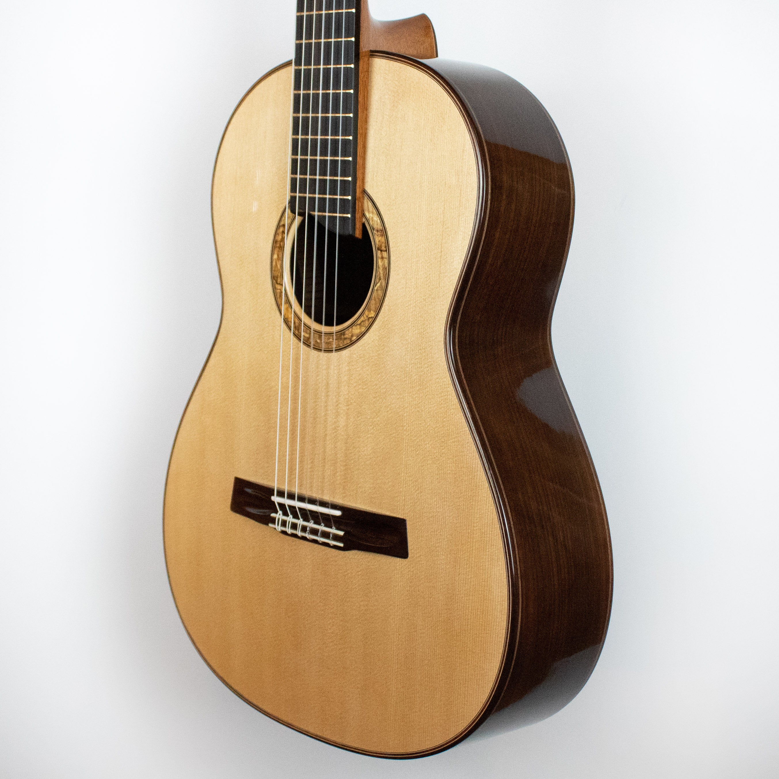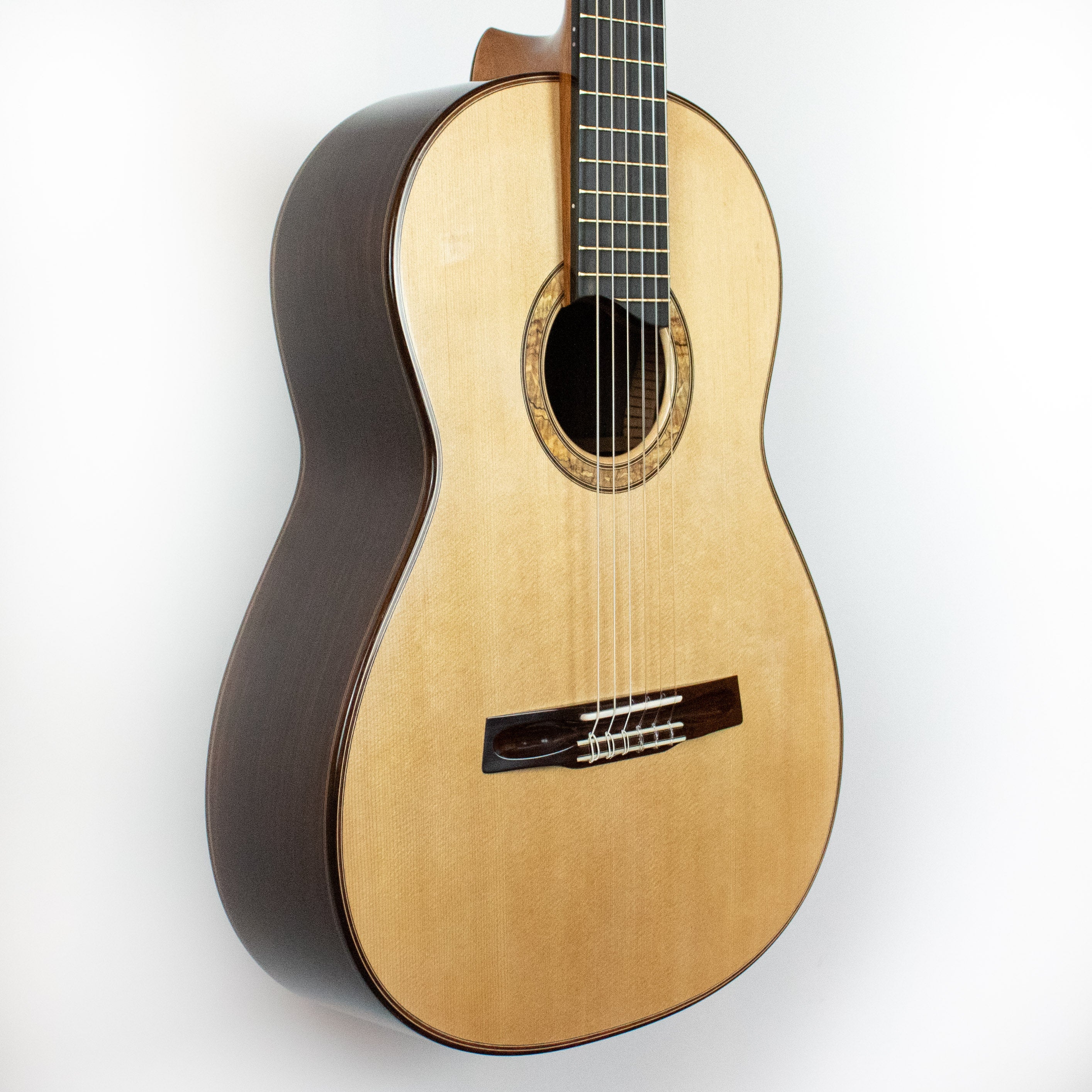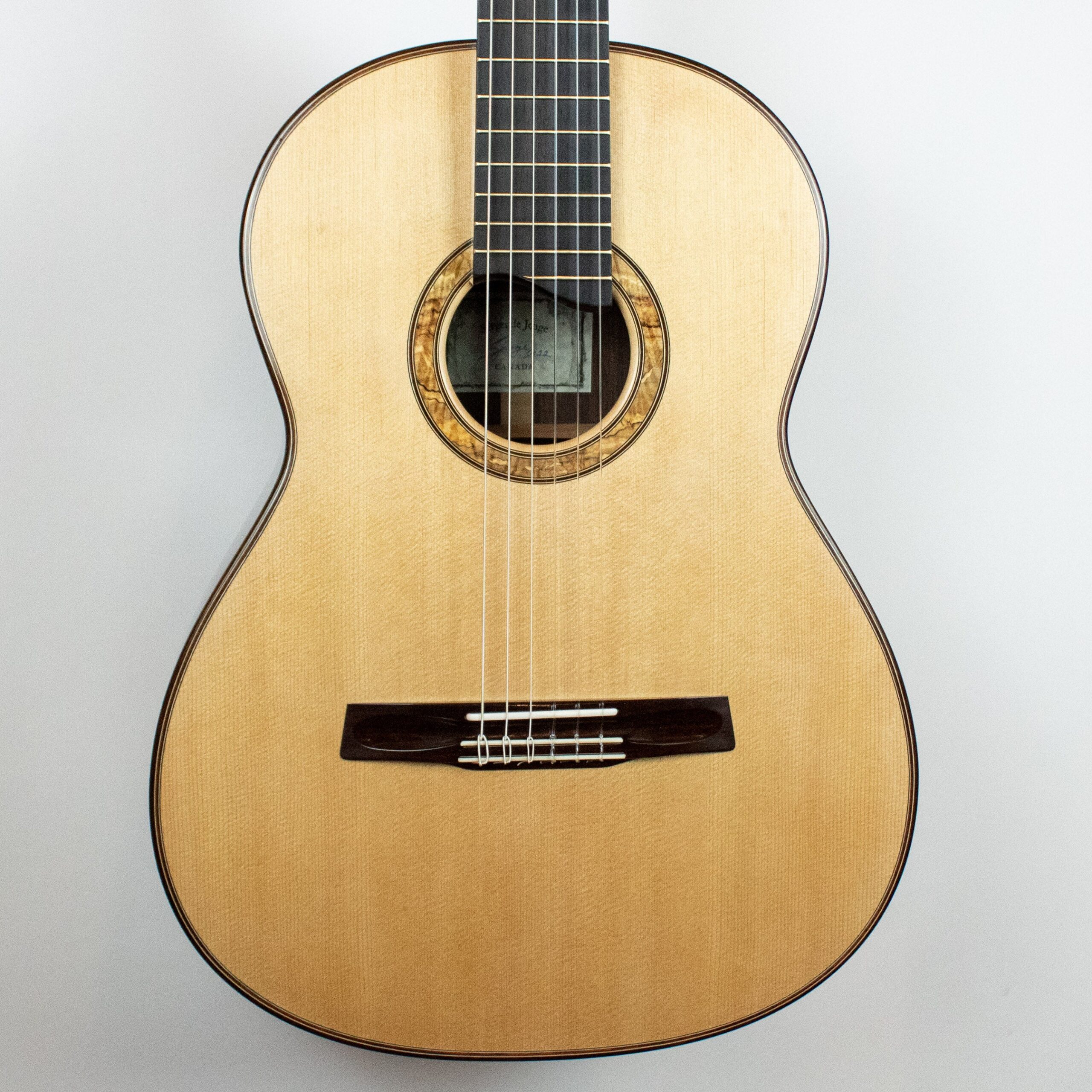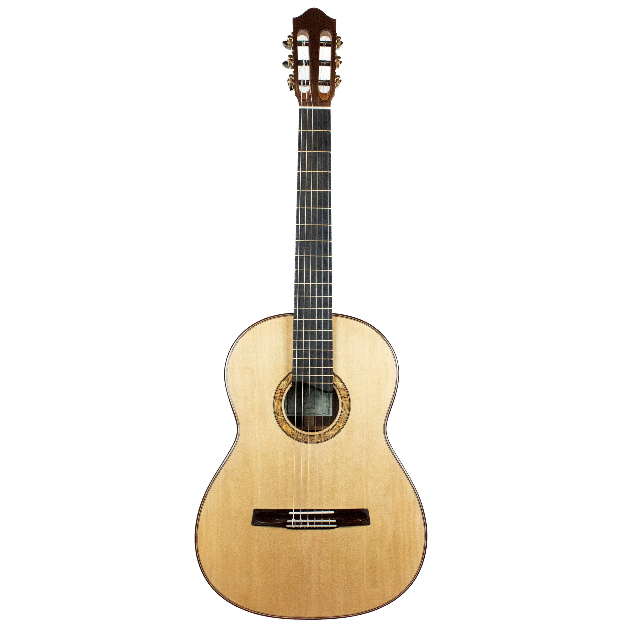 This is a fantastic classical guitar by Canadian luthier Sergei De Jonge, who has been building guitars nonstop since the ’90s and has earned his status as one of the world’s finest luthiers. This concert-sized standard classical of his has a 25 1/2″ scale length. Its tone is loud and vibrant and competes with the best. Comes with a tweed hardshell case.