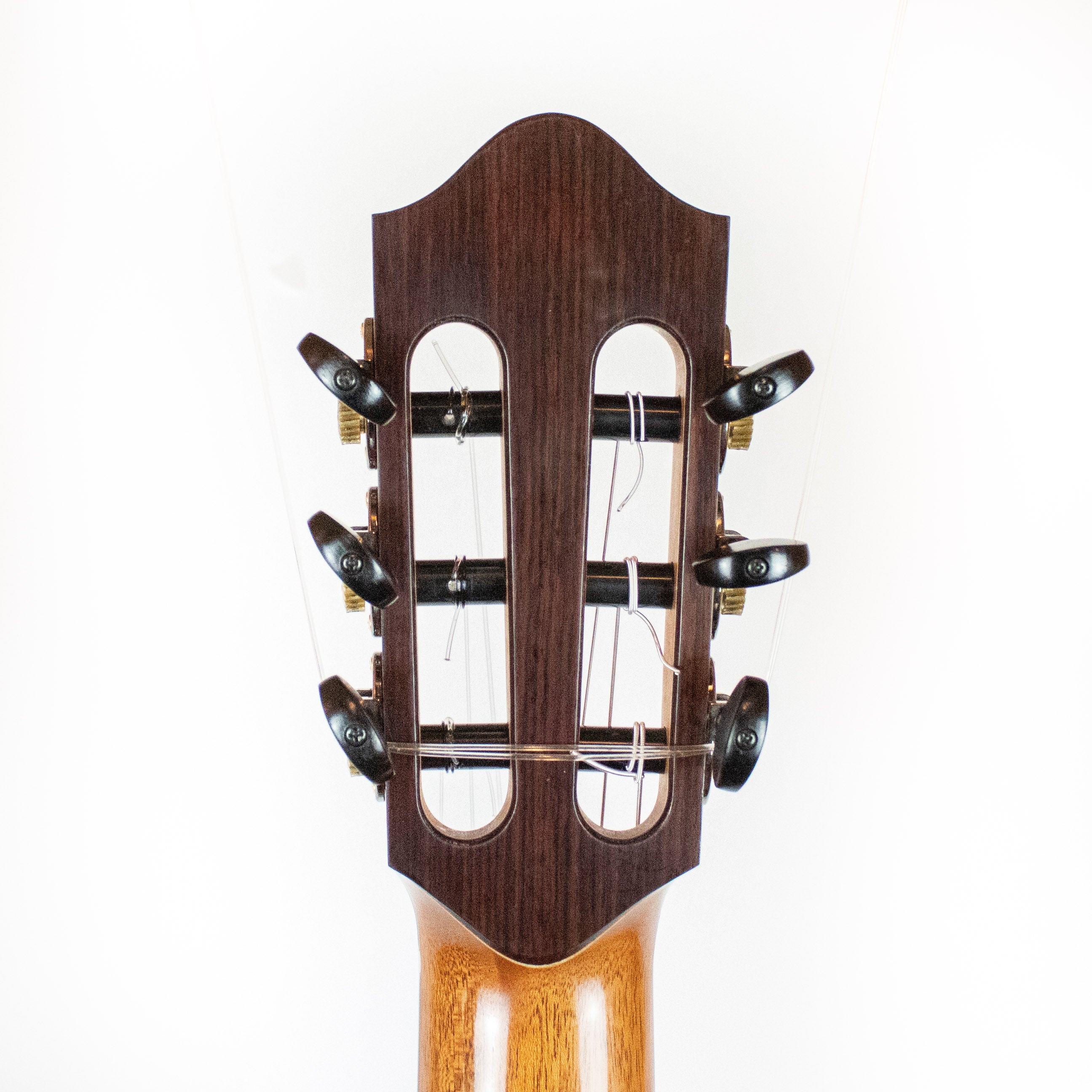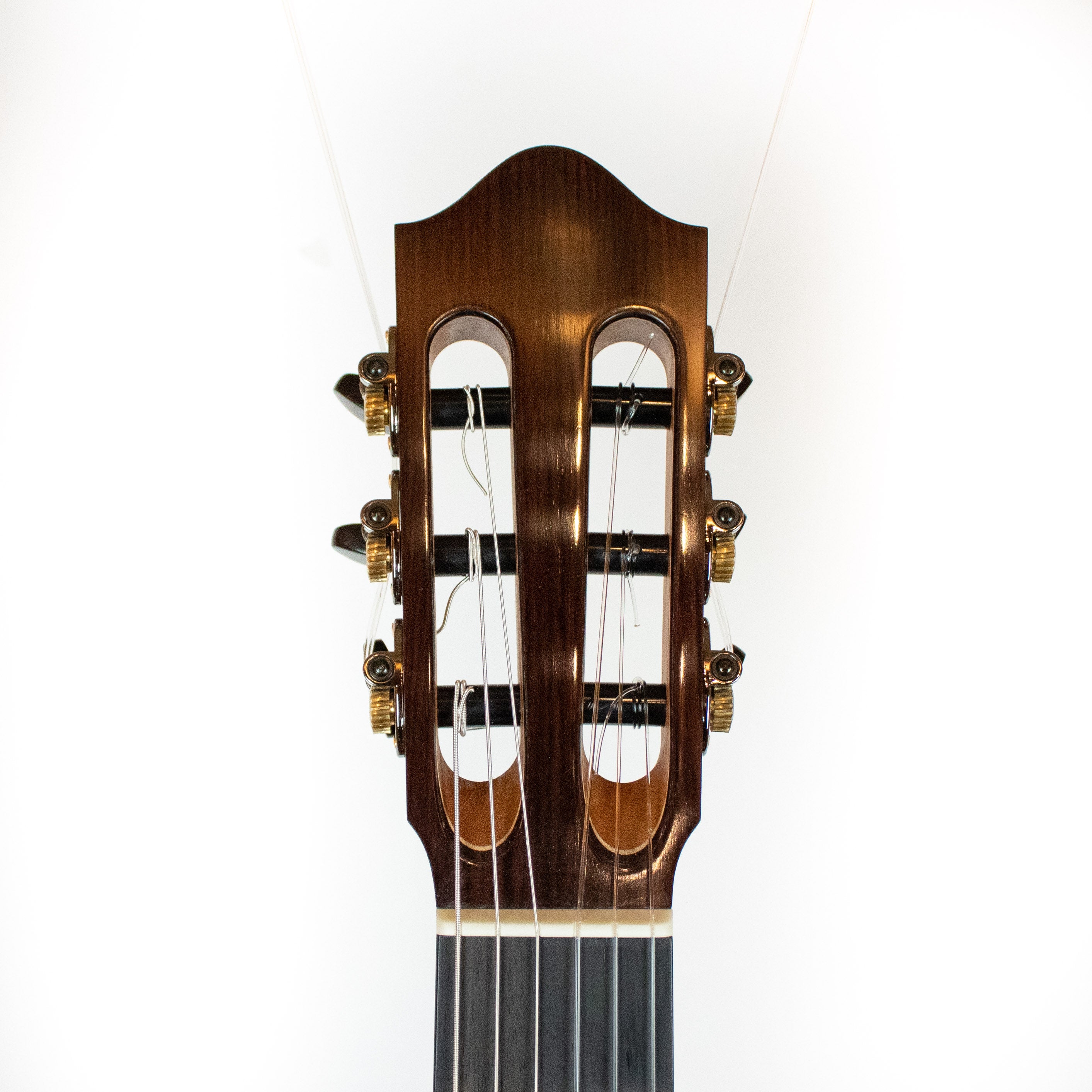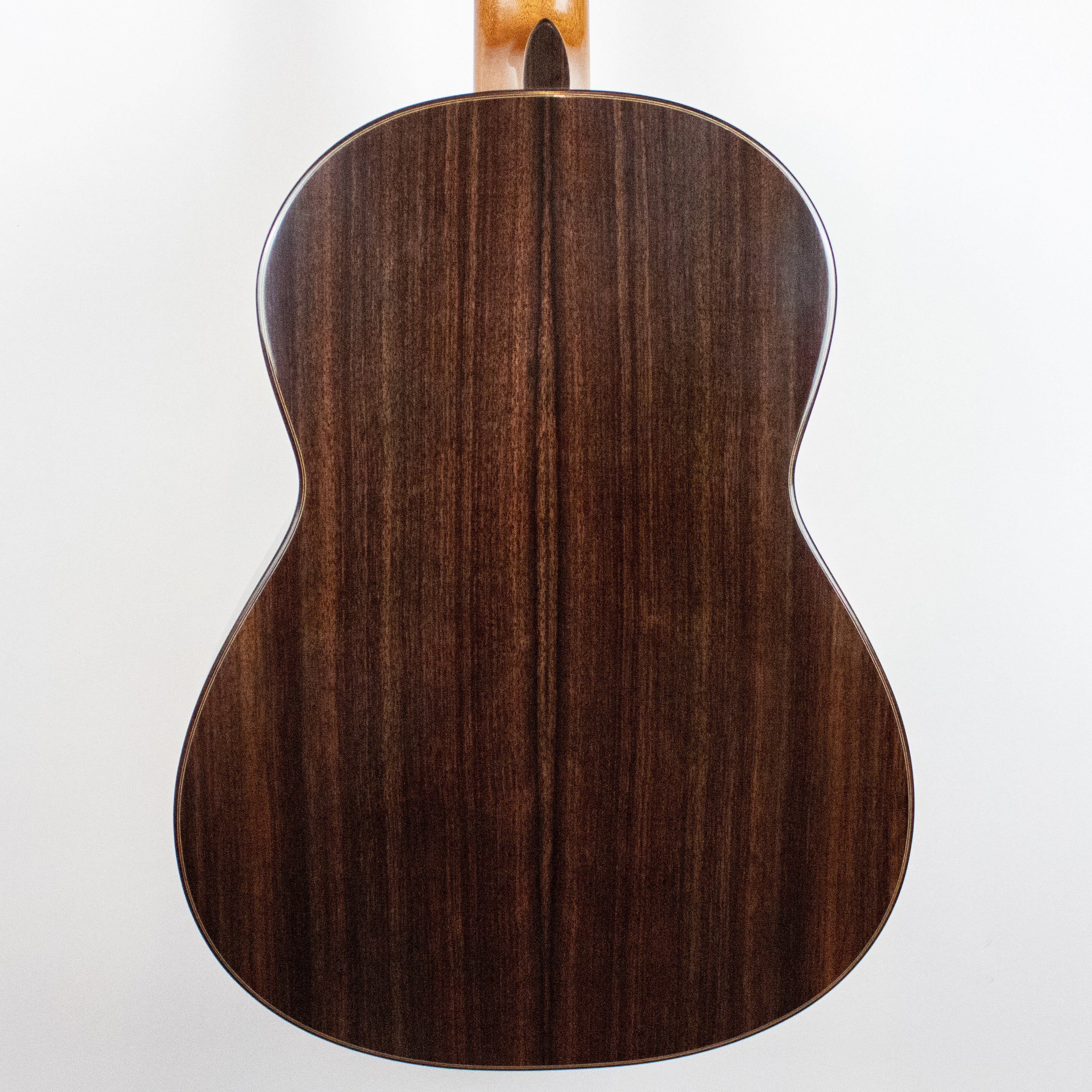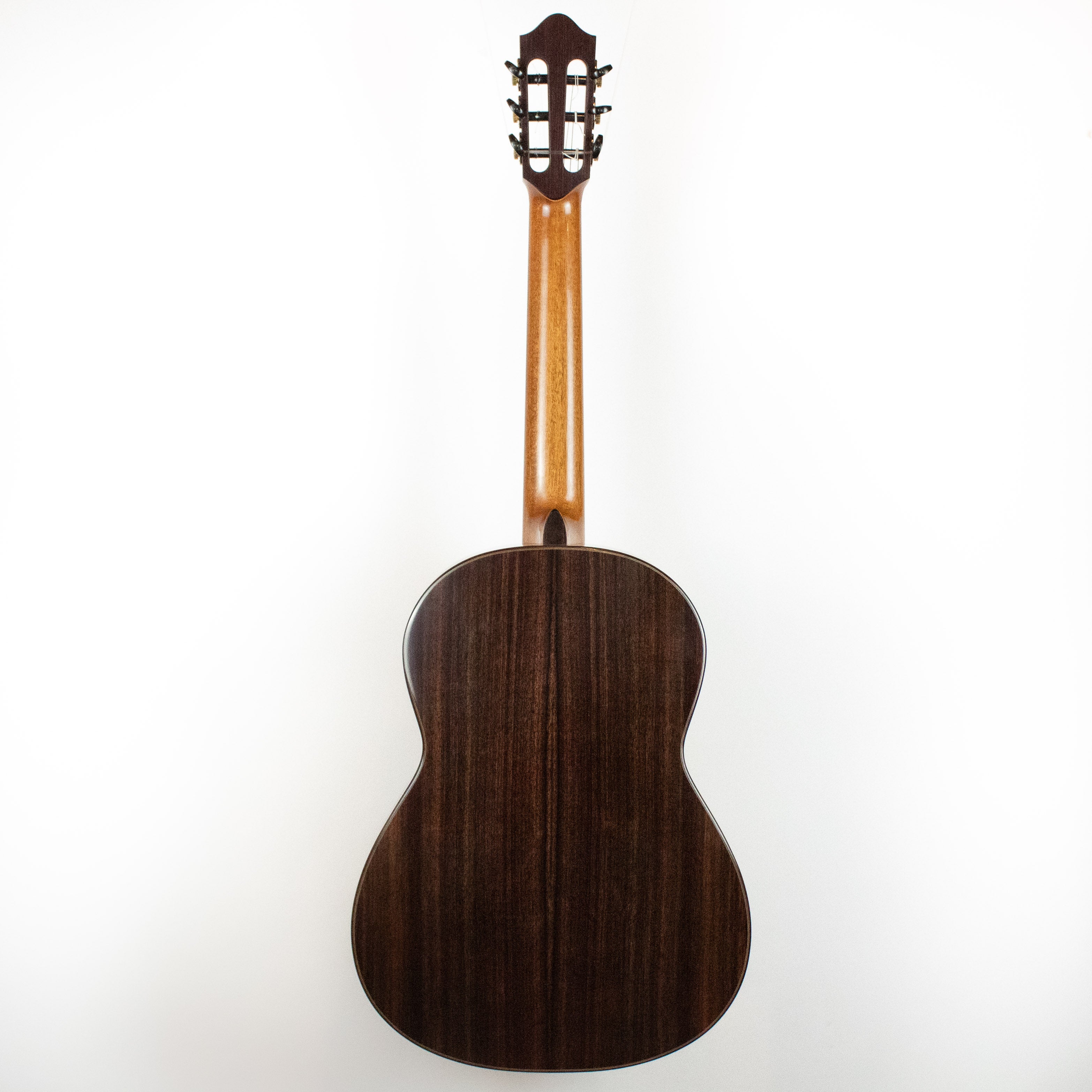 This is a fantastic classical guitar by Canadian luthier Sergei De Jonge, who has been building guitars nonstop since the ’90s and has earned his status as one of the world’s finest luthiers. This concert-sized standard classical of his has a 25 1/2″ scale length. Its tone is loud and vibrant and competes with the best. Comes with a tweed hardshell case.