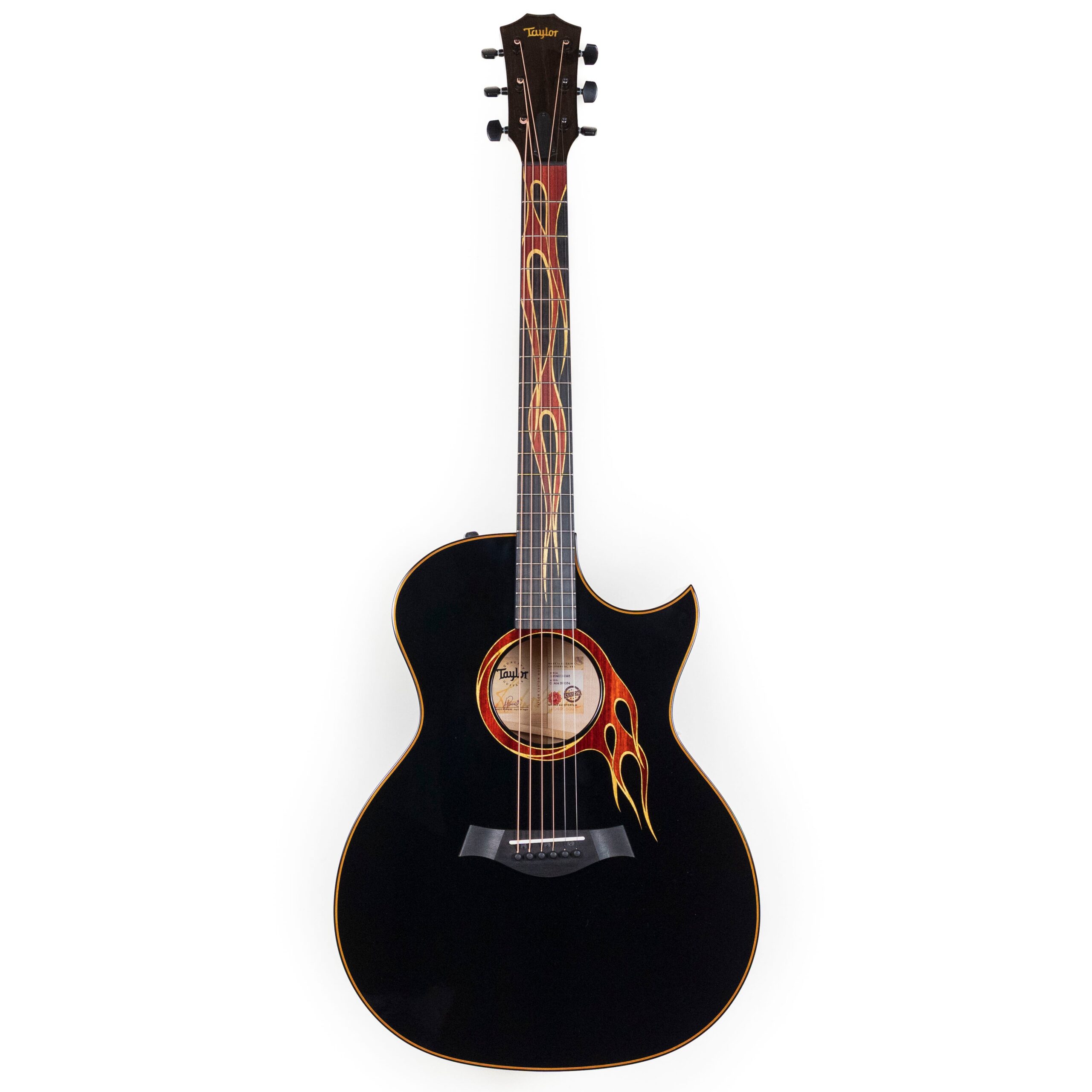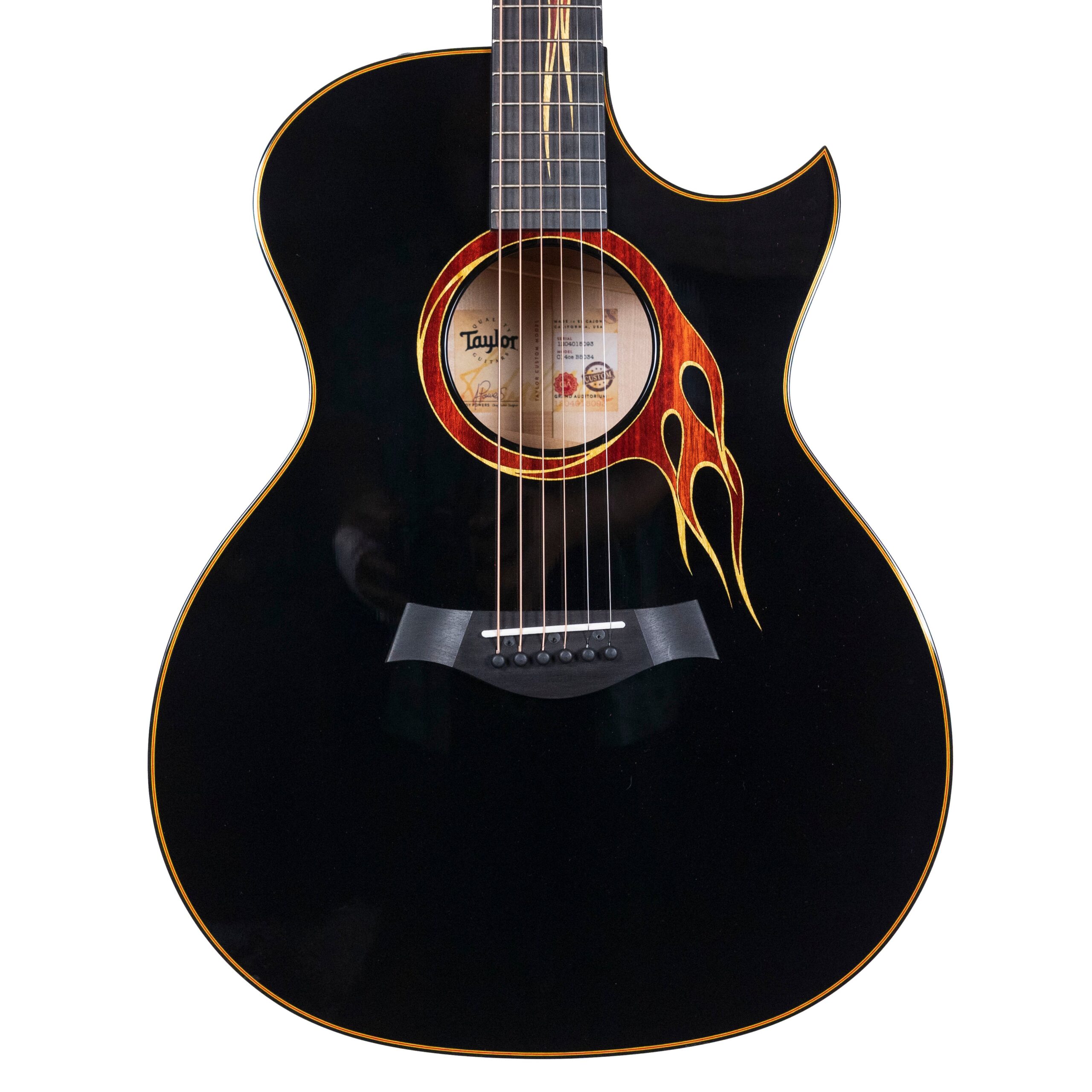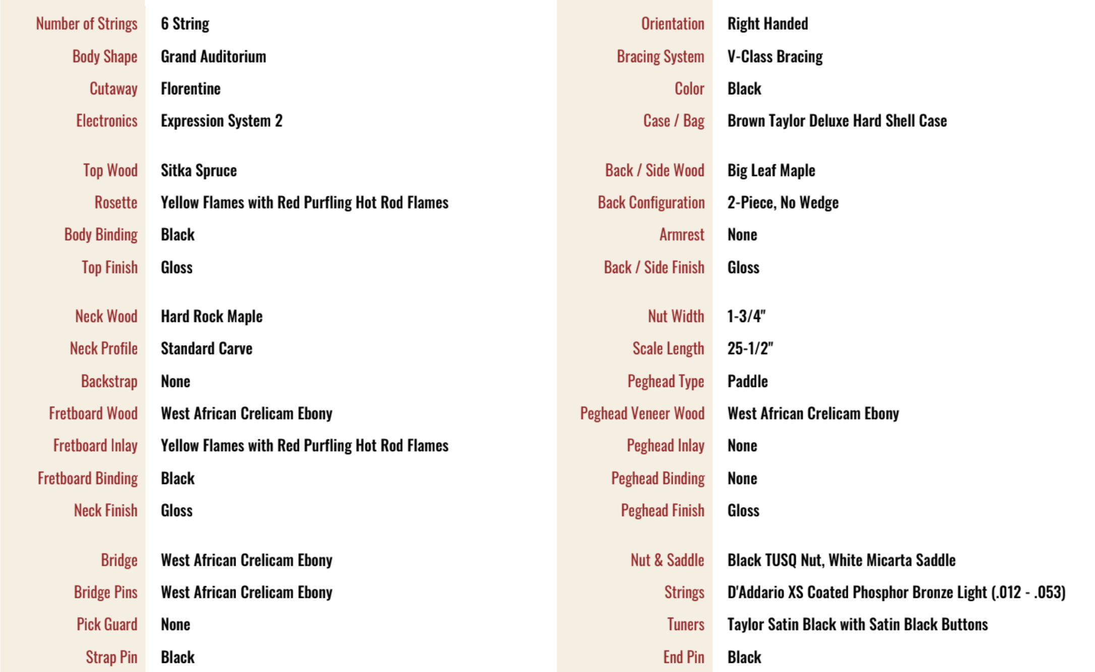 Specs of this specific model include a Grand Auditorium Honey Sunburst finish top, Sitka Spruce top and Maple back and sides, Taylor Satin Black tuners, Hot Rod Flames inlay, Ebony bridge pins, ES2 electronics, and a deluxe hardcase.