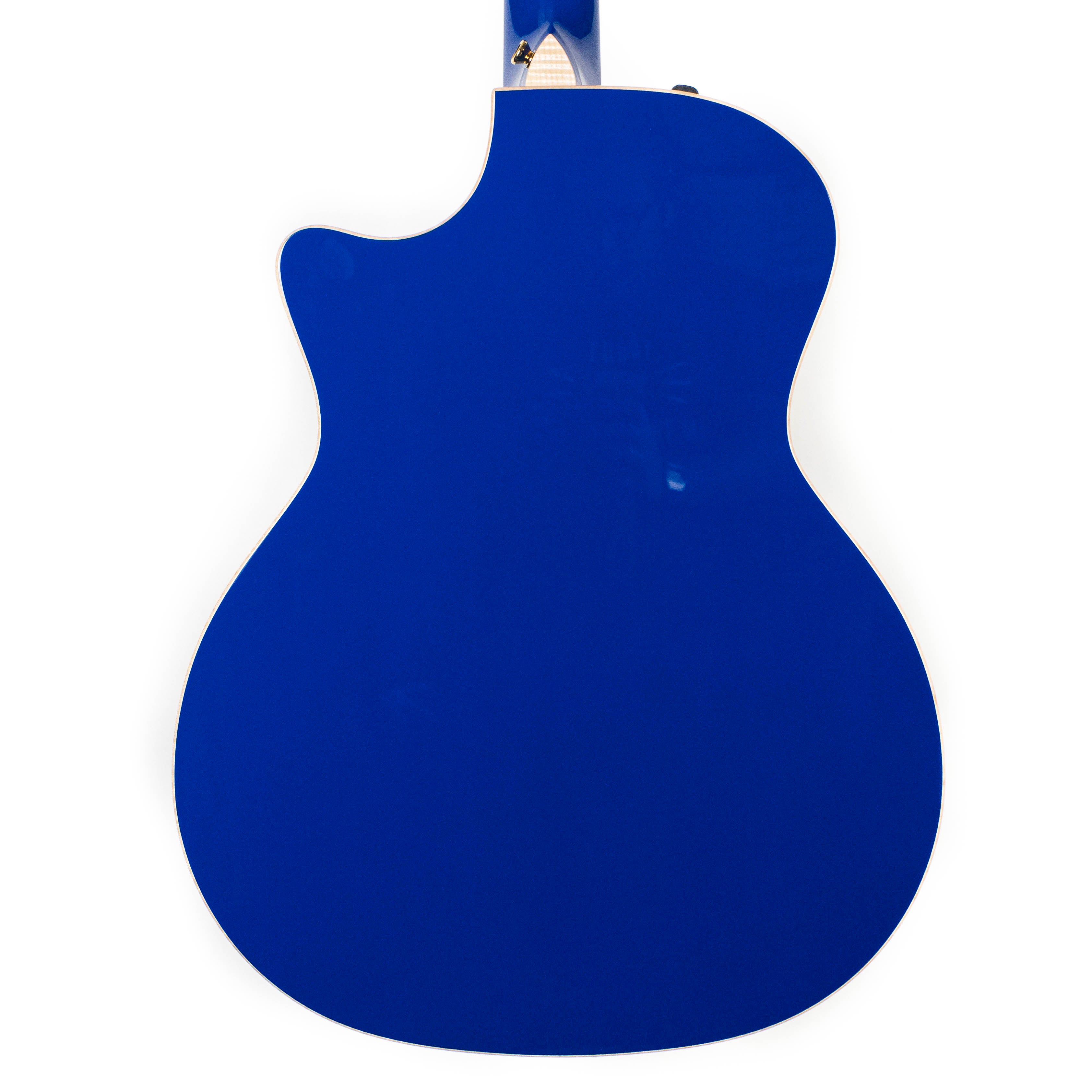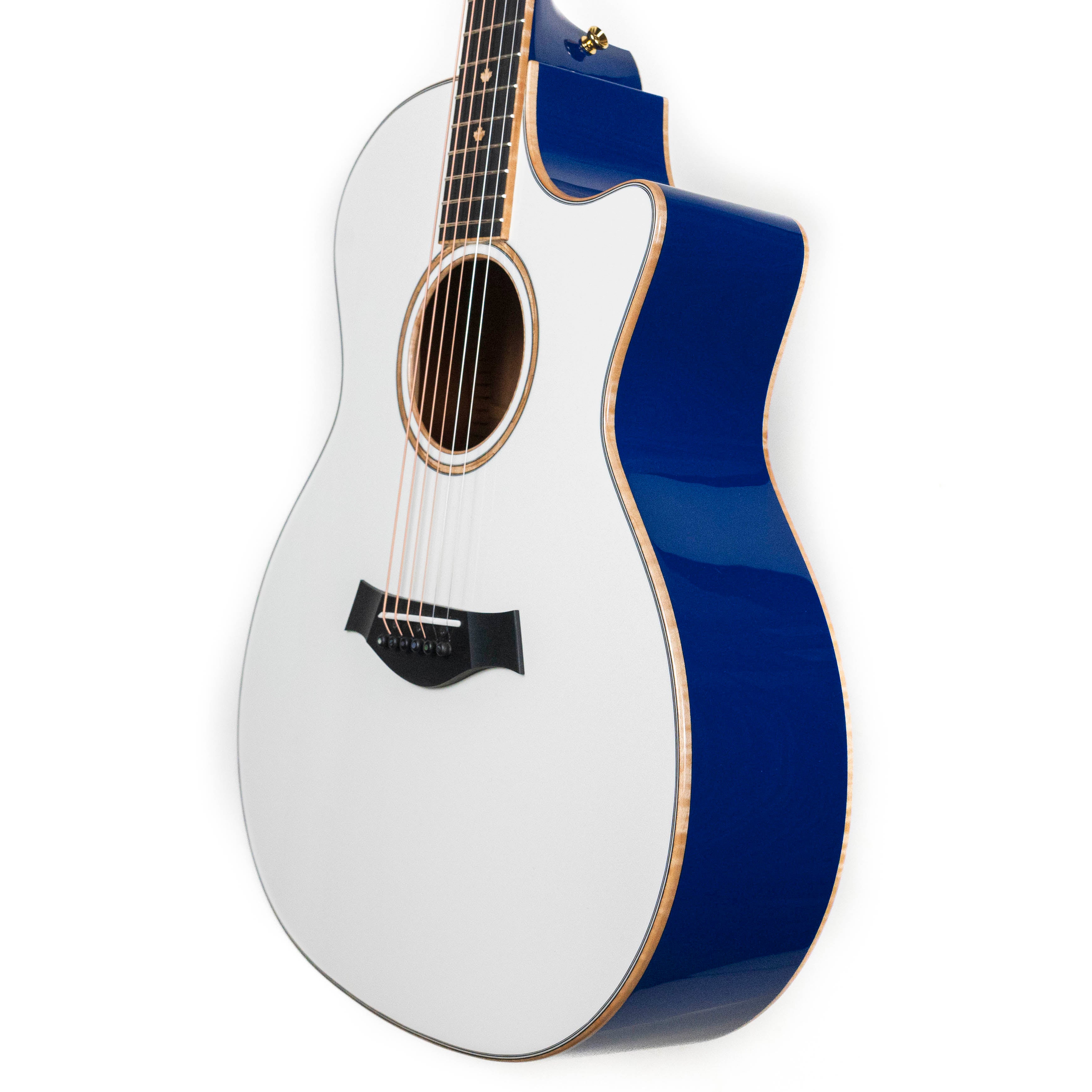 Specs of this specific model include a Grand Auditorium shape with Mahogany back and sides, Spruce top, Maple Leaf inlay all tied together with a unique white/navy finish. Includes a deluxe hardcase.