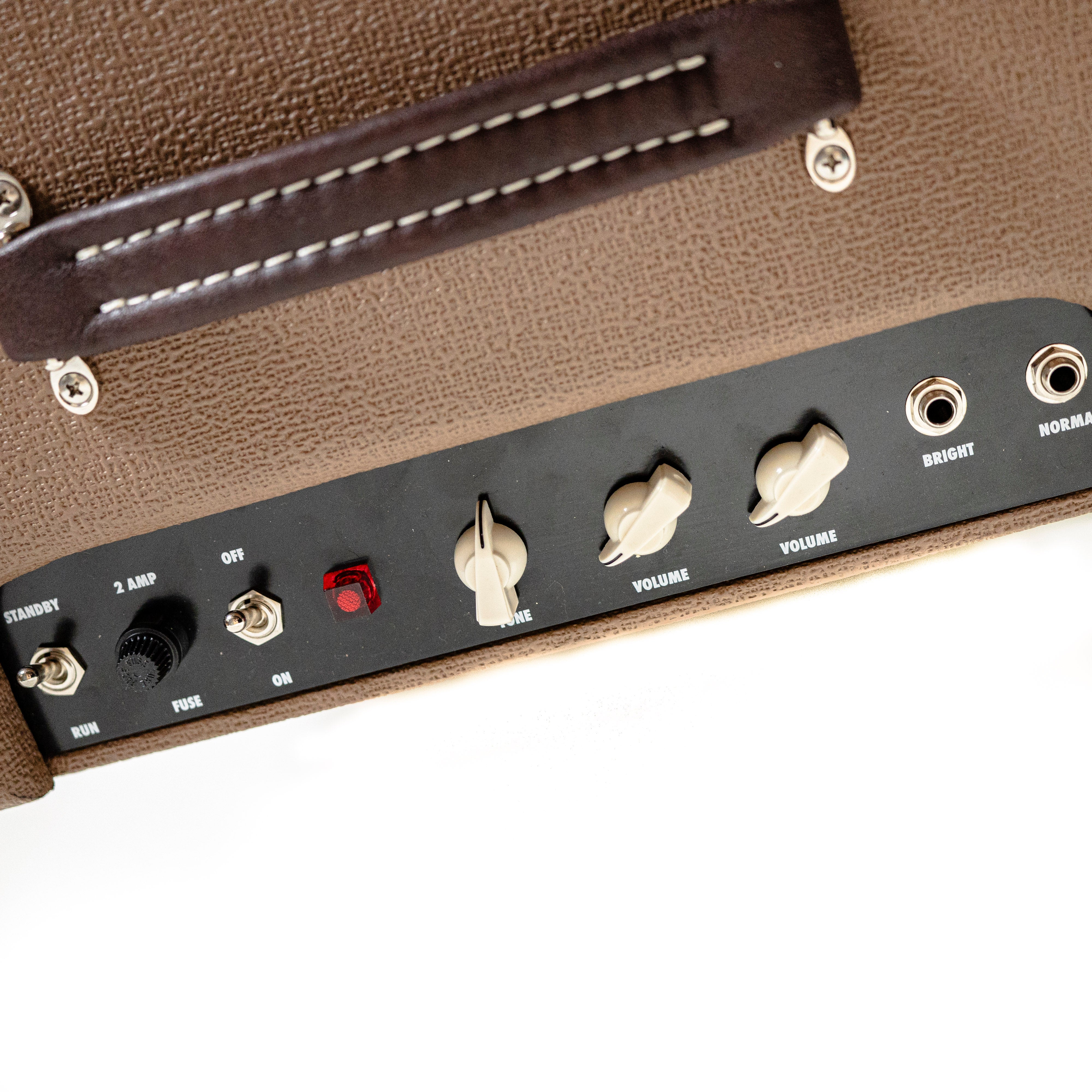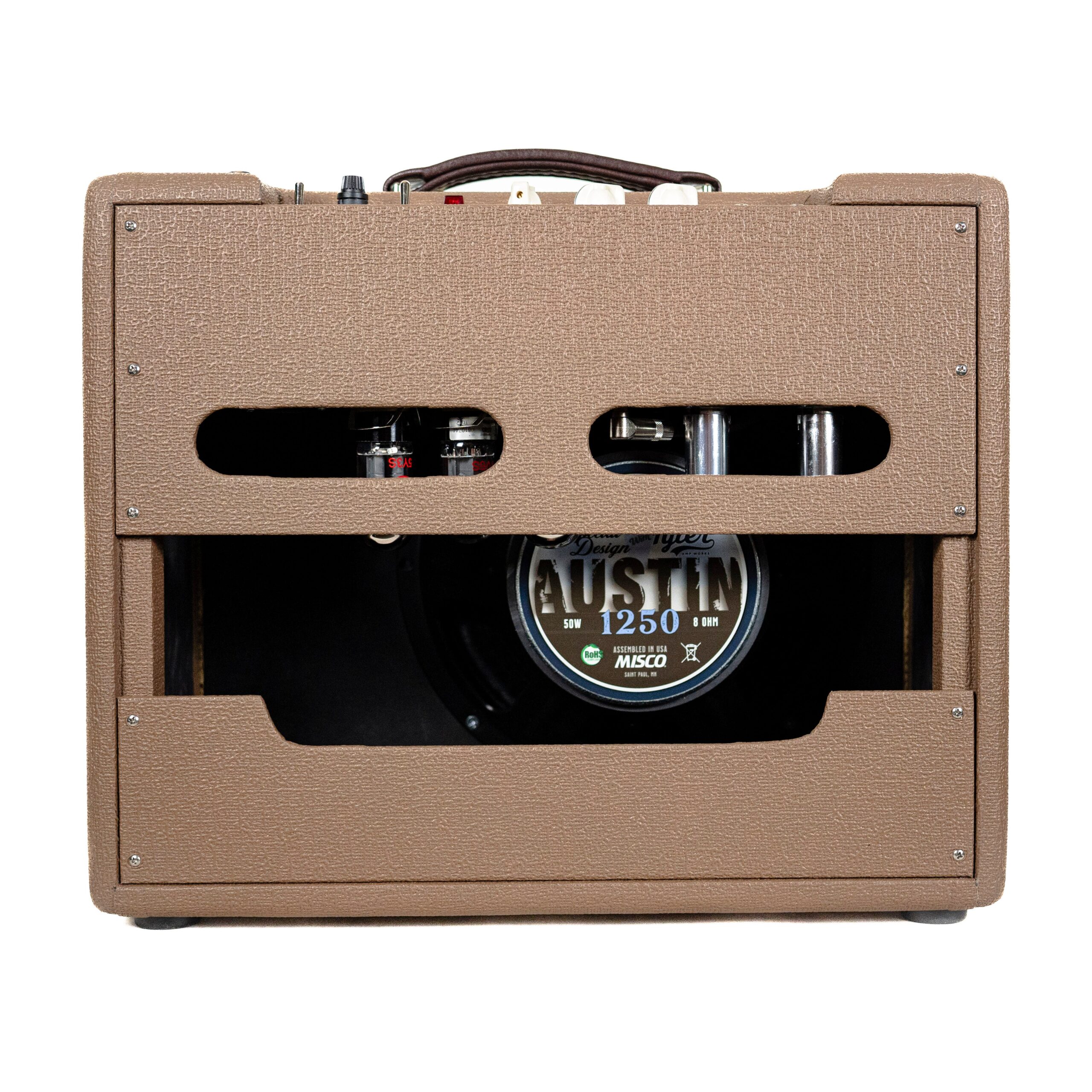 Mid 50’s 20 watt tweed-type circuit. 1-12 combo, straight up rock and roll. Equipped with a 12″ ToneSpeak Austin 1250 speaker, powered by 2 6V6s, 20W of power.