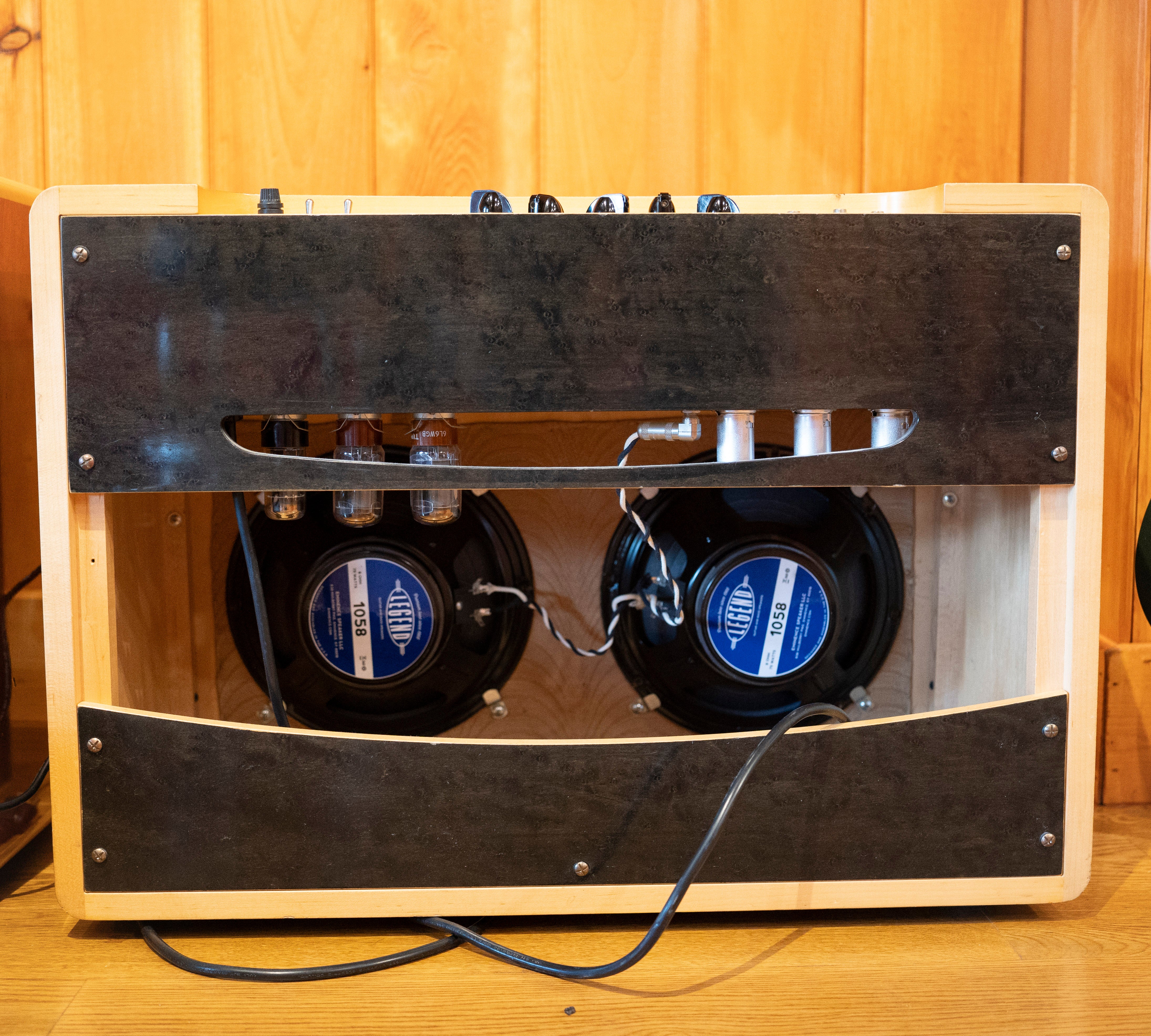 This amp is a circuit replica of a 1960’s Marshall Bluesbreaker, and has plenty of oomf, volume, and character. This thing has plenty of that great British tone. The cabinet is all solid wood. This amp features two Eminence Legend speakers.